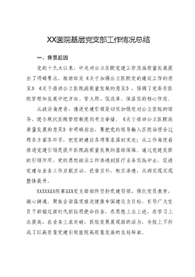 XX医院基层党支部工作情况总结一、背景起因党的十九大以来,中央对公立医院党建工作及高质量发展提出了明确要求,相继印发《关于加强公立医院党的建设工作的意见》《关于推动公立医院高质量发展的意见》,强调了党委在医院管理和发展中把方向、管大局、促改革、保落实的核心作用。从政治角度看,推进党建引领是切实加强党对公立医院的领导、健全现代医院管理制度的有力举措。《关于推动公立医院高质量发展的意见》中明确指出,要把党的领导融入医院治理全过程各方面各环节,把党的建设各项要求落到实处;从工作角度看推进党建引领是提升医院高质量发展的基础保障。通过党建发挥的引领作用,党的思想政治工作渗透到医疗业务实践中去,促进党建与业务工作互联互动、优势互补,相互渗透,从而实现实现整体提升。XXXXXXX院第XXX党支部始终坚持党建引领,强化党员教育,凝心铸魂,聚焦全面落实推进健康中国建设为目标,引导广大党员干部锚定新时代新征程使命任务,在思想上求上进,在学习上求提高,在业务上求突破,医院发展展现新的活力,全院上下形成了以高质量党建引领医院高质量发展的良好局面。二、主要做法(一)坚持党建引领,牢筑支部战斗堡垒。建强支部小阵地,发挥服务大作用。一是开展过硬支部建设。严格落实三会一课、谈心谈话等制度,每月开展一次主题党日活动;二是建强党建活动阵地。新建党员谈心室、党员学习室、活动室等党员学习阵地XX处,成为党员群众学习充电的好去处;三是党员带头示范。按照党员干部带头干、人民群众得实惠的原则,设立党员干部服务台XX个,实行党员干部轮班上台制方便及时掌握看病百姓诉求,解决实际困难,通过不断加强理论学习,创新工作思路,丰富活动载体,注重发挥党员干部带头示范作用,强化为民服务意识,切实抓好基层党建工作等措施,把党支部打造成为民服务的坚强堡垒,为医院的发展提供强力支撑和组织保障。(二)丰富教育形式,党员教育入味入心。一是集体学习有高度。组织党员干部深入学习贯彻XXXXXX有关重要讲话和批示指示精神,引导党员干部深刻领悟党的XX大关于党和国家事业发展大政方针和战略部署的历史逻辑、理论逻辑、实践逻辑,坚决拥护两个确立,坚决做到两个维护。二是党性教育有广度用活特色党员教育资源,采取现场教学、参观体验式教学模式,集中组织党员干部群众参观红色基地,开展以爱国主义、党性教育为主题的各类教育活动达10余场次,受教育党员干部200余人次进一步强化党员干部党性修养,筑牢理想信念压舱石。三是思想教育有深度。用好远程教育平台,组织党员积极参与学习强国、灯塔-在线自主学习,自觉用XXX新时代中国特色社会主义思想武装头脑、指导实践工作。组织优秀党员评选活动,把先进典型的做法和经验传授给广大党员干部,进一步提升党员的政治思想能力,凝聚党建促发展合力。(三)强化质量管理,理顺创新工作机制。党支部注重把党建工作与业务工作的紧密结合,以具体举措见成效,不断把党的政治优势、组织优势转化为创新优势、发展优势。简流程。制定院内《医疗质量安全质控标准》等一系列规章制度,规范了医保报销流程,最大限度解决老百姓看病难问题。抓作风。严格工作纪律,设立员工岗位职责,实现应岗在岗,确保不出现医疗事故风险。开展医药卫生领域不正之风专项整治行动,完善监督制约机制,切实维护广大人民群众的切身利益。提能力。以创建山东省中医药特色专科医院为抓手,积极探索XXXX服务模式深入开展中医药文化推广,努力打造妇幼中医品牌。加强妇幼健康服务项目管理工作。推进护理建设,加强人才储备与培养,实施人才走出去战略,选派XXX名医务人员到上级医院进修,不断提升全院医疗服务水平。(四)提升服务水平,增强为民服务能力。党支部根据党员具体工作岗位,注重党建工作与实际工作的有效结合,抓实活动实践,通过了解群众需求,探索优化服务新渠道。一是开展诊疗云服务。通过云上妇幼平台与XXXX院建立远程会诊,远程彩超会诊,进一步提升服务品质,提高患者满意度、认可度。二是两癌筛查惠民生。加强与基层单位协作,增加两癌筛查项目,配备查体车,暖心服务送到群众家门口,完成两癌筛查XXXXX人次,超出既定目标XXX余人。三是优化医保服务流程。优化流程,实现医保业务即时办理,设立一站式综合服务结算窗口,服务内容涵盖10项结算业务,解决了过去百姓到处跑的劳累,让百姓体会到服务的暖心。四是活动送到群众身边开展义诊暖人心等系列活动,进一步拉进医院与群众的距离。三、工作成效(一)基层支部战斗堡垒作用进一步提升。党支部发挥了桥头堡作用,成为传播新政策、新技术、正能量的充电站。党员干部执行力、凝聚力和创造力进一步增强,为全院发展集聚了强大的正能量。支部连续两年被评为五星级党支部。(二)党员党性觉悟进一步增强。强化党员经常性教育,为基