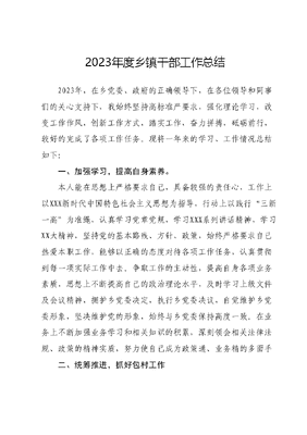 2023年度乡镇干部工作总结2023年,在乡党委、政府的正确领导下,在各位领导和同事们的关心支持下,我始终坚持高标准严要求,强化理论学习,改变工作作风,创新工作方式,踏实工作,奋力拼搏,砥砺前行,较好的完成了各项工作任务。现将一年来的学习、工作情况总结如下:一、加强学习,提高自身素养。本人能在思想上严格要求自己,具备较强的责任心,工作上以XXX新时代中国特色社会主义思想为指导,行动上以践行三新一高为准绳,认真学习党章党规,学习XXX系列讲话精神,学习XX大精神,坚持党的基本路线、方针、政策,始终严格要求自己热爱本职工作,能够以正确的态度对待各项工作任务,认真贯彻到每一项实际工作中去。争取工作的主动性,提高自身各项业务素质,思想上不断提高自己的政治理论水平,及时学习上级文件及会议精神,拥护乡党委决定,执行乡党委决议,自觉维护乡党委形象,坚决维护党的形象,始终与乡党委保持高度一致。在业务上不断加强业务学习和相关知识的积累,深刻领会相关法律法规、政策的精神实质,努力使自己成为政策通、业务精的多面手二、统筹推进,抓好包村工作在XX包村工作中,我服从领导安排、密切联系群众,真抓实干,确保全村各项工作顺利完成。一是抓好产业发展工作。我村提早安排,积极上户动员动员群众,今春完成露地菜种植87亩、果园间作365亩,落实51座钢架拱棚及20座日光温室蔬菜按期栽植注重示范引领,重点扶持8户设施蔬菜种殖户、10户平凉红牛养殖户率先发展种养殖产业,形成示范引领效应,带动全村农户积极发展特色产业。全村目前养殖肉牛135头,并及时对贫困户所养殖红牛全部兑现相关补助资金。同时积极和XX县人社局沟通衔接,争取培训项目,提高群众务工和养殖技能,全村共输转贫困劳动力361人。二是抓好村庄环境整治工作。积极响应全域无垃圾行动号召,下大力气改善我村人居环境。加快推进农村厕所革命,新改建卫生厕所27户,改造村级卫生厕所1处。按照县、乡安排部署,结合村情实际,组织村、组干部,动员群众积极参与历时三个多月,全村共拆除封堵危旧房屋、土箍窑22户70间。封堵窑洞507孔。组织保洁员对村域内环境卫生每周至少彻底清扫一次,对临时垃圾点垃圾定时清理,做到清洁卫生。组织群众对XX公路沿线林床进行整修、清理杂草、树干涂白等工作。村内环境实行专人负责制,分段包干,保洁员定期清洁,村上对保洁员所管辖的路段进行全方位的监督,定期检查监督考核。采取书写标语、悬挂横幅、发放彩页等方式,宣传环境整治有关政策和要求切实提升广大群众思想认识。三是抓好脱贫攻坚成果巩固工作。XX村现有建档立卡贫困户175户662人,截止目前已全部脱贫摘帽纳入脱贫监测户3户10人。经过多次入户走访,详细了解户内情况制定帮扶措施,完善一户一策,确保贫困人口切实实现不愁吃穿饮水安全,教育,医疗、住房有保障。按照党委政府安排,先后多次组织人员对村级资料、户内资料进行了修改完善、整理归档使村级脱贫攻坚资料更加规范。四是抓好其他惠民工作。督促配合村上完成日常业务工作,包括新农合、养老保险基金的收缴工作。三、注重实效,管好业务工作一年来,在应急管理局的业务指导下,我及时准确地上报相关报表、材料。一是积极开展《安全生产法》等相关法律法规的宣传教育,努力提高全乡人民安全生产意识。一年以来在全乡宣传4次,悬挂横幅6条,发放宣传单4500多份。二是加大安全检查力度,强化防范措施,把隐患消灭在萌芽状态。定期不定期的组织有关部门对道路交通安全、烟花爆竹安全、危化品安全、建筑安全、森林防火安全进行安全大检查,特别是在元旦、春节、五一、国庆、学校上学放学特殊期间前后在全乡开展安全生产大检查,检查侧重于查找安全隐患,并加大其整改力度,从而把安全隐患消灭在萌芽状态。四、存在问题和下一年工作打算回顾一年来的工作,虽然取得了较好的成绩,但与党委政府的要求和群众的期盼相比,仍然存在一些问题和不足,主要有:一是业务水平有待进一步提高;二是工作要求不高不严,履行职责还有差距;三是学习抓的不紧;四是开拓精神不强,在工作中安于现状,存在等靠思想。针对以上问题和不足,在今后的工作中,我将克服不足,不断进取,努力工作。一是加强政治理论学习、提高政策理论水平二是兢兢业业工作,踏踏实实尽责,干好自己的本职工作。三是务实苦干,开拓创新,认真完成乡党委、政府安排的各项工作任务。
