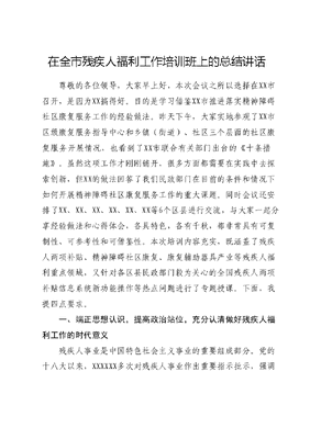 在全市残疾人福利工作培训班上的总结讲话尊敬的各位领导,大家早上好,本次会议之所以选择在XX市召开,是因为XX搞得好。目的是学习借鉴XX市推进落实精神障碍社区康复服务工作的经验做法。昨天下午,大家实地参观了XX市区级康复服务指导中心和乡镇(街道)、社区三个层面的社区康复服务开展情况,也看到了XX市联合有关部门出台的《十条措施》。虽然这项工作才刚刚铺开,很多方面都需要在实践中去探索创新,但XX的做法回答了我们民政部门在目前的条件和情况下如何开展精神障碍社区康复服务工作的重大课题。同时会议还安排了XX、XX、XX、XX、XX、XX等6个区县进行交流,与大家一起分享经验做法和心得体会,各具特色,各有千秋,都非常具有可复制性、可参考性和可借鉴性。本次培训内容充实,既涵盖了残疾人两项补贴、精神障碍社区康复、康复辅助器具产业等残疾人福利重点领域,又针对各区县民政部门较为关心的全国残疾人两项补贴信息系统新功能操作等热点问题进行了专题授课。下面,我提四点要求。一、端正思想认识,提高政治站位,充分认清做好残疾人福利工作的时代意义残疾人事业是中国特色社会主义事业的重要组成部分。党的十八大以来,XXXXXX多次对残疾人事业作出重要指示批示,强调残疾人是一个特殊困难的群体,需要格外关心、格外关注,提出全面建成小康社会,残疾人一个也不能少,深刻阐述了发展残疾人福利事业的重要意义。焦处讲了,2014年,中共中央办公厅印发的《党的十八届三中全会重要改革举措实施规划》(2014-2020)(中央〔2014〕46号)第258页任务事项,要求民政部门牵头制定关于加快精神障碍康复服务发展的意见,这是党的十八届三中全会赋予民政部的一项新任务,当然还包括牵头建立残疾人两项补贴制度、发展康复辅助器具产业等,深刻体现了民政部门在残疾人社会福利制度建设和残疾预防与康复等领域的政府职能作用。党的XX大报告明确全面建设社会主义现代化强国以中国式现代化全面推进中华民族伟大复兴的使命任务,明确提出完善残疾人社会保障制度和关爱服务体系,促进残疾人事业全面发展要求,为新时代残疾人福利事业发展指明了方向、提供了遵循。二、充分肯定成绩,盯准薄弱环节,切实扛起做好残疾人福利工作的政治责任。近年来,在各区县民政部门的共同努力下,残疾人福利工作取得长足进步。一是残疾人两项补贴制度逐步完善。全面落实残疾人两项补贴制度,建立补贴标准动态调整机制;残疾人两项补贴数据共享与动态复核机制逐步完善,精准化管理水平得到大幅度提升;跨省通办全程网办主动服务扶残助困一件事一次办等便民服务举措加快落实;及时足额发放两项补贴。截至2023年10月底,残疾人两项补贴制度惠及20.3万困难残疾人和29.4万重度残疾人,年发补贴4.05亿元,共受理跨省通办163件、全程网办3112例,主动服务率达98%以上,多次受到民政部社会事务司通报表扬,被市委巡视办列为全市示范典型。二是精神卫生福利服务体系加快推进。昨天上午,蓝星局长在推进会上已重点强调,应该说,我市精神卫生福利机构建设的短板空白还很多,民政部十三五就提出的要求支持每个所辖地级市至少有1所精神卫生福利机构,也就是说,我们区级行政级别的均有资格申报立项,得到中央资金支持。十四五初,我市申请的区不多。我们要坚持以中心城区为核心,辐射和带动安东北、安东南和主城新区四大区域协调发展,加快建设精神卫生福利机构。XX区、XX经开区精神卫生福利机构建设项目已列入国家十四五兜底线工程,目前XX区精神卫生福利中心项目已建成投用,XX经开区项目要加快推进。三是精神障碍社区康复服务全面展开。联合召开全市精康融合行动,安排部署任务,提出具体要求。38个区县出台具体实施方案,三年专项行动第一年服务覆盖年目标任务加速推进,取得初步成效。截至10月底,已挂牌建立1100余个精神障碍社区康复服务站点,11个市级联系指导点,为2.4万余名精神障碍患者提供了社区康复服务,300余人实现辅助性就业。四是康复辅助器具产业布局不断加速。我市建立XX市加快发展康复辅助器具产业联席会议制度,大力推进XX、XX、XX区成为国家第二批康复辅助器具产业综合创新试点,着力打造30分钟辅具社区租赁圈,推动康复辅助器具进家庭、进社区、进机构。目前3个区试点工作基本完成,处于迎接国家层面评估验收阶段。五是福康工程项目扎实稳步推进。持续实施2022-2023年度福康工程项目,通过政府购买服务,公开招标确定定点服务机构,扩大受助范围,增进残疾人福祉。赴西藏昌都开展天籁之音援藏项目,投入资金160万元,为藏民安装助听器220台,几年来累计投入540万元。上述成绩来之不易,但按照民政部部署和局党组要求,还有不少弱项。一是残疾人两项补贴在精准上有差