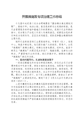 开展微腐败专项治理工作总结十九届中央纪委二次全会明确要求整治群众身边腐败问题。基础不牢,地动山摇。基层是烟草行业发展的根基,是行业管理服务的终端和基础工作的落脚点,是展示行业形象的窗口。把全面从严治党工作深入传递到基层,把管党治党的责任和压力逐级传导、层层压实到基层,是防范和整治微腐败的主要内容。烟草行业的基层部门主要是烟草站、专管所(队)、客服中心、物流中转站等,他们服务着广大的烟农、零售户,出现微腐败离群众最近,对群众危害也最深。近年来,基层干部员工微腐败问题呈现点多面广、隐蔽性强、危害性大的特点,严重影响行业的形象。我们多措并举,持续加大整治微腐败的工作力度。一、坚持问题导向,扎紧制度建设笼子一是我们根据近年来信访举报反映的,涉及行业员工在管理和服务中吃拿卡要、领取乡镇村各类补贴、向零售户低价购买紧俏卷烟、利用职务自便参与工程建设营利、接受烟农、零售户吃请、违规操办婚丧喜庆、在工作中优亲厚友等微腐败问题,通过多次自上而下、自下而上的摸底调研,排查出了47种微腐败主要表现形式,制定下发了《员工从业行为禁止性规定(试行)》。二是对廉政风险点和廉政风险防控制度实行动态管理。每年市局监督委员会都会组织各单位、各部门根据工作流程对廉政风险点进行排查,对廉政风险防控制度的运行情况进行分析总结,取消已消失的廉政风险点,增加新出现的廉政风险点,并相应废止和增加相对应的廉政风险防控制度,同时对防控不到位或防控措施不严密的廉政风险防控制度进行修订、补充和完善。三是进一步加大制度贯彻执行力度。把员工从业行为禁止性规定和廉政风险防控制度的贯彻落实情况列入年度考核的重要内容,要求各单位要运用专项检查、效能监察、明察暗访等方式加强监督检查,对发现的违反员工从业行为禁止性规定和廉政风险防控制度的典型案例,要认真分析问题产生的根源,及时在行业内进行通报。二、坚持责任落实,推进全面从严治党市局党组带头履行主体责任,组织专题分析会研究整治微腐败工作,协调解决工作中遇到的问题和困难,推动工作有效落实。主要领导认真履行第一责任人的职责,在每年纪检监察会议和党风廉政建设集体约谈会上亲自安排部署整治微腐败工作,亲自上党风廉政建设专题党课。分管领导落实一岗双责,认真抓好分管工作范围内的党风廉政建设,及时掌握动态,及时部署工作。同时把治理微腐败工作纳入全面从严治党责任书内容,一级一级签订责任状,一层一层传导压力,强化责任落实。三、坚持从严监督,重心下移力量下沉烟草员工虽然权力不大,但掌握一定的市场资源,微权力下的微腐败侵害的是群众最直接的利益。因此,必须持之以恒强化监督管理。近几年我们进一步加强对重点工作、重点领域和关键环节的监督检查力度。我们结合巡视巡察反馈问题、规范管理发现问题的整改工作,对烟叶种植收购计划合同管理、卷烟营销物料管理、物资采购、工程建设、廉政风险防控制度及员工从业行为禁止性规定落实情况开展效能监察和专项检查,下发整改意见书和检查通报,要求各单位进行限期整改,同时对整改情况进行回头看,确保各项整改任务落实到位。充分运用四种形态,根据信访初核、年度考核、各类监督检查和平时了解掌握的情况,充分运用提醒谈话、诫勉谈话、组织处理、纪律处分等处理措施,抓早抓小抓好预防,及早提醒制止党员干部中违反纪律的苗头性、倾向性问题,教育引导党员干部自觉遵守党章党规党纪。整治微腐败工作,不能单纯依靠纪检监察部门,而是要充分发挥职能监督、群众监督的作用,变单兵作战为兵团作战,形成纪检监督+职能监督+群众监督的立体化监督格局,进一步凝聚监督合力。我们每年年初召开监委会会议,各监委会部门汇报上年监督工作开展情况和单年工作计划,制定下发监委会工作要点,明确每年监督工作目标、制度建设计划和监督检查计划,各职能部门严格按照工作计划,认真履行党风廉政建设主体责任。同时我们通过公开廉政制度、廉政风险点、廉政承诺,公开举报电话、设立举报箱等途径,主动接受社会监督。四、坚持教育为先,营造风清气正氛围充分利用各种载体,强化廉政宣传教育,努力打造风清气正的氛围。一是结合职工大会、三会一课和各部门学习会等积极开展廉政教育,认真组织干部员工学习党的十九大和十九届中央纪委二次全会精神、XXXXXX新时代中国特色社会主义思想、党纪党规、法律法规和行业的相关制度规定,同时要求各基层部门负责人要逢会必讲廉政及作风问题,要落实好廉政十分钟,即在每次会前利用十分钟以上抓好员工从业行为禁止性规定、廉政风险防控制度以及廉政建设和作风建设的形势要求、规章制度学习;二是通过正反两方面的典型事例开展廉政教育。一方面通过组织廉政专题道德讲堂、我评议、我推荐身边好人、听取行业十佳员工巡回报告等活动,宣传身边人的廉政事迹,引导广大干部员工树立正确的世界观、人生观、价值观和权力观、地