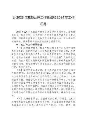 乡2023年政务公开工作总结和2024年工作思路2023年XX乡积极发挥政务公开宣传和桥梁作用,聚焦就业创业、社会保险、义务教育、医疗卫生等基层政务公开重点领域,不断提升信息发力度和为民为企服务能力,为全县转变政府职能、提高管理和服务效能发挥了重要作用。一、2023年工作开展情况(一)主动公开情况。我乡严格按照《中华人民共和国信息公开条例》规定的主动公开信息范围发布或更新信息,各渠道公开发布各类信息517条,包括各类政府文件、各项政府决策、各类会议安排、各类发展规划、三公经费及各项收支情况、民生工程的建设情况和涉农资金的补贴补助发放情况以及社会保险、社会救助等群众普遍关心、涉及切身利益的热点问题、焦点问题等。(二)处理申请公开情况。我乡通过政府门户网站主动公开信息25条,其中机构信息类占24%,规划计划类占12%,通知公告等其他信息占64%,公开内容以工作信文件为主。依申请公开方面,设置专人负责依申请公开的受理等环节,今年我乡收到书面依申请公开信息0条,网上依申请公开信息2条,已及时办结,办结率100%。无因政府信息公开申请行政复议、提起行政诉讼的情况。规范网站内容发布管理,及时处理我乡在政府信息公开网站发布内容的错别字等情况,确保信息的准确。(三)政府信息管理。为提升政务公开工作质量,XX乡政府信息公开工作由乡党委委员分管,办公室统筹安排政务信息收集并由专人负责,真正形成了机构、人员、职责、维护良性运行机制,保证全乡政府信息公开工作务实有序推进。(四)政府信息平台建设情况。一是依托县政府网站开展政府信息公开工作,及时更新《XX乡人民政府信息公开指南》《XX乡人民政府机构职责》,切实提升了政务公开工作的互动性和透明度。二是积极推进政务公开专区建设,在通办窗口和专业窗口设置政务公开公示牌,主动向群众公开各所工作人员、工作职责和公开办事指南。鼓励基层站所主动依法依规加大信息公开力度,并借助政府门户网站、政务新媒体线上线下齐发力,进一步推动基层办事服务公开标准化规范化向农村延伸,实现利企便民服务零距离。(五)监督保障情况。一方面建立信息报送、发布工作机制,明确所有需要通过网站发布的信息必须填写《信息发布审批单》,按照审批程序严格信息发布工作,稳步提升信息发布工作质效。另一方面积极畅通渠道,广泛接受社会监督,及时回复社会关切,充分发挥社会监督作用。二、存在问题2023年,我乡在信息公开方面做了大量工作,取得了一定成效,但仍存在公开内容、公开标准、公开时效等方面的标准还不够高、内容还不够全面、信息更新还不够及时等问题。下一步,我乡将努力加以改进和加强。三、2024年工作思路2024年,我乡将全面贯彻党的XX大精神,认真贯彻落实中央和省委、市委、县委关于全面推进政务公开工作决策部署,坚持以公开促落实、以公开促规范、以公开促服务的宗旨,以高度的政治责任感和务实严谨的工作作风,不断提高政务公开标准化、规范化水平,使政务公开工作迈上新台阶。一是认真梳理细化政府信息栏目。做到应公开尽公开进一步扩大公开内容,以社会需求为导向,选择公开民众关注度高的信息,提升政务公开内容的可读性和务实性。二是进一步拓宽信息公开途径。通过平阳县政府门户网站水墨青街微信公众号等多种方式加大宣传力度,进一步细化信息公开工作流程,拓宽公开渠道,确保操作简便明了,利于查找。三是加强对信息公开工作人员的业务培训。加强相关工作人员对《中华人民共和国政府信息公开条例》《关于全面推进政务公开工作的意见》等纲领性文件的学习,增强工作人员政务主动公开意识,提高干部对政府信息的采集、编辑能力,努力提高政府信息公开工作水平。