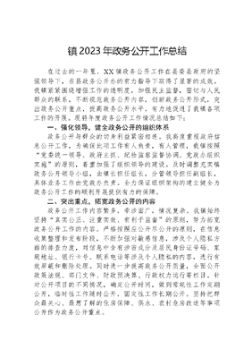 镇2023年政务公开工作总结在过去的一年里,XX镇政务公开工作在县委县政府的坚强领导下,在县政务公开办的有力指导下取得了显著的成效。我镇紧紧围绕增强工作的透明度,加强民主监督,密切与人民群众的联系,不断规范政务公开内容,创新政务公开形式,突出政务公开重点,提高政务公开水平,有力地促进了我镇各项工作的开展。现将年度政务公开工作情况总结如下:一、强化领导,健全政务公开的组织体系政务公开与群众的切身利益紧密相连。我高度重视政府信息公开工作,为确保此项工作有人负责,有人管理,我镇按照党委统一领导、政府主抓、纪检监察监督协调、党政办组织实施的原则,着重加强了组织领导的建设。及时调整充实镇政务公开领导小组,由镇长担任组长,分管领导担任副组长,具体业务工作由党政办负责。全力保证组织架构的建立健全为政务公开工作的顺利开展提供有力的保障。二、突出重点,拓宽政务公开的内容政务公开工作内容繁多,牵涉面广,情况复杂。我镇始终坚持真实公正、注重实效、有利于监督的原则,努力拓宽政务公开工作的内容。严格按照应公开尽公开的原则,在信息收集整理和发布阶段,不断加强对敏感信息,涉及个人隐私方面的排查力度,对信息中含有涉密成分及居民身份证号码、家庭地址、银行卡号、联系电话等涉及个人隐私的内容,进行有效屏蔽和删除处理。同时进一步提高政务公开质量,全面公开政策法规、部门文件、财政预决算、行政权力运行等栏目。针对公开项目的不同情况,确定公开时间,做到常规性工作定期公开,临时性工作随时公开,固定性工作长期公开。坚持把群众最关心、最想了解的住房保障、供水、农村危房改造等事项公开作为政务公开重点。三、严格考核监督,确保公开质量2023年以来严格对照省、市、县政务公开办过程性测评和测评反馈情况,全面排查梳理问题,及时整改完善提升,同时报送整改清单和整改报告,积极参与业务培训,提高政治站位,充分认识政务公开工作的重要性;注重学以致用,推动政务公开走深走实;强化法治意识,保证政务公开依法依规。四、不足之处个别政务信息发布出现错别字、错别词,信息发布质量有待提高。信息公开的内容不够丰富,公开的形式较为单一,公开的频率有所欠缺。政策解读形式不够丰富,缺少动漫、视频等通俗易懂形式的解读。工作人员对政务公开工作的重要性和必要性认识不足,机关各科室工作合力未形成。五、下一步改进措施一是加强组织领导。自上而下加大对政务公开工作的重视程度,形成有效的监督反馈机制。同时加强政务公开队伍建设,学习上级文件精神,培养工作人员的责任心;加强政务公开工作人员培训,提高工作人员业务能力。二是主动公开信息。遵循应公开尽公开原则,按县政务公开办指导要求发布有效信息。三是及时发布信息。按月制定工作提示单,要求各部门按时间节点签署三审表报送至镇党政办公室统一公开。积极整改省、市、县政务公开办反馈的整改问题,针对出现的如疫情、防溺水、安全生产等民生热点问题快速制作、发布有效信息。充分保障群众的知情权,不断提升XX镇政务公开水平,提高政府公信力、管理能力。2024年,我镇将持续深化政务公开工作,推进政务公开工作走深走实。一是严格按照上级关于政务公开工作的总体要求,进一步扩展信息公开内容,突出重点、热点和难点问题,特别是基层和群众关心、涉及基层和群众利益的事项,做到及时公开、及时解读,让群众听得懂信得过;二是强化业务学习。通过多种形式组织干部学习政务公开内容,提升信息公开工作人员业务能力水平,进一步规范政府信息公开的管理,提升信息发布质量。继续坚持和完善政务公开制度,提高政务公开的质量和效果,让公众更好地了解政府的工作,促进政府与公众的良性互动。
