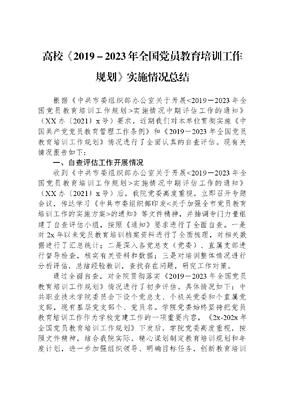 高校《2019-2023年全国党员教育培训工作规划》实施情况总结根据《中共市委组织部办公室关于开展<2019-2023年全国党员教育培训工作规划>实施情况中期评估工作的通知》(XX办〔2021〕x号)要求,近期我们对本单位贯彻实施《中国共产党党员教育管理工作条例》和《2019-2023年全国党员教育培训工作规划》情况进行了全面认真的自查评估。现有关情况报告如下:一、自查评估工作开展情况收到《中共市委组织部办公室关于开展<2019-2023年全国党员教育培训工作规划>实施情况中期评估工作的通知》(XX办〔2021〕x号)后,我院党委高度重视,立即召开专题会议,传达学习《中共市委组织部印发<关于加强全市党员教育培训工作的实施方案>的通知》等文件精神,并抽调专门力量组建了自查评估小组,按照《通知》要求进行了全面自查。一是对2x年以来党员教育培训档案资料进行了全面梳理,对相关数据进行了汇总统计;二是深入各党总支(党委)、直属支部进行督导检查,核实有关资料和数据;三是对培训整体情况进行分析评估,总结经验教训,查找存在问题,研究工作对策。通过全面自查,对全院贯彻落实《2019-2023年全国党员教育培训工作规划》情况进行了初步评估。具体情况如下:中共职业技术学院委员会下设个党总支、个机关党委和个直属党支部,现有基层党支部个、党员名。学院党委始终坚持把党员教育培训工作作为学校党建工作的一项重要内容,《2x-202x年全国党员教育培训工作规划》下发后,学院党委高度重视,按照文件精神,结合我院实际,精心谋划制定教育培训规划和年度计划,进一步加强组织领导、明确目标任务,创新教育培训手段,提高了教育培训效果。各基层党组织认真履行工作职责,逐级成立组织机构,制定教育培训计划,深入开展学习型党组织创建活动,切实抓好抓实党员日常教育,党员教育培训工作实现了制度化、规范化、常态化。二、贯彻实施《规划》的主要做法(一)改进教育培训形式,深化教育培训效果全院各级党组织根据党员不同类型特点,拓宽培训渠道,创新培训手段,采取多种形式开展教育培训,有力地提升了教育培训效果。一是运用在线学习平台开展党员干部轮训。开设了党员干部在线学习平台,依托国家教育行政学院、干部网络学院等优质在线课程资源,组织党员在线学习党的理论、进行业务学习培训。二是运用手机开展党员全员培训。组织全体党员注册共产党员网和学习强国,认真学习推送的学习内容。学院党委和基层党组织也开设了、各支部组建了学习小组群,及时向党员发送学习内容、开展学习讨论交流。三是坚持多措并举开展集中培训。认真落实三会一课制度,积极开展主题党日活动,督导各级党组织书记定期为党员、干部上党课;根据党委培训计划,每年暑期开展党员干部集中培训;根据不忘初心、牢记使命主题教育和党史学习教育需要,分批安排党员干部外出参加学习培训。四是坚持每周二开展政治理论学习。以支部为单位,组织党员教师认真学习XXX新时代中国特色社会主义思想和党委规定的各类政治理论学习内容。五是充分发挥党校作用开展党员培训。加强学院党建工作,调整完善组织机构,加强兼职师资队伍、教学基础设施和教材建设,按计划认真组织实施党员培训、干部轮训、党务工作者培训,每年组织2-x期党员发展对象专题培训和新接收预备党员培训;加强各系分党校建设,积极开展入党积极分子培训。六是开展党务干部分类培训。每年利用暑假,对党组织书记进行集中培训,并积极组织新任基层党组织书记进行任职培训;根据工作需要,组织教师党支部书记双带头人培训x期,组织组织委员、宣传委员、纪检委员和专职组织员分类培训x期。七是组织党员干部积极参加上级培训。根据上级党委统一安排,组织学院领导班子成员和中层干部积极参加中央党校和省、市委党校组织的XXX新时代中国特色社会主义思想教育培训等各类专题培训,圆满完成了学习任务。(二)不断加大投入力度,为党员教育培训提供坚强保障一是加大经费投入力度。将党员教育培训经费纳入年度预算,在充分利用好上级党组织下发的基本党员教育教材的基础上,使用留存党费购买下发多批党员教育培训学习资料,有效保障了党员学习需要。二是加强党员教育培训师资队伍建设。充分发挥基层党务工作者在党员教育培训中的骨干作用,按照素质较高、数量适当、结构合理和专兼职结合的要求,建立由党校教师、总支书记、先进模范人物和领导干部等组成的党员教育师资队伍,有计划地开展好各级各类培训。三是加强党员教育培训阵地建设。个党总支(党委)、直属支部分别建立了标准化党员活动室,购置了电子化教学设备和党员教育图书音像资料,用于党员学习教育,做到了场地达标、设施齐备、资料丰富,为基层党组织开展党员教育培训提供了坚强保障。(三)完善制度体系,构建党员教育培训长效机制在加强党员教育培训工作中,针对基层党组织和党员队伍的薄弱环节