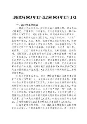 县财政局2023年工作总结和2024年工作计划一、2023年工作总结1.财政收支运行平稳。建立财政收入调度机制,综合抓收,定期调度,以月保季、以季保年。预计全年完成地方一般公共预算收入XX万元,同比增长8.5%,顺利完成年初预算目标。预计一般公共预算支出达XX万元,同比下降8.2%。三保底线兜牢兜实,农业、教育、医疗等重点支出保障有力,财政收支运行平稳。牢固树立过紧日子思想,出台落实落细厉行节约坚持过紧日子23条工作举措,从印刷费、会议费、培训费、差旅费、三公经费等方面严控支出,从印刷纸张、空调使用、绿植摆放、出差标准等细节层面以硬措施推进过紧日子要求落地。全年统筹债券资金、上级专项资金、存量资金合计X亿元,确保全县重点工作、重点工程资金需求。统筹各级各类财政涉农资金XX万元,集中财力办事,优先支持联农带农富农产业发展,统筹财政衔接资金和XX后扶资金XX万元支持县级重点产业发展,XX万元用于一带两路两区人居环境集中整治。2.助力发展更加有为。修订《XX县支持经济高质量发展若干政策(2023版)》,有效推动全县经济高质量发展。安排中小企业发展专项资金XX万元,支持中小企业提质增产增效。积极争取获批省级废气治理提升改造项目资金XX万元,有力地支持了园区企业发展壮大。大力开展四送一服活动,为企业排忧解难。实施新的组合式税费政策,全县共有327户小型微利企业享受企业所得税低税率优惠政策和增值税阶段性减免优惠,总计减免各类税费XX万元。积极对接省内外各类基金,县内功能膜首位企业累计吸收各类基金投资XX亿元。3.国资管理提质增效。印发《XX县县属国有企业提质增效行动方案》,开展县属国有企业提质增效行动,进一步提升企业效益。制定《XX县企业国有资产监督管理办法》《XX县县属国有企业经营业绩考核暂行办法》,建立完善的国企监管体系和覆盖所有县属国企的考核体系。发投集团宜南线天然气项目、建发大厦、土地开发、中渠项目、人才公寓、羊乌山矿等实体项目运作稳步推进,建XX司已经取得建筑和市政总承包二级资质,县龙山公共资源交易有限公司已完成代理项目23个,收入XX万元,高铁南站智慧停车系统X月1日正式运行;深化县属国有企业监事会改革,加强县属企业内部监事会建设,全面取消县属企业外派监事X名;县龙山产业投资有限公司申报发行企业债券X亿元,打通直接XX渠道;发XX司积极谋划新型城镇化提质升级、农业综合开发、晋湖片区水系综合治理等XX项目XX个,取得银行授信XX亿元,提款XX亿元。文旅集团谋划环湖民宿产业集群等3个重点项目,预计取得XX亿元;开XX司县经开区南扩片区开发(一期)弃土利用等2个项目申请XX亿元。开展资产资源清查,盘活利用存量资产,处置工程项目产生砂石土资源项目XX个,处置收益XX万元;搭建政府公物仓平台,已累计从公物仓调剂XX余项XX万元资产;累计将县直各部门XX处位于乡镇的闲置房屋土地划转至属地政府管理盘活,用于太商返乡创业,助力乡村振兴;牵头调剂XX县资规局等X个单位办公用房。4.普惠金融高质量发展。建立企业上市工作包保调度机制,对企业上市实行月调度,推进上市进程,富印新材料9月已向省证监局申报辅导备案,绿动能源已完成首轮股权XX万元,投后估值XX亿元。开展五进走访活动,走访一级市场活跃主体XX家,走访率XX%。强化金融助企纾困,累计新增助企贷款XX亿元。进一步加强农民专业合作社资金互助风险防范化解工作,2023年关停资金互助业务共计XX家,并实现了投放金、互助金双降目标。严格落实脱贫人口小额信贷政策,脱贫人口小额信贷余额XX亿元,今年新增投放XX户XX万元。全县推进党建引领信用村建设工作,累计授信XX亿元,用信XX亿元,累计授信户数XX户,用信户数XX户。强化政府性XXXX作用,县XX公司在全省综合评价为A类。采取批量化XX的新模式,创新推出链担通--黄牛贷特色业务品种,合作授信额度XX万元。合理运用税融通业务品种,2023年税融通信用XX贷款企业XX家,信用XX额度XX亿元,拓宽了企业XX渠道,金融助企纾困工作成效显著。政策性农业保险工作扎实推进,防贫保综合保险试点稳步推动,全县XX户农户参保,收取保费XX万元。5.争资争项取得突破。将向上争资争项列入县综合绩效考核,激励各部门积极争资,解决XXXX问题。成功争取2023年中央财政支持普惠金融发展示范区和中央专项XX公益金支持欠发达革命老区乡村振兴示范区建设项目两个国家级示范项目,共获中央财政资金XX万。2023年8月《XX县大力发展普惠金融助企惠农暖民心》典型经验得到了省委主要领导批示。省委政研室、省财政厅、省XX集团、省人民银行先后前来开展解剖麻雀式调研,以XX模式为全省普惠金融发展探索路径。6.重点改革有序推进。全面实施零基预算改革,打破传统支出