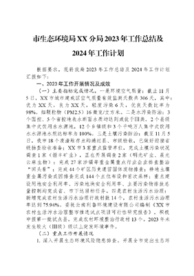 市生态环境局XX分局2023年工作总结及2024年工作计划根据要求,现将我局2023年工作总结及2024年工作计划汇报如下:一、2023年工作开展情况及成效(一)主要指标完成情况。一是环境空气质量:截止11月5日,XX市城市建成区空气质量有效监测天数共306天,其中:优为XX天,良为XX天,轻度污染6天,优良天数比率为98%。细颗粒物(PM2.5)16微克/立方米。二是水污染防治:3个国控、5个省控地表水断面水质均达到或优于Ⅲ类,2个县级集中式饮用水水源地,12个乡镇级和3个千吨万人集中式饮用水水源地水质达标率为100%。三是土壤污染防治:截至11月5日,我市18个废渣堆存点均通过县、市级验收,已做好迎接省级抽查验收准备;XX市3家重点监管单位,完成土壤污染状况调查1家(恒丰矿业),正在开展调查2家(明光矿业、晨光云麻生物);完成27家涉镉等重金属重点行业企业排查整治回头看;完成44个矿区历史遗留固体废物排查;耕地土壤重金属污染成因排查完成144个点位布设和首次采样;重点建设用地安全利用率、污染地块安全利用率、主要污染物排放总量控制均完成省、市下达目标任务。四是农村生活污水治理:新增完成农村生活污水治理行政村数14个,农村生活污水治理率达到75.94%。委托云南利鲁环境建设有限公司编制《XX市农村生活污水治理整市推进试点项目可行性研究报告》,积极申报第一批试点县。完成农村环境整治行政村13个。2023年未发生较大(Ⅲ级)级以上突发环境事件。(二)重点工作开展情况1. 深入开展生态环境风险隐患排查。开展全市突出生态环境风险隐患排查4次,拍摄警示片1个,形成问题清单5份,整改建议5份。2. 筑牢生物生态安全屏障。一是以高黎贡山国家级自然保护区为重点,全面开展生物多样性保护,不断强化各类自然保护地的日常监管,切实加强我市生物多样性保护工作,争当全省生物多样性保护排头兵,9月7日,编制印发了《XX市进一步加强生物多样性保护工作方案》。二是积极配合联合国环境规划署国际生态系统管理伙伴计划、中国环境科学研究院、中国地理科学与资源研究所实施生态系统与生物多样性经济学可持续农业和食品系统项目。三是严格落实自然保护地监管职责。截至目前,绿盾2020反馈问题已完成172个点位和4个石材加工片区验收销号,正在加紧7个点位和2个石材加工片区整改。3. 强化环境监管与服务。一是优化环评审批服务。截止11月6日,共指导建设单位在《建设项目环境影响登记表备案系统》中完成环境影响登记表备案项目127个,受理并审批建设项目环境影响评价文件34个,审核确定46个项目环境影响评价执行标准。二是环境执法力度有效落实。加强重点污染企业检查工作,严格执行双随机、一公开,对污染源监管动态信息库中75家企业开展双随机检查,检查企业42家,出动执法人员150余人次。截至目前,共办理涉嫌生态环境违法行政处罚案件11件,处罚金额191万元,在办案件5件。督促企业编制突发环境事件58家,备案58家。受理各类信访案件146件,受理146件,办结143件,办结率98%。4. 全力推进各级各类环保督察检查交办问题整改。XX市各级各类督察检查反馈问题共13大类1235个(件)。截至目前,已整改完成1154个,整改完成率为93.44%。5. 扎实推进省级生态文明建设示范区复核评估。为确保我市顺利通过国家绿水青山就是金山银山实践创新基地评估工作,委托云南省生态环境科学研究院编制《XX市绿水青山就是金山银山实践创新基地自评估报告》、指导档案材料的收集与整理等相关复核评估技术服务。全面开展省级生态文明建设示范区复核评估网上填报,目前已按照要求完成了网上上报工作,待生态环境厅复核通过。6. 核与辐射环境管理监管。一是我市共有核与辐射利用技术单位47家(医疗机构46家、企业1家),均取得了核辐射安全许可证。根据工作要求,认真开展核技术利用与辐射环境安全监管,年内共督促44家核技术利用单位按要求建立和完善核辐射环境管理信息系统和有关管理台账。二是配合生态环境部西南核与辐射安全监督站对381云南地㓎采铀科研实验基地退役治理工程辐射环境安全进行例行检查,通过检查指出存在的问题,督促核工业北京化工冶金研究院对照检查情况逐项整改完善。7. 着力谋划项目申报。正在优化修改XX市龙川江中上游环境治理与绿色发展融合EOD项目,计划投资XX亿元。委托资质单位编制上报(拟申报)中央项目库项目5个,省级专项资金项目库项目11个,总投资XX万元,拟申报资金支持18999.38万元。二、存在问题和困难(一)环境质量保持优良压力较大。一是水质改善情况不稳定,2023年4月龙川江蓝藻爆发,8月,江南省控断面、凉亭桥省控断面水质较7月份下降1个类别(为Ⅲ类,主要影响因子是高锰酸盐指数和总磷)。说明虽然通过