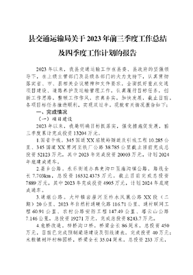 县交通运输局关于2023年前三季度工作总结及四季度工作计划的报告2023年以来,我县交通运输工作在县委、县政府的坚强领导下,在上级主管部门及县级各部门的大力支持下,认真贯彻落实省、市、县相关会议精神和文件要求,全面抓好重点交通项目建设、道路养护及运输管理工作,认真履行目标任务,创新工作思路,整顿工作作风,求真务实,加快发展,截止目前,各项目标任务推进顺利,实现双过半。现就有关情况报告如下:一、完成情况(一)项目建设2023年以来,我局明确目标抓落实,强化措施促发展,前三季度累计完成投资13204万元。1.国省干线。345国道XX庙坡岭隧道及引线工程10.285公里、345国道XX界河至铁厂公路38.785公里截止目前完成总投资52123万元,其中2023年完成投资20003万元,计划2024年底建成通车。2.县乡公路。永乐街道办典史沟口至庙沟镇公路,路线全长7.703km,总投资16532.4375万元。截止目前完成总投资7889万元,其中2023年完成投资4905万元,计划2024年底建成通车。3.通组公路。大坪镇岩屋河至柞水凤凰公路XX段(二期)20公里、2023年自然村通硬化路116.71公里、通村联网工程60.91公里、农村公路安防工程147.49公里、塔云山公路7.146公里,总投资19271万元,完成总投资8243.7万元。4.危桥改造。梓桥沟口桥,桥梁全长86延米,总投资450万元,目前已完成预制梁场建设及引线清表,完成投资40万元;米粮镇树坪村柿园桥,桥梁全长35.04延米,总投资233万元,目前已完成拌合站建设,完成投资22万元。(二)道路养护及运输管理1.不断提升养护管理水平。一是公路技术状况指数全部达标且始终保持100%列养。截止到9月底,县、乡、村公路技术状况指数分别为76.5、75.1、62。二是召开了我县农村公路养管工作会,部署了2023年度目标任务,与各农村公路养护道班签订目标责任书,以实际行动和具体措施积极落实各项工作任务。2.努力巩固养护管理成果。一是组织道工对全县农村公路县乡道进行全面养护,对桥涵、水沟、路基进行全面检查,确保平稳渡汛和道路通行质量。二是全面开展路面病害处置、公路附属设施维护、桥梁集中检查养护、疏通边沟桥涵、路面清扫保洁等工作,重点完成了G345XX至云镇路面修复3863㎡;沙沟河道班修缮提升1处;S314冷安公路水毁修复5处,路面修复28处8320㎡,绿化美化20处;S314磨木公路0K-15K路面修复、绿化美化、划线设标品质提升15公里。三是按照县委、县政府部署安排,对我县重大活动和高中考期间实施了道路保畅工作,确保了通行安全。3.扎实推进示范创建工作。一是按照四好农村路省级示范县创建工作要求,进一步细化完善迎验方案,通过文件形式,将四好农村路示范创建工作纳入镇办、部门年度考核;二是四好农村路省级示范县创建工作,已于6月13日由陕西省交通运输厅组织验收,并在9月28日,陕西省交通运输厅公示了*县通过2023年度四好农村路省级示范县评选。4.运输管理水平显著增强。扎实开展打击非法营运、整治交通运输行业乱象、道路运输超限、抛撒、扬尘污染、侵犯路产陆权等专项整治行动。截止目前,共检查运输车辆1000余辆处理违章车辆40余辆,共计处罚金额9万余元,有力保障了全县道路交通良好秩序。二、工作亮点一是科学谋划,强化统筹。我局将交通运输事业发展与经济社会发展大局统筹考虑,按照公路建设与综合交通规划相结合、与城乡协调发展相结合、与巩固脱贫攻坚成果助推乡村振兴相结合的三结合原则,明确总体要求、目标任务和工作重点。立足于本职工作,科学摆布,认真谋划,合理安排,迅速展开,制定全年工作时间表,做到了心中想全年,突出抓首季,致力保开局,形成了推进当前工作的强大合力。二是高度重视,强化保障。县政府成立主要领导任组长、分管领导任副组长,相关部门负责人为成员的公路项目建设指挥部,并分别成立县镇两级公路建设管理机构,做到机构、人员、职责、经费四落实。项目相关手续办理,实行发改、自然资源、林业、水利、环境等多部门并联办公,快速推进;建设采取互联互动,协力推进的办法,定期包抓领导带队组织相关部门和镇村深入项目施工现场,及时协调解决建设过程中的各种矛盾和问题,为项目顺利推进提供环境保障。三是创新机制,强化管理。坚持五个到位,即程序规范到位、管理监督到位、技术标准到位、质量检测到位和培训服务到位。统一制定项目招投标文件范本和公路建设、质量、进度、变更、计量、支付等管理办法,实行政府监管、业主负责、监理监控、社会监督、企业保证五级质量保证体系,严格按照项目批复、图纸设计和技术标准组织施工。通过县农村公路质量监督站加强公路质量监督,多途径、多形式、多层次开展对一线人员的技术支持和培训