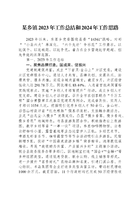 某乡镇2023年工作总结和2024年工作思路2023年以来,东茗乡党委围绕县委14361战略,对标小县六大再深化、六个先行争示范工作要求,以比促干、以比破题、以比争优,着力在全乡营造比学赶超、创先争优的浓厚范围。第一、2023年工作总结一、聚焦品牌打造,固成果、促振兴党建联建促共富。成立下岩贝·金山上片区党委,建设片区党群服务中心,通过人才共育、品牌共创、发展共兴、治理共管、服务共推,实现全域共富蝶变,截至9月,片区经营性收入达291.78万元,同比增长83.44%,入选省首批共同富裕实践观察点。实施乡创人才培育提升行动,成立乡创人才党支部,建设乡创人才活动室,召开全市农创客助力千万工程擂台赛暨第五次基层党建双月例会,完成普及性、实用人才培训1034人次,挖掘吸引优秀乡创人才50余位,金山村、后岱山村获评省红色根脉强基示范村。文旅融合激活力。立足出凡尘·入慢乡发展定位,凸显慢乡看雾、慢乡看戏、慢乡看花地域特色,与县旅游集团合作,积极推进云上夜游图、数字乡村等省一事一议项目,参差咖啡博物馆、云卷云舒咖啡小屋、露营基地等业态运营步入正轨,乡村艺术节、啤酒龙虾音乐节、咖啡露营节等节会活动吸引众多游客,民宿新增5家,获评中国最美旅游乡镇荣誉称号。消薄提低谋增收。开展政银助力共富、产业振兴乡村主题推介活动,联合县政务服务办等多部门,因地制宜打造国企+金融+等多种组团类型,通过低息贷款、联合认购、线上销售等形式,进一步提升茗香好礼农特品牌知名度。引进门溪山居、开心纺织、丰岛集团等企业打造多类型共富工坊,带动村民增收1000余万元。截至目前,11个行政村均已完成50万经营性收入消薄目标,其中后岱山村经营性收入超80万元,下岩贝、金山村超100万元。二、聚焦宜居宜业,美环境、增靓点人居环境更加宜居。以迎亚运人居环境整治暨垃圾分类集中攻坚行动为抓手,出台人居环境整治提升奖惩办法,设立攻坚进步奖激发干部干事动力。以集采通APP为媒介,每村配备一名人居环境督管员,实现整改问题随时看、秒受理、马上改,截至目前,完成问题整改7865个,第二季度市级人居环境测评位列全市第三,东丰坑村荣获市级红旗村。积极推进国家卫生乡镇创建工作,顺利通过市级暗访。垃圾分类更入人心。出台《乡垃圾分类三分考评工作办法》,以分月计量、分类评级、分级督查为抓手,积极创建下岩贝·金山上垃圾分类示范片区,垃圾分类达标镇街考核连续两期位列全市(乡镇)第一。通过分类施策,实行两种收运体系,针对旅游业态丰富的村,单独落实一车一人一系统工作模式,落实专人每日上门开展公交式垃圾智慧化收运,其他行政村实行一村一点位工作模式,实现全乡易腐垃圾收运全覆盖。打造垃圾分类宣传教育体验中心,推行村级自查+入户宣传+积分兑换工作机制,累计兑换积分奖励2万余元。土地资源更可持续。做好土地开发及农村土地综合整治项目,实现周周有进度,月月有晒比,截至目前,完成x村土地开发52.8亩,完成马家弄土地综合整治近5亩。做好耕地功能恢复工作,一周内完成全乡潜在资源摸排,截至目前,完成地表清理及工程552.81亩。做好非粮化整治工作,录入图库2956.3亩,整治832亩、优化512亩,目前进入验收、兑付阶段。扎实开展林地流转工作,6条连接线已全部完成施工验收。三、聚焦民生热点,强保障、增福祉养老服务再升级。加快推进乡村组团式养老模式,引进宁波优秀养老服务团队,成功将长者共享食堂的优秀经验复制到更多自然村,现有助餐点7个,目前累计助餐人数已超10万人次。不断完善养老服务机构,乡居家养老中心及村级照料中心开展各类活动204场次,包涵健康知识讲座、社工活动、健康检测等服务内容。全力推进乡理乡亲服务集市提质扩面工作,针对性提供老人理发、小修小补、移动医疗、商品直购等为民小事公益服务,已开展服务集市活动54场,惠及片区群众2680余人次,相关工作在《联谊报》头版头条刊出,被省政协专报录用并获得批示。便民服务再优化。乡便民服务中心新办公场所投入使用,11个村便民服务站办事场所进行标准化提升,开展以政务2.0受理为重点,线上线下办理相结合的办理模式,建立错时、延时、预约服务机制,便民服务工作得到进一步提升和规范,截至目前,累计办件1500余件。民生工程再提档。完成联丰水库至里白岩农村公路提升改造工程,高质量创建四好农村路市示范乡镇,引入专业养护国有企业,农村公路养护工作连续三季度排名全县第一。丰岩山、石下坑、马安山供水站已完成改造,永丰水厂厂区土建工程已完成初验,集镇水厂、上来村供水站正在施工,黄潭庵、黄潭坑供水站已完成技术交底会,塘坞、康庄小里此岙、上来倒水库等山塘已完工。四、聚焦主动创稳,强治理、守底线基层治理纵深推进。深化