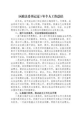 区政法委书记近3年个人工作总结近年来,在市政法部门和区委的正确领导下,与常委、政法委班子成员一道,同心同德,开拓进取,找准自己在常委班子中的位置角色,全力做好政法、维稳、信访、社区、社会管理等各项分管工作,全力服务和保障经济社会发展大局。一、提升自身素养,切实增强创新实践能力一是不断提升思想理念。深入学习贯彻落实XXX法治思想,充分认识政法工作的重要性、特殊性,切实增强使命感、责任感。紧扣中心要务,落实稳定第一责任,始终把政法工作放到经济社会发展大局中谋划、推进、展开,真正做到服务发展、保障发展、融入发展。认真思考和把握政法工作,注重及时搜集学习X等地的好经验和好做法,高度关注各种新观点新思路和各种研判分析,积极参加省市组织的各类培训、报告会、考察等学习活动,有效提高自身谋划发展和改革创新的能力。二是始终注重学法用法。作为政法委书记,更加自觉践行法治建设要求。坚持学以致用,通过对社会主义法治理念的学习和把握,深刻理解和牢固树立公平、公正、文明、规范的法治理念。狠抓依法执政和依法行政重点环节,推动各级按照法律法规办事,切实重视守法、普法、用法,积极为我市发展提供法治保障。三是坚持推动改革创新。把改革创新作为破解政法工作难题的出路。充分发挥基层自治的作用,进一步完善群众自治机制;提升社会治理法治化水平,坚持运用法治思维构建社会行为有预期、管理过程公开、责任界定明晰的社会治理制度体系;加强机关自身建设,推动公检法司等政法部门不断加强和完善工作机制建设。二、认真履行职责,推动政法工作扎实开展一是着力维护社会大局稳定。始终站在党和工作大局角度加强和改进政法工作,把维护社会大局稳定作为政法工作的基本任务。一方面加强重点工作政法保障。积极开展司法建议,主动为企业提供司法支持,及时预防和有效化解经济风险。推引导律师为重点工程、重大项目建设、深化农村改革、保护生态环境等方面提供法律服务,开辟服务企业发展和重点工程建设绿色通道。另一方面持续强化公共安全监管。坚持落实责任和完善机制相结合,突出制度管控、建立监管网络、强化检查、专项整治,公共交通事故得到有效控制,未发生特大交通事故;严格消防安全定期通报、重大隐患督办整治制度,夯实城镇社区火灾防控基础工作。加强环境保护监督管理,持续推进整治,强化大气污染治理,全力解决突出环境问题。加强危爆物品管控,食药监管控水平不断提升,未发生重大食物中毒事件;安全生产工作有效落实,事故数量明显压降。二是着力推进平安建设。全面推进平安建设,努力建设领域更广、实效性更强、人民群众更满意的平安建设,形成一个全覆盖、多层面的大平安社会格局。一是预防化解社会矛盾风险。加强社会稳定风险评估工作,健全稳评运行机制,提升稳评工作实效,做到应评尽评。二是强化社会治安综合防控。加大依法打击力度,注重对赌博、电信诈骗、涉众型经济犯罪等犯罪行为的打击,有效压降违法犯罪警情。强化重点整治,突出民意导向,建立完善社会治安分析研判机制。三是扭转信访形势。正确理解维稳和维权的关系,强化法律在化解矛盾中的权威地位,做到诉求合理的解决到位、诉求无理的思想教育到位、生活困难的帮扶救助到位、行为违法的依法处理,及时就地解决群众合法合理诉求,维护正常信访秩序,切实维护好群众的合法权益。三是着力夯实基层基础建设。牢牢树立固本强基的理念,注重探索创新,不断优化完善基层基础工作体系,实现基层基础建设新加强。一是三级社会管理综合服务体系逐步规范。拓展区级社会管理服务中心功能,实现矛盾联调、治安联防、应急联动、问题联治,有效发挥综合性社会管理服务作用。推动镇级政法综治工作中心向社会管理服务中心转型,强化公共服务功能,人民群众办事更便捷。加强村级社会管理服务站建设,整合各类窗口服务资源,实行集中服务。二是社会管理服务一张网工程全面推进。优化整合各类服务管理力量,配齐配强网格管理员队伍,通过一岗多责、一专多能等形式实行组团式服务管理,全面建成覆盖城乡、条块结合、横向到边、纵向到底的基层服务管理网格体系,努力做到排查全覆盖、管理无缝隙、服务全方位,切实解决看得见的管不了,管得了的看不见的问题。三是综治信息平台建设日益完善。做好信息终端延伸拓展、基础数据录入和动态信息采集等工作,全区形成以综治信息平台为依托、以网格为基础实战单元的虚实相辅管理模式,实现区镇村三级全覆盖。四是着力打造过硬政法队伍。按照全面从严治党要求,加强队伍建设,强化履职意识,努力建设一支政治过硬、业务过硬、责任过硬、作风过硬、纪律过硬的政法队伍,为推动全区政法工作发展提供坚强保证。一是强化理想信念教育。强化社会主义法治理念和政法干警核心价值观教育,解决好干警世界观、人生观、价值观的问题,坚定其信仰法治、坚守法治、抵制干扰的定力,坚守法不阿贵、绳不绕曲的法治精神。二是紧抓本领能力建设。着力提