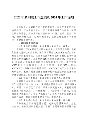 2023年乡妇联工作总结及2024年工作谋划今年以来,乡妇联在县妇联的指导下,在乡党委政府的正确领导下,以乡党委为中心,以党建带妇建为抓手,按照上级工作要求,充分发挥妇联组织的引领、联系、服务作用,凝聚巾帼之力,汇聚巾帼之智,在新征程上谱写半边天更加绚丽的华章。一、2023年工作总结(一)突出思想引领,着力引领妇女听党话、跟党走乡妇联以XXX新时代中国特色社会主义思想为指导,全面贯彻落实党的XX大精神,深入学习领会XXXXXX关于妇女和妇女工作的重要论述。在全乡范围内积极组织各村妇联收听收看热议党的XX大,开展党的XX大精神宣讲活动,开展学习会10余次。实施基层妇联领头雁赋能奋飞计划,集中学习XXX新时代中国特色社会主义思想、党的XX大精神、XXXXXX对妇联工作的重要指示、XXXXXX关于妇女儿童和妇联工作、家庭文明建设重要论述和妇女权益法律法规及女性健康知识讲座、妇联业务知识,着力突出巾帼心向党。(二)突出干事创业,着力动员妇女勇争先、建新功乡妇联大力助推乡村振兴、农村人居环境整治、美丽庭院建设等工作,2023年,共创建美丽庭院9户,精品庭院6户。开展十佳百优活动,评选十佳庭院1户。积极组织开展评选最美家庭、好媳妇、好邻居等活动,极大的激发她服务,号召她担当。开展我是妇联执委大家评活动,激励妇联执委担当作为、履职尽责。(三)突出关心关爱,着力围绕妇女办实事、解难题乡妇联致力于传递温暖与爱,定期走访困境妇女、儿童。2023年,乡妇联组织各村妇联巾帼志愿服务队去困境妇女、儿童家中开展清洁、慰问等志愿服务活动;对困境妇女进行入户走访,关心她们的生活情况,为困境妇女送上米、面油等慰问品;对困境儿童进行入户走访,关心他们的心理状态,陪他们一起读书、做家务,为困境儿童送去爱心小礼物,用实际行动让他们感受到妇联的关心与关爱,进一步增强困境妇女、儿童的幸福感和安全感,当好新时代纾解忧愁的巾帼贴心人。开展执委进万家巾帼送温暖活动。要落实执委日走一户要求,进门看、坐下谈,进一次家,办多项事,将执委进家活动与XX大精神宣讲、美丽庭院创建、家庭文明建设、乡村振兴、基层社会治理等内容相融合,落实执委进百家门、知百家情、解百家忧、办百家事要求。(四)突出组织建设,着力融入妇女新阶段、新格局组织开展全民阅读活动,进一步贯彻落实了XXXXXX关于注重家庭、注重家教、注重家风的重要指示精神,倡导全民阅读,充分发挥亲子阅读在传递良好家风、传播科学家教中的重要作用。组织开展妇女权益保障法、反家庭暴力法等普法宣讲活动,让广大妇女干部群众对于婚姻家庭纠纷调解等诸多法律条款有了深切地了解与认识,提高了妇女学法、守法、懂法的积极性,提高了依法维护妇女权益的服务能力和水平。二、2024年工作谋划(一)突出政治引领,凝聚妇女群众持续高质量开展学习贯彻XXX新时代中国特色社会主义思想主题教育,聚焦学习宣传贯彻党的XX大精神及XXX关于妇女儿童和妇联工作重要论述,深化百千万巾帼大宣讲活动、巾帼朗读者活动,开展形式多样的宣讲活动,团结带领广大妇女争做伟大事业的建设者、文明风尚的倡导者、敢于追梦的奋斗者。(二)强化责任担当,服务中心大局深化乡村振兴巾帼行动,引导广大妇女和家庭积极投身农村人居环境整治、乡风文明、乡村治理等等中心工作;助力巾帼双创行动,大力支持妇女创新创业,引领广大妇女积极投身高质量发展大潮。(三)加强统筹协调,深化维权关爱加强民生关爱,积极推动两癌免费检查及两癌妇女救助工作,大力实施困境妇女儿童关爱帮扶行动,健全多部门维权合作机制,加强部门联动,不断优化平安家庭创建、婚姻家庭纠纷多元化解机制建设,维护妇女儿童合法权益。(四)建设家庭文明,树立文明新风常态化开展家庭教育公益服务活动,深化家庭家教家风建设,发挥妇女在社会生活和家庭生活中的独特作用,以小家庭的和谐共建大社会的和谐。