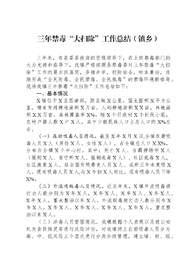 三年禁毒大扫除工作总结(镇乡)三年来,在县委县政府的坚强领导下,在上级禁毒部门的大力支持和指导下,我镇严格按照县禁毒委对三年禁毒大扫除工作的要求抓落实,多措并举,打防结合,标本兼治,逐渐形成全民防毒、全民禁毒、全民抵毒的禁毒环境新格局。现将我镇三年禁毒大扫除工作总结如下:一、基本情况X镇位于X县西南部,距县城X公里,国土面积X平方公里,镇有常用耕地面积X万亩,人均耕地面积X.X亩,林地面积X.X万亩,森林覆盖率X%。辖X个行政村X个村民小组,农村户籍人数X户X人,其中少数民族人口占总人口的X%左右。(一)在册吸毒人员情况。截至X年X月X日,全镇在册吸毒人员X人(男性X人、女性X人),占全镇总人口X.X%,分布在全镇X个中心村。其中:死亡X人、在羁押场所X人(服刑X人、看守所X人、强制戒毒X人)、社区戒毒X人,社区康复X人、社会面有吸毒史人员X人、戒断三年未复吸X人。现有吸毒人员X人,与X年初X人相比,现有吸毒人员下降X%。(二)外流吸贩毒人员情况。近五年来,X镇外流吸毒被打击人数分别为X年X人,X年X人、X年X人、X年X人、X年X人,重点整治以来X人。外流贩毒被打击人数分别为X年X人,X年X人、X年X人、X年X人、X年X人,重点整治以来X人。(三)涉毒人员管理情况。我镇根据个人表现以及被公安机关查获情况等进行风险评估,对我镇网上在册吸毒人员分为高、中、低风险三个层次进行分类分级管理,建立镇、村、组、户四级结对帮扶机制,社会面吸毒人员X人中,高等风险管理对象为X人,中等风险管理对象为X人,低等风险管理对象为X人。二、主要做法三年大扫除以来,我镇坚持党委领导、政府负责、部门协同、镇村联动、全民参与原则,采取统筹推进、打防结合、标本兼治的措施,工作取得了阶段性成效。(一)高位推动,靠实禁毒工作责任。三年大扫除以来,我镇对标对表上级工作要求,举全镇之力、聚全镇之智,抓实抓深抓细禁毒工作,一是强化组织领导。始终把禁毒与经济建设放在同等重要位置,同安排、同部署、同落实、同奖惩,成立镇禁毒工作领导小组,结合实际制定下发《X镇三年禁毒大扫除工作实施方案》《X镇X年禁毒工作重点整治实施方案》和具体考核奖惩机制,进一步增强做好禁毒工作的责任感和使命感,切实做到镇、村两级思想高度统一。二是强化分析研判。镇党委镇政府定期召开专题会议听取汇报和研究部署禁毒工作,及时分析研判全镇禁毒工作取得的成效和存在的问题,不断完善举措,逐步提升工作成效。禁毒大扫除以来,镇党委镇政府专题研究禁毒工作X次,召开禁毒工作推进会议X次,专题研判禁毒工作中遇到的问题及解决措施,精准处置禁毒重点整治、农村毒品治理、禁毒安保等方面遇到的问题困难。三是强化责任担当。三年来,镇级与X个中心村、镇属各单位、辖区内企业签订了禁毒目标责任书X份,镇村干部职工签订拒毒承诺书X余份,重点村寨与镇党委镇政府立了军令状,村与农户签订拒毒承诺书X余份,明确了目标任务和职责分工,层层传导禁毒工作压力。四是强化专班力量。制定印发了《关于成立X镇吸毒人员排查管控工作专班的通知》,抽调X名政治素质高、业务能力强的干部成立禁毒重点整治工作专班,具体负责重点整治工作,实现了专人抓、专人管。并结合各村实际情况,选派工作能力强、办事效率高的X名干部到村驻点服务,确保禁毒工作取得实效。(二)多措并举,遏制毒情多发趋势。一是全覆盖开展信息摸排。制定印发《X镇吸毒人员帮教排查管控工作实施方案》,开展吸毒人员毛发检测,落实社会面吸毒人员帮教管控四级责任包保,确保辖区在册吸毒人员底数清、情况明、定位精准,杜绝吸毒人员肇事肇祸案事件和外流贩吸毒发生。二是多方面开展服务管控。成立了以镇党委书记、镇长任双组长的社区戒毒(康复)工作领导小组,定期研究和落实社区戒毒(康复)人员帮教工作;设立社区戒毒、社区康复工作站,配备有社区禁毒专职人员X名,定期开展辖区社戒社康对象尿检、谈话、帮教、心理疏导等工作,严格实行一人一策,动态完善一人一档;建立健全社区戒毒康复制度和社区戒毒社区康复衔接机制,制定了一站式出所衔接工作实施方案,确保执行社区戒毒、社区康复人员出所接回,不脱管失控;认真贯彻落实《X省关于进一步加强社区戒毒社区康复工作推行T+X工作模式的通知》,对辖区社戒社康人员的管理更加精细化,严格按照T+X工作模式打击处理违反社戒社康协议行为。截至目前,X镇查处吸毒人员X人,其中查处违反社区戒毒协议X人、违反社康协议X人,查处执行率X%,出所人员管控率X%。三是多层次开展宣传教育。以禁毒大扫除、春季扫毒专项行动、X.X国际禁毒日、打击新型毒品违法犯罪专项行动、禁毒宣传进万家等活动为契机,发挥一中心一张网十联户和志愿服务队作用,通过滚动播放禁毒音视频、悬挂宣传横幅、张贴宣传标语、发送禁毒传单和