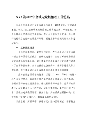 XXX镇2023年全域无垃圾治理工作总结自县上开展全域无垃圾治理工作以来,XXX镇党委、政府高度重视,制定了XXX镇全域无垃圾治理工作实施方案,严密组织,动员全镇积极开展环境卫生整治,下大力气整治卫生死角,为全镇群众创设了良好的生活生产环境,现将上半年全域无垃圾工作总结如下:一、工作开展情况一是强化组织领导,靠实工作责任。在全县全域无垃圾治理行动安排部署会议召开后,我镇迅速行动,立即召开全镇全域无垃圾治理工作安排会议,对全镇集中开展全域无垃圾治理行动进行了全面安排部署。各村按照全镇会议安排,召开各村党支部工作会议,为全镇全域无垃圾治理全面开展提供了组织保障。二是村庄清洁行动推进情况:以创XXX、XXX、等8个清洁村庄为治理重点,纵深推进农户集中清理房前屋后、村内巷道、沿村公路等白色垃圾及杂物。通过村社干部率先干、党员群众跟着干、动员群众自己干的方式,动员全镇力量,集中对门前五堆及违法建筑进行清理。截至目前,共清理残垣断壁64处,门前屋后五堆230多户,取缔废品收购站3处。三是农村厕所革命推进情况:坚持因地制宜、因事制宜分类推进农村改厕工作,对全镇24个村的农户总数、已改和待改数进行了摸底调查,全面核准,做到底数清楚。加强政策引导,以政策扶持带动群众自愿投入,提升改厕效果。同时,加强日常管理,健全农村保洁长效机制,实现乡村环境大提升。截至10月底,全镇共修建无害化卫生厕所1740座,公厕18座。四是非正规垃圾堆放点治理情况:以实现全域无垃圾为目标以公路沿线、集镇区域、村庄社区、农田、村镇道路、河道沟渠非正规垃圾堆放点等为重点集中整治,今年以来,全镇共反馈航拍点68个,完成整治68个;国家遥感卫星反馈非正规垃圾点X处,完成整治X处;县级反馈垃圾点X处,完成整治X处,累计投入劳动力3520人次、投入大小机械400台次、拆除违章建筑XXX处、清理五堆XX余处,合计各类垃圾约XXX多吨。五是污水处理站运营情况:按照治理到位、因地制宜、经济实用、路管同步的原则,采取集中纳管为主、分散式处理为辅两种治理模式,在XXX、XXX村建立污水处理站2个,建立了镇、村生活污水治理领导小组,落实村属地监管主体责任,认领生活污水处理点党员和志愿者管护岗,纳管率出水量挂钩考核等一系列措施,实现污水治理设施的专业化运行、科学化管理,真正做到污水处理设施高效运行。六是河道沟道环境治理情况:按照建立管理机构、明确工作目标、落实管理责任、严格管理考核的要求,成立了XXX镇实施河长制工作协调推进领导小组,进一步完善了镇、村两级河长责任体系,全面落实河长+警长的双河长工作责任机制,对XX个河长制公示牌进行了及时更新和维护。组织各村河长对所辖河流沟道开展巡查XX次,共发现问题XX处,并督促各村按要求、按限期整改到位。在河湖清四乱专项行动中,共清理建筑垃圾XXX吨,清理生活垃圾XXX吨。七是农村面源污染治理情况:强化责任落实,专题召开农业面源污染治理工作会,成立了以镇长为组长、分管副镇长为副组长,各村支部书记为成员的农业面源污染治理领导小组,并将任务分解到人头,层层落实责任;加大宣传力度,通过宣传及走访发放宣传单的方式,努力营造防治农业面源污染的社会氛围,不断提高全社会对农业面源污染治理工作重要性的认识;狠抓专项整治,由分管副领导牵头,对全镇农业经济合作社、生猪养殖户蔬菜种植户等进行了实地走访调查,并针对化肥、农药、农膜、畜禽粪便、农业废弃物等方面的污染情况,建立问题台账,限期整改;强化循环利用,坚持可持续发展观,倡导循环利用。在全镇范围内建立农业生产物资使用台账XX本,进一步了完善农业面源污染治理制度,对违规违法使用者依法严肃处理,积极推进高效生态农业建设,促进农业可持续发展。截至目前,全镇共落实旱作农业XXX亩,补贴新膜XX千克,兑换残膜XX万千克,兑换人次XXX人。同时对一些条件简陋、设施差、规模不大、效益不好的养殖场进行关停。基本杜绝了污水直接排入河道污染水体。二、存在问题及下一步打算虽然我镇今年来在农村人居环境整治中作了一定的工作,但是还存在一些区域垃圾清理不够及时、部分村纵深区域陈年垃圾清理整治不够彻底、常态化卫生保洁不够到位、有焚烧垃圾现象等突出问题,影响了全县工作大局。下一步,我们将继续把农村人居环境整治暨全域无垃圾治理作为当前重点,继续强化措施,切实抓实抓好各项工作。一是加强政策宣传引导工作,形成全面参与的工作格局。通过在人员居住密集地区悬挂、张贴宣传横幅和宣传标语,制作喷绘版面以及微信群和各种会议的方式,向广大群众宣传国家环保政策、爱护环境卫生与个人健康美好生活的关联等内容,进一步使广大群众深刻认识到爱护环境、保护环境的重要性和必要性。引导群众进行垃圾分类,定点投放,不在房前屋后堆放杂物,不乱搭乱建,形成良好的生活习