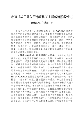 市直机关工委关于市直机关主题教育阶段性进展情况总结汇报争当三个表率、建设模范机关,是XXXXXX对新时代机关党的建设提出的使命任务。市直机关作为我市第二批次开展主题教育的单位,自觉站在践行两个维护的第一方阵、贯彻落实党中央决策部署和市委工作要求的第一梯队,牢牢把握学思想、强党性、重实践、建新功总要求,坚持学思用贯通、知信行统一,着力打造模范政治、学习、进取、服务、清廉、效能机关,努力在建设全省构建新发展格局先行区的生动实践中展现机关担当作为。一、筑牢绝对忠诚,打造模范政治机关。市直机关首先是政治机关,讲政治是最鲜明的特点,是第一位的要求。在市委坚强领导下,市直各单位狠抓党的政治建设,深入开展主题教育,擦亮对党绝对忠诚的政治底色,全力打造政治过硬的模范机关。一是带头做到两个维护。以高度的政治自觉和饱满的精神状态投身主题教育,以实际行动坚定拥护两个确立、坚决做到两个维护。市委办公室对党的十九大以来收到的195件XXXXXX重要指示批示建立台账,完善定期对账、督办检查、回头看制度,持续跟踪抓好落实。市人大常委会办公室制定深化政治生态建设的若干措施,提出政治机关建设7个方面的20项措施。市委组织部在主题教育中既当好参与者,又当好组织者,积极承担双重责任,坚持把主题教育作为检验坚定拥护两个确立、坚决做到两个维护的重要实践。二是不断提高政治三力。坚决做到中央有部署、机关见行动,市委有要求、机关抓落实,不断提高政治判断力、政治领悟力、政治执行力。市纪委监委机关对标对表党中央和市委深入开展主题教育有关意见,围绕5个方面提出47项具体措施,统筹推进纪检监察干部队伍教育整顿。市政府办公室聚焦市第十二次党代会战略决策和市政府工作报告重点任务,跟踪办理XXXXXX重要指示批示19件,市委、市政府主要领导批示648件、交办事项288件。市政协办公室坚持把开展主题教育同协商议政、调研考察结合起来,做到市委中心工作推进到哪里,政协工作就跟进到哪里、智慧力量就凝聚到哪里。市委直属机关工委深入学习贯彻XXXXXX关于推动长江经济带发展的重要讲话和指示批示精神,全力筹办共建长江经济带·机关党建促先行协作交流会,倡导沿江11县市和8个流域县市区构建党建引领区域协调发展大联盟。三是坚决落实政治任务。坚持把主题教育作为重大政治任务和重要职责来抓,推动主题教育高起点开局起步,彰显政治机关的鲜明本色。市委政法委坚持抓机关、带系统,指导全市政法机关分层分级开展政治轮训,研究制定政法机关具体举措,推动以党的创新理论指导政法实践。市委统战部召开全市凝心铸魂强根基团结奋进新征程主题教育动员会,以学思想、强根基、重履职、建新功为目标,带动党外人士有序开展主题教育。市检察院创新设立成果统筹组,健全双周例会、全程督办等4项工作机制,形成一把手主抓、工作组靠前协调、各内设机构分工合作的责任体系。二、凝心铸魂育人,打造模范学习机关。注重思想建党、理论强党,是我们党的鲜明特色和光荣传统。主题教育中,市直各单位坚持不懈用XXX新时代中国特色社会主义思想凝心铸魂,组织党员干部读原著学原文悟原理,在深学细悟中筑牢思想根基。一是示范引领导学。拓展思想引领学习在先机制,推动党的创新理论学习深化、内化、转化。市委宣传部落实将XXXXXX最新重要讲话、重要指示批示精神作为部务会第一议题制度,及时传达学习领会、研究贯彻落实。市委老干部局以理论学习中心组为引领,以理论业务知识学习周为载体,大力实施润心铸魂行动。市委党校按照总论+分论+特色三大模块,在主体班中设置《XXX新时代中国特色社会主义思想的世界观和方法论》等系列课程。市机关事务局举办全局系统主题征文比赛和全市系统主题演讲比赛,确定主题开展大讨论,引导党员干部学思践悟。二是紧贴实际研学。市直各单位紧密结合单位职能职责,系统梳理学习要点,聚焦国之大者市之要事开展深学细研。市委政研室创新开展每日跟学、每周述学、双周讲学、每月评学活动,在比学赶超中推进学习经常化、制度化。市自然资源局梳理XXXXXX关于自然资源相关工作的重要指示批示46项,集中学习研读,邀请专家围绕5个专题开展辅导。市作协编印《XXXXXX关于文艺工作重要论述摘编》,建立领导班子和班子成员理论学习清单,做到内容、时间、措施、要求一目了然。市科协开办科协讲堂23期,实施科协系统干部和科技工作者能力提升工程,将理论研讨、政策解读、工作体会、案例剖析有机结合。三是广搭平台引学。坚持在主题教育中创新学习形式、丰富学习载体、充实学习内容,实现理论学习有形有效、有声有色。团市委推出青春酷跑小游戏,打造永久奋斗的青春思政教育IP,开展话剧团课和主题团课59场,覆盖青少年超200万人次。