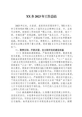 XX乡2023年工作总结2023年以来,在县委、县政府的坚强领导下,XX乡深入学习贯彻党的XX大和二十届历次全会精神以及省、市、县党代会精神,持续深入贯彻我县强工兴旅、绿色发展、城乡一体、幸福宜居发展战略,始终坚持生态立乡、产业兴乡、人才强乡、文旅富乡发展战略不动摇,有效应对各种困难和挑战,踔厉奋发、笃行不怠,乘势而上、奋勇争先,推动全乡经济社会事业取得了重大进展。现将XX乡全年工作情况总结如下:一、聚焦引领、齐抓共管,全力筑牢党的建设根基(一)夯实组织建设堡垒。严格发展党员程序,提高发展党员质量,今年以来从优秀青年人才中发展5名35岁以下党员;积极落实困难党员和老党员的走访慰问工作,七一前走访了62名老党员和困难党员。注重加强党员日常管理和教育培训,坚持落实三会一课"、专题民主生活会等制度,结合主题教育相关要求,聚焦学习贯彻党的XX大精神和XXX新时代中国特色社会主义思想,依托XX乡党校等平台,开展针对农村党员和乡村干部党员培训合计11次,提升了农村党员队伍综合素质,增强了党组织战斗力。严格管理村干部队伍,通过召开座谈会、下村走访等途径,6月份及10月份对全乡村两委班子届中分析情况进行了2次调研,做到情况清、底数明;注重从优秀人才中选拔充实基层干部队伍,今年已纳入2名大专及以上以上学历人员进入村干部队伍。(二)提高履职尽责能力。认真履行基层党建工作职责,层层压实责任,乡党委年初召开村党支部书记抓基层党建工作述职评议会,听取各支部书记关于抓党建工作的汇报并进行评议与指导;每季度定时召开专题党委会研究党建工作,按照《XX乡领导班子抓基层党建工作联系点方案》,定期听取各班子成员抓蹲点村的党建工作汇报并部署下步重点工作内容。严格落实意识形态工作责任制要求,按要求召开意识形态工作专题分析研判会2次,把意识形态工作与分管业务工作同部署、同落实、同考核,有力推动意识形态工作向纵深发展。(三)深入强化作风建设。始终把政治建设摆在首位,全面落实监督责任,切实做好党风廉政建设监督工作。今年以来,召开党风廉政建设专题会2次,全面从严治党专题会一次,党委理论学习中心组学习3次,开展廉政谈话1次,乡纪委主动约谈班子成员7人。持续深入落实中央八项规定精神,坚决防止四风反弹,把握春节、端午等关键节点,开展常态化警示教育1次,召开廉政提醒会4次,通报曝光典型案例20余起,同时聘请9名村级廉情监督员,打通了全面从严治党监督的最后一公里。紧盯容易发生问题的招商引资、民生工程、乡村振兴等重点领域,对党员干部苗头性、倾向性的问题早发现、早提醒、早纠正,灵活运用监督执纪四种形态,坚持教育和惩处相结合,完成立案5件,结案4件,处理4人。二、聚焦重心、主动服务,全力提升经济发展质效(一)全面加强招商引资。把招商引资作为经济发展的主战场,围绕招商引资重点工作主动作为、精准发力,千方百计抓招商、抢项目、拼投资。今年我乡外出招商4批次,完成项目入统6个,分别是嘉润科技高档服装智能制造项目、智航科技5G智慧物联及LED商显项目、众赢纺织年产X亿米涤纶化纤面料3500吨涤纶DTY项目、卓轩塑胶制品年产5亿只塑胶日用品玩具项目、鑫诚新材料产2000万平方米新型用布自动化生产线建设项目、易家湾遗留金矿选矿场地污染治理项目。完成固定资产投资XX亿元,任务完成比达143.83%,完成总量排名第一名,完成比例排名第一名,开放型经济和工业型经济稳步增长。(二)全面优化营商环境。深入践行保姆+服务理念,以最高标准、最好水平,全心助企纾困解难,增强企业家对XX的归属感、认同感。我乡共服务企业35家,针对企业建设开工过程中的难点、痛点、堵点问题,坚持做到主动服务、跟踪服务、细致服务,全程关心关注企业发展。如,通过定期走访、一对一帮扶、专班推进等方式,为恒洲纺织印染项目解决了能评掐脖子问题,助力凤凰物流5G智慧物流园项目建设跑出了加速度;通过一事一议,专题协调解决,顺利帮助鑫诚新材料公司及时争取了过桥资金和信贷通,助企化险为夷;通过主动加强与企业家和个体户日常联系,及时将上级惠企政策宣讲到位、落实到位,让企业享受到实实在在的真金白银。(三)全面推进项目建设。项目要引进来,还要落下去,更要动起来。在注重招商引资和项目服务工作的同时,也坚持加强项目落地资源统筹,全力助推项目落地、开工、投产,力促项目早落地、早建设、早达效。新引进的智航科技项目已完成科创中心入驻并在本年度达到升规条件;卓轩塑胶制品项目已注册公司并立项;垛庄建材项目办公楼已装修,厂房设备已进场,目前初步投产;恒洲纺织项目厂房和办公楼正在同步进行施工,预计十一月完成整体竣工验收;鑫诚新材料建设项目已完成设备安装交付,当月立项、当月投产。三、聚焦发展、产业共生,全力增强乡村振兴动能(一)有效巩固