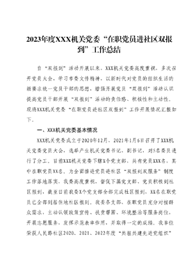 2023年度XXX机关党委在职党员进社区双报到工作总结自双报到活动开展以来,XXX机关党委高度重视,多次召开党员大会,学习市委文件精神,以新时代对党员的组织生活的新要求统一党员干部的思想,增强开展党员双报到活动认识提高党员干部开展双报到活动的责任感、积极性和主动性。现将XXX机关党委在职党员进社区双报到工作开展情况汇报如下。一、XXX机关党委基本情况XXX机关党委成立于2020年12月,2021年1月6日召开了XXX机关党委党员大会,选举产生机关党委书记、副书记,对5名委员进行了分工。目前XXX机关党委下辖X个党支部,共有党员XXX名,其中在职党员XX名。为全面推进党员进社区双报到双服务制度工作落地落实,我委高度重视,督促下属党支部、党员积极到社区报到,截至目前我委X个党支部全部完成社区报到,XX名在职党员已全部到居住地社区报到。我委各支部、在职党员充分对接群众需求,主动认领政策宣传、扶贫帮困、环境整治等服务岗位,开展志愿服务,发挥示范表率作用,并取得一定的成绩。我单位荣获人民路社区2020、2021、2022年度共驻共建先进党组织荣誉,一人荣获共驻共建先进个人荣誉。二、在职党员进社区双报到双服务情况(一)加强组织领导,提高思想认识。为确保双报到、双服务工作常态化制度化开展,委党组将各党支部开展双报到、双服务工作纳入党建工作计划,组织各支部书记召开专题会议,对党员进社区开展双报到双服务工作进行了安排部署。会议要求各支部要和街道社区及时对接,建立工作台账,与共助共建社区共同研究、共同协商、共同推进,组织在职党员有序深入社区,定期与报到社区党组织沟通联系,了解报到社区和居民的服务需求,切实发挥党建引领作用,形成共驻共建共促发展的良好局面。(二)精心组织实施,确保全部报到。一是落实报到制度。组织下属党支部在职党员持《党员进社区报到介绍信》积极到居住地社区报到,党支部分别到包联社区报到,进一步密切社区党组织与驻区党支部的联系,建立互联互通互动机制,落实支部负责人及联络人。二是全面查漏补缺。10月底对下属党支部及在职党员报到情况进行全面排查摸底,认真查漏补缺,督促工作进度确保信息不错、人员不漏,确保报到工作全覆盖、无死角。三是发挥考核作用。将党员进社区开展双报到双服务工作纳入三季度党建工作考核重要内容,将支部组织党员进社区报到开展服务情况列为党组织书记抓基层党建述职评议考核的一项重要内容进一步树牢支部书记第一责任人意识。(三)发挥党员作用,积极参与服务。我委在职党员到社区报到开展服务,坚持党建引领、因地制宜、重点发力、常态长效的原则,到位不越位、帮忙不添乱,努力做到工作奉献在单位生活服务在社区、争先创优作表率,协助社区抓党建抓治理抓服务,做好政策宣传、文明倡导、环境整治、疫情防控、便民服务、扶贫济困等工作。同时,结合工作实际开展特色化活动,市XXX组织全体党员干部开展传承雷锋精神,弘扬诚信文化的主题宣传活动,通过设立咨询台、摆放展板、发放宣传册等多种形式向广大群众宣传诚实守信的重要性,重点宣传讲解《陕西省社会信用条例》的重要意义及社会信用体系建设的重要性,积极引导群众讲诚信、重信用,让诚信理念深入人心,成为人们的普遍自觉行为。组织党员干部深入人民路社区开展党建联建凝聚合力共创文明宜居城市环境大整治活动,以实际行动参与到城市基层治理活动中,引导在职党员参与社区工作,做社区工作的参与者、支持者和建设者。党员干部用实际行动让大家感受到清洁的环境与大家的参与是分不开的,引导社区居民增强爱护环境的意识,鼓励他们积极投身到共创文明宜居城市活动中来,让大家都生活在一个舒适、干净的环境中。组织党员干部深入云康社区开展三风共建活动。三、存在的主要问题及原因党员进社区开展双报到双服务工作虽取得一定成效,但在实际工作中还面临着许多新的挑战和问题,个别党员参加志愿服务活动积极性不高,认为党员下社区只是完成任务,缺乏积极主动性;部分党员还存在重业务轻服务的现象,导致党员进社区开展志愿服务活动频次不高。四、下一步工作打算(一)提高认识,充分认识双报到双服务工作的重要性进一步教育引导广大在职党员充分认识双报到双服务工作是党员干部密切联系群众、整合单位和社区资源、提升社区治理能力的重要举措,是党员践行学史力行帮助群众解决急难愁盼问题的重要举措,要在思想上、政治上、行动上积极贯彻执行。(二)转变作风,在双报到双服务中发挥先锋模范作用严格落实党建工作责任制,强化人员配备、活动载体、场所阵地等基础保障,干部作风进一步转变,服务意识进一步提高,工作效能进一步提升,充分发挥党员个人特长,不断根据社区实际情况和居民的需求,更好发挥党员的先锋模范作用。(三)加强组织,扎实推进双报到双服