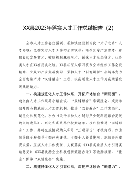 XX县2023年落实人才工作总结报告(2)全市人才工作会议强调,要加快建设新时代才子之乡人才高地,坚持党对人才工作的全面领导,瞄准主导产业聚才、着眼长远发展育才、破除机制瓶颈用才、做优人才生态留才,让各类人才在XX有用武之地。XX县将深入学习贯彻全市组织工作会议精神,立足XX产业发展实际,紧扣人才引育用留全链条发力全面实施产才双链融合工程,以高质量人才工作为高质量发展赋能助力。一、构建规范化人才工作体系,开拓产才融合新局面。建立由人才工作领导小组会议、双链融合季调度会、成员单位月例会构成的人才工作机制,推动双链融合工作常态化、制度化和规范化。出台《关于推动人才链与产业链深度融合发展的实施意见》,制定各成员单位权责清单,项目化推进双链融合工作,并将完成情况纳入每月三项评比考核内容,作为领导班子和领导干部评先评优、干部个人提拔使用、职级晋升重要依据,压实人才工作责任。兑现落实《XX县高素质人才引进实施意见》《XX县鼓励企业科技创新奖励办法》等激励政策,重金保障双链融合实施。二、构建精准化人才引育体系,深挖产才融合新潜力。紧紧围绕经济社会发展大局和企业紧缺人才需求,建立动态更新的引才目录,发挥塑料制品、电子信息、中医药、制种等特色产业吸引集聚人才作用,多渠道拓宽校地校企合作,力争引培一批人才、带来一批团队、做大一批产业。聚焦塑料制品、电子信息等主导产业,在企业设立大学生实习实训基地、在职校开设订单班,力争每年为企业引培技术人才300名;聚焦马术体育等新兴产业,依托良马繁育专家工作站,引进专业团队、培养马术人才,积极打造马术品牌赛事,同步配套赛事嘉年华、农特产品展销、文旅推介等活动,提升人口集聚效应;聚焦乡村振兴重点任务,深入实施人才支持乡村振兴三百工程,大力推广一村一员特派服务,依托各地特色乡贤馆,讲好乡贤故事、增进情感认同,吸引和凝聚乡贤反哺桑梓;聚焦教育医疗等民生领域,持续深化医联体建设,鼓励用人单位打破地域、人事关系等限制在不突破总量的前提下,加快推进教师、医师编制县域统筹,畅通人才流动渠道。三、构建多元化人才创新体系,激活产才融合新动能。拓展百博进百企引才行动,建立XX县高层次人才工作驿站,靶向引进30余名博士专家人才,组建科技创新智能团实施重大科技项目揭榜挂帅,把好项目筛选、人才甄别、成果评鉴、市场转化等关键环节,制定《揭榜挂帅科技项目和资金管理实施意见》,细化入榜项目的技术指标、过程周期、奖励金额、结项方式等指标,保证揭榜成效。实施省级创新平台创建清零行动,提前研判国家、省、市平台创建政策,整理项目申报指南,组建项目申报工作专班,组织人才专员入企宣传,及时兑现平台奖励,提高企业申报积极性。启动专家工作站海智计划工作站申报推荐工作,邀请专家全流程指导。推荐企业参加各类创新创业大赛,鼓励支持企业加强横向技术交流。四、构建立体化人才服务体系,形成产才融合新生态。树立不拼重金、拼环境的工作理念,把优化人才发展环境作为基础性工程抓实抓好。强化人才服务保障,为重点企业和产业领军人才配备一名人才服务专员,提供一对一人才服务。落实党委联系服务专家制度,发挥高层次人才联谊会作用,举办高层次人才大讲堂等活动,引导专家人才参与重大项目咨询论证、重大政策规划制定和重点工程建设。推进人才工作信息化建设线上一站式人才综合服务平台,简化流程、及时兑现人才奖励,落实住房保障、医疗待遇、子女入学、家属就业等关心关爱政策。设立人才荣誉制度,表彰一批突出贡献人才,编印《XX优秀人才风采录》,树立人才先进典型。大力宣传报道优秀人才先进事迹,营造识才、爱才、敬才、用才的社会环境,让人才绽放更大的光芒。