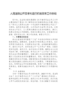 人民法院公开及审判运行机制改革工作总结近年来,县法院为落实最高院《关于推进司法公开三大平台建设的若干意见》和《审判权运行机制改革试点方案》要求,以努力让人民群众在每一个司法案件中都感受到公平正义为目标,始终把司法为民、公正司法作为各项工作主线,以促进社会公平正义、让人民群众满意为出发点和落脚点,满足人民群众对司法公开新期待,积极回应群众关切,自觉接受社会监督,提升司法公信,树立司法权威,彰显公平正义。一、主要做法和经验结合全省法院审判管理三化年活动及审判权与审判机制改革规划,按照县委、县政府关于特色亮点工作要求,充分利用现代信息技术,打造阳光司法工程,全面推进审判流程公开、裁判文书公开、执行信息公开三大平台建设,全面实现审判流程、裁判文书、执行信息公开透明,增进社会公众对司法的了解、信赖和监督,使司法公开三大平台成为展示现代法治文明的重要窗口、保障当事人诉讼权利的重要手段、履行人民法院社会责任的重要途径。同时,通过建立符合司法规律的审判权运行机制,消除审判权运行机制的行政化倾向,最大限度地满足人民群众对公平正义的需求,不断提高司法公信力,利用司法公开形成倒逼机制,促进广大干警深化认识,更新观念,提高司法能力和水平,提升审判执行工作质量和效率。(一)主要做法为进一步强化司法公开力度和效果,2023年年初,县法院出台了《关于推进司法公开三大平台建设的工作规划》,就审判流程公开平台建设、裁判文书公开平台建设、执行信息公开平台建设的具体内容、特色举措、任务分解做了详细的规定。1.建立审判流程公开平台。以政务网站为基础平台,通过手机短信、电话语音系统、电子触摸屏、微博等技术手段,为公众和当事人提供全方位、多元化的司法服务。向公众公开以下信息:(1)法院地址、交通图示、联系方式、管辖范围、下辖法庭、内设部门及其职能、投诉渠道等机构信息;(2)审判委员会组成人员、审判人员姓名、职务、法官等级等人员信息;(3)审判流程、裁判文书和执行信息的公开范围和查询方法等司法公开指南信息;(4)预约立案、立案条件、申请再审、申诉条件及要求、诉讼流程、诉讼文书样式、诉讼费用标准、缓减免交诉讼费用的条件和程序、诉讼风险提示、可供选择的非诉讼纠纷解决方式等诉讼指南信息;(5)审判业务文件、参考性案例等审判指导文件信息;(6)开庭公告、听证公告等庭审信息;(7)人民陪审员名册、特邀调解组织和特邀调解员名册和评估、拍卖及其他社会中介入选机构名册等名册信息;(8)其他适宜公开的信息。2.建立审判流程查询系统。整合各类审判流程信息,建设外网审判流程查询系统,方便当事人查询案件进展情况,增加审判工作透明度,最大限度压缩信息寻租的空间。从立案受理环节开始,当事人可凭密码从审判流程公开平台获取以下信息:(1)案件名称、案号、案由、立案日期等;(2)合议庭组成人员的姓名、承办法官与书记员的姓名、办公电话;(3)送达、管辖权处理、财产保全和先予执行情况;(4)庭审时间、审理期限、审限变更、诉讼程序变更等审判流程节点信息。3.发挥审判流程公开平台功能。充分发挥审判流程公开平台在远程预约立案、公告、送达、庭审、听证等方面的辅助功能。(1)推进审判工作信息化。大力推进网上办案,切实提升审判工作效率,节约司法成本,减轻当事人讼累;积极推进诉讼档案电子化工程,方便当事人、诉讼代理人、辩护人或其他相关部门查阅、复制诉讼档案。(2)推进庭审公开。依托各类审判流程公开平台,积极创新庭审公开方式,对依法应当公开开庭审理的有重大社会影响、社会公众关注或具有典型法制宣传教育意义的案件以视频、音频、图文、微博等方式适时进行庭审直播,公开庭审过程;在审判流程公开平台公布开庭公告、听证公告。(3)推进庭审音像资料保存利用。加强科技法庭建设,对庭审活动全程进行同步录音录像,逐步实现每庭必录,方便当事人依法查阅,为上诉审、监督审评判案件是否公正审理提供原始资料和客观依据。4.稳妥推进《关于审判权运行机制改革的实施意见(试行)》。成立由审判机制改革领导小组,由院长担任组长,组织本院按照《关于审判权运行机制改革的实施意见(试行)》落实改革工作,并指定政治处、审管办等部门及人员负责具体工作。领导小组定期听取审判机制改革工作汇报,及时解决工作的问题。(二)主要经验县法院围绕高标准、严要求、创一流的目标,加强沟通,强化保障,大力推进司法公开三大平台建设,取得了良好的开局。主要经验是:1.领导重视、多方沟通,为三大平台建设提供良好环境。三大平台建设作为一项系统工程,需要巨大的财力、物力、人力支持。为此,县法院开展了全面、广泛又富有成效的协调沟通工作。一是加强外部沟通,为三大平台建设汇聚强大的支持力量。开展专题汇报。县法院高度重视与县委、政府和上级法院的沟通协调工作,将三大平台