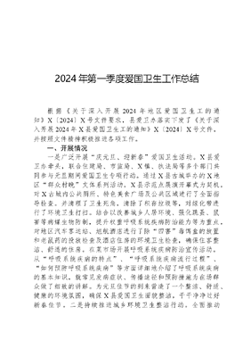 2024年第一季度爱国卫生工作总结根据《关于深入开展2024年地区爱国卫生工的通知》X〔2024〕X号文件要求,县爱卫办落实下发了《关于深入开展2024年X县爱国卫生工的通知》X〔2024〕X号文件,并按照文件精神积极推进各项工作。一、开展情况一是广泛开展庆元旦、迎新春爱国卫生活动。X县爱卫办牵头,联合住建局、市监局、X镇、执法局等多个部门共同参与元旦期间爱国卫生专项行动。通过X县古城举办的X地区群众村晚文体系列活动,X县示范点展演开幕式为契机,对X古城内公共厕所、特色美食广场及公共区域进行了全面指导检查。并清理了卫生死角,清除了积存垃圾等,对绿化带进行了环境卫生打扫。结合以改善城乡人居环境、强化跳蚤、鼠害等病媒生物防制,提升权重呼吸系统疾病防治能力等为重点,对地区汽车客运站、旭航酒店进行了除四害毒饵盒的放置和老鼠药的投放检查及酒店住房的环境卫生检查,确保住客整洁、舒适的住房。在菜市场开展呼吸系统疾病防治宣传活动。从呼吸系统疾病的特点、呼吸系统疾病流行过程、如何预防呼吸系统疾病等方面详细地介绍了呼吸系统疾病的基本知识,就常见发病症状、传播途径和预防措施为在场群众做了细致的讲解。为元旦佳节的到来营造了一个整洁、舒适、健康的环境氛围,确保X县爱国卫生面貌整洁,干干净净过好新春佳节。二是持续推进城乡环境卫生整洁行动。全面推动无垃圾城市打造建设,以创新、协调、绿色、开放、共享的新发展理念为引领。组织全县120个单位以周五我行动·志愿服务活动每周五常态化卫生大扫除活动。对两侧人行道、绿化带、及偏僻街道存在的烟头、纸屑、塑料袋等各类垃圾进行清理。广泛动员干部群众参与到爱国卫生运动中,推出爱国卫生红黑榜通报13期。开展春节期间爱国卫生宣传活动2场次,动员发动党员干部群众4800人次,清理脏乱死角38余处,清除乱堆及乱放物品约11吨。大扫除共覆盖9个社区60余个小区。组织13个乡(镇)清理乱搭、乱堆、乱放、乱倒8场次,集中居民开展室内外卫生清洁活动12场次,确保农村营造良好的春节氛围。三是扎实推进卫生(健康)创建工作。巩固自治区卫生县城创建成果。加大三级卫生创建力度,做好2024年全国、自治区、地区卫生(健康)创建推荐工作。持续巩固自治区卫生城镇成果,提升卫生创建水平,做好卫生创建工作。X县X镇人民政府为做好国家卫生乡镇创建工作夯实基础,2024年新申创一批自治区级卫生村、单位、乡(镇)和地区级健康细胞工程。X县年底启动创建国家卫生县城工作。四是推进健康X建设,提升群众健康水平。制定了X县开展第36个爱国卫生月活动计划,推动县域内有序开展爱国卫生运动活动,着力改善人居环境,有效防控传染病和慢性病,提高群众健康素养和全民健康水平,进一步推进X县爱国卫生运动和健康X行动。各乡(镇)人民政府、县直各单位并按照文件要求开展第36个爱国卫生月活动。二、存在的问题一是辖区企业配合力度不够。对整治工作重视程度不够、相互配合成效不明显。二是X县各物业公司对爱国卫生工作重视程度不够,普遍存在地下室环境卫生脏乱差现象。建议切实加强物业公司的管理力度,坚决杜绝物业只收费不作为、乱作为的现象;各小区物业要切实履职尽责,切实开展好小区内绿化带绿地的种植工文可居文库——海量学习资料,手机电脑均可下载www.wenkeju.com作,管理好绿地绿植,做好小区内卫生保洁工作,按时进行消杀。三、下一步计划(一)持续推进城乡环境卫生整洁行动。把城乡环境卫生整洁行动纳入到新型城镇化、美丽乡村建设等工作中,(二)全面推进第37个世界无烟日控烟行动。组织开展第37个世界无烟日系列宣传活动,倡导健康文明的生活方式。积极落实控烟行动,推行公共场所禁烟,强化监督管理,积极推进地方性控烟法规建设。持续巩固创建成果。(三)积极开展卫生(创建)申报创建工作。巩固自治区卫生县城创建成果。加大三级卫生创建力度,做好各项卫生(健康)创建工作。(四)继续推进农村改厕项目工作。深入实施农村改厕技术指导工作,对2024年全县计划新改建的农村卫生厕所进行指导。(五)开展病媒生物防制。疾控中心做好四害密度监测工作,巩固除害达标成果,提高科学除害水平。加强病媒生物孽生地清除消灭工作,有效控制病媒生物密度。(六)大力开展健康教育工作。采取发放《爱国卫生运动倡议书》、制作宣传栏、悬挂横幅、刊播宣传视频等方式,号召广大人民群众积极参与到爱国卫生运动中来,全面推进幸福X建设。文可居文库——海量学习资料,手机电脑均可下载www.wenkeju.com