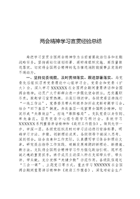 两会精神学习宣贯经验总结局把学习宣贯全国两会精神作为当前首要政治任务和长期战略任务,坚持高站位谋划部署、高标准组织实施、高质量推进落实,切实将全国两会精神转化为推进消防救援事业发展的不竭动力。一、坚持党委统揽,及时贯彻落实。跟进部署落实。局党委先后组织召开党委理论中心组学习会、党委会和党委(扩大)会,深入学习XXXXXX在全国两会期间重要讲话和全国两会精神,动员广大干部群众进一步强化使命担当,忠实履职尽责,掀起学习宣贯热潮。示范引领送学。各级党委坚持践行一线工作法,党委委员带头积极参加所在支部专题学习会,结合四下基层制度,奔赴基层一线宣贯全国两会精神,切实形成头雁效应,打造雁阵格局。支队党委以身作则、率先垂范,召开党委中心组专题学习研讨会,系统学习XXXXXX系列重要讲话精神和《政府工作报告》,做到先学一步、学深一层。各级党组织及时对学习活动进行安排部署,明确学习方法、步骤。创新理论成果。各级领导干部深入思考、深刻领会,结合自身和工作实际,认真撰写学习体会和理论文章,研究提出指导工作实践、破解发展难题的新理论、新措施、新方法。支队将全国两会精神学习作为强化政治引领、筑牢忠诚之魂的重要抓手,班子成员主动深入所在支部带头学、带头讲、带头做,充分发挥关键少数示范作用。各级队伍通过三会一课、主题党日等方式,重点学习XXXXXX在全国两会期间重要讲话精神和《政府工作报告》,深化对安全生产工作相关部署的理解和把握,引导干部群众以高度的责任感和使命感,推动学习教育在队伍内部落实落地。二、强化组织引领,周密组织实施。统筹一体施划。将学习宣贯全国两会精神纳入政治工作要点,研究制定《学习宣贯全国两会精神实施方案》,与巩固拓展主题教育成果、学习践行XXXXXX重要训词精神、学思想、践训词、促改革、建新功主题教育活动结合起来,科学统筹、一体推进。融入培训体系。将全国两会精神列入年度思想政治教育、党课教育及人员培训课程,邀请x大学马克思主义学院巩茹敏教授来队辅导授课,主动对接省委党校,筹办处级干部专题培训班,推动全国两会精神在队伍内部生根发芽。搞活阵地载体。充分发挥板报橱窗、LED大屏、营区广播等传统教育宣传阵地作用,组织开展全国两会主题板报展评活动,邀请代表委员深入基层队伍宣讲,解读全国两会精神新思想新观点,提升干部群众理论学习的积极性和创造性。组织干部群众利用电视、广播、学习强国APP等载体收听收看全国两会盛况,认真聆听《政府工作报告》,深读细研评论员文章解读,深入理解全国两会精神实质。组织开展走近全国两会代表主题活动,组织机关党支部书记走进东北轻合金有限责任公司,与全国人大代表x面对面交流,畅谈学习全国两会精神重大意义和丰富内涵。三、把握精神实质,聚焦主责主业。深学细照笃行。坚持对照联系党的XXX报告对应急管理工作的战略部署、联系XXXXXX视察考察四川重要讲话精神、联系全省两会精神、联系队伍建设发展实践深学细研,自觉把消防工作置于贯彻总体国家安全观,置于平安x建设的战略布局思考定位。聚焦任务实际。坚持从实际、从任务、从岗位出发,深化贯彻落实的结合点、切入点和着力点,重点对标XXXXXX关于因地制宜发展新质生产力充分解放和发展新质战斗力等重要论述,统筹推进治本攻坚三年行动、打通生命通道等专项工作,最大限度发挥特勤力量、冰雪救援、山岳水域等专业队伍实战文可居文库——海量学习资料,手机电脑均可下载www.wenkeju.com效能。积极发挥青年理论学习小组作用,采取训练间隙看一看,饭前饭后聊一聊,文体活动带一带,周末假日背一背等方式,围绕全国两会关键词和金句谈体会、谈认识、谈举措,将全国两会精神的学习融入干部群众点滴日常,在潜移默化中使全体干部群众掌握精髓要义。规划目标蓝图。科学制定2024年局15项党委工程、26项全省工作要点和45项大项重点工作目标任务三项任务书,一项一项抓落实、抓兑现、抓问效,更好统筹发展和安全,切实以高水平消防安全保障高质量发展,奋力谱写xx事业新篇章。文可居文库——海量学习资料,手机电脑均可下载www.wenkeju.com