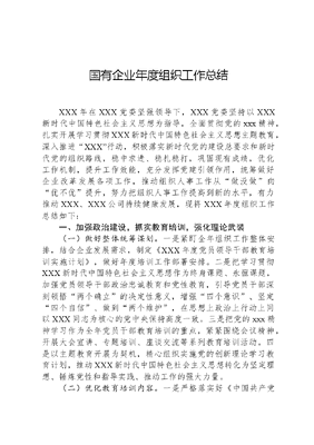 国有企业年度组织工作总结XXX年在XXX党委坚强领导下,XXX党委坚持以XXX新时代中国特色社会主义思想为指导,全面贯彻党的xxx精神,扎实开展学习贯彻XXX新时代中国特色社会主义思想主题教育,深入推进XXX行动,积极落实新时代党的建设总要求和新时代党的组织路线,稳中求进、稳扎稳打,巩固现有成绩,优化工作机制,提升工作效能,充分发挥党建引领作用,统筹做好企业改革发展各项工作,推动组织人事工作从做没做向优不优提升,努力把组织人事工作提高到新的水平,有力推动XXX、XXX公司持续健康发展,现将XXX年度组织工作总结如下:一、加强政治建设,抓实教育培训,强化理论武装(一)做好整体统筹谋划。一是紧盯全年组织工作整体安排,结合企业发展需求,制定《XXX年度党员领导干部教育培训实施计划》,做好年度培训工作部署安排。二是把学习贯彻XXX新时代中国特色社会主义思想作为终身课题、永恒课题,加强党员领导干部政治忠诚教育和党性教育,引导党员干部深刻领悟两个确立的决定性意义,增强四个意识、坚定四个自信、做到两个维护,在思想上政治上行动上同以XXX同志为核心的党中央保持高度一致。三是把党的xxx精神学习作为全年党员干部教育培训的重点,紧紧围绕会议精神,开展大会宣讲、专题培训、座谈交流等系列教育培训活动。四是以主题教育开展为契机,精心组织实施党的创新理论学习教育计划,推动XXX新时代中国特色社会主义思想转化为坚定理想、锤炼党性和指导实践、推动工作的强大力量。(二)优化教育培训内容。一是严格落实好《中国共产党党员教育管理工作条例》,落实好政治理论教育、政治教育和政治训练、党章党规党纪教育、党的宗旨教育、革命传统教育、形势政策教育、知识技能教育等xxx个方面的基本任务,对党员进行系统教育培训。二是结合主题教育,围绕党的建设和XXX、XXX公司发展中心工作,紧扣两家全年发展的重大时间节点和部署安排,聚焦XXX建司xxxxxx周年庆祝活动,有针对性地开展党员教育培训。(三)抓实党员教育培训。一是组织下辖四个党支部xxxxxx名积极分子参加XXX党委举办的XXX年入党积极分子培训班,进一步加强对入党积极分子的培养、教育和考察,切实提高入党积极分子的政治素质和理论修养,确保发展党员质量。二是组织xxx名新发展党员参加XXX年新发展党员集中轮训班,进一步加强新党员教育和管理工作,提高新党员党性修养和思想政治素质,强化新党员理论学习和贯彻党的路线方针政策的自觉性。三是组织全体党员及主管层以上干部xxxxxx人参与XXX党委举办的XXX年党员网络培训班,进一步加强党员干部理想信念、提升党性修养,提高党员干部队伍综合素质和能力,更好地服务于企业的高质量发展。二、坚持正确导向,强化骨干队伍,激发干部活力(一)树立正确选人用人导向。一是着眼建设堪当民族复兴重任的高素质干部队伍,落实新时代好干部标准,坚持党管干部原则,切实发挥党委领导把关作用,进一步完善干部动议到民主推荐、考察、讨论决定等各环节的严肃性规范性,切实把好干部选出来用起来。XXX年,XXX党委严格按照干部选拔相关管理制度,程序规范,公开透明,提拔XXX主管级干部xxx名。二是严把政治首关,重基层、重实干、重担当、重实绩,大力选拔踏实工作、业务能力和工作业绩突出的好干部,做到吃苦者吃香、有为者有位、优秀者优先。(二)加强干部队伍能力建设。一是把能力建设摆在更加突出的位置来抓,加强实践锻炼、专业训练,引导干部在干中文可居文库——海量学习资料,手机电脑均可下载www.wenkeju.com学、学中干,加强斗争精神和斗争本领养成,增强干部推动高质量发展本领、服务群众本领、防范化解风险本领。二是强化干部人才培养。坚持把发现培养选拔优秀年轻干部作为一项战略任务,由满足近期需要向重视战略发现培养转变,由偏重选向统筹选、育、管、用转变。大力弘扬工匠精神、依托重点工程,引导青年骨干人才在吃劲负重的工作中经受摔打、干出业绩,多维度锻造人才干事创业的真本领、硬本领。三是激活干部监督效能。构建管思想、管工作、管作风、管纪律的监督管理体系,坚持管在日常、严在经常。严格落实党员干部出入境证件管理要求,党员干部兼职审批和外出请销假管理制度,落实好主管级干部个人有关事项报告的监督管理,全面完成现有干部人事档案的专项审核,推动档案审核管理制度化常态化。四是持续完善干部考核评价体系,注重政治素质考察,强化抓改革、强党建、促发展的鲜明导向,重点突出提升政治素质、践行高质量发展、加强执行力建设、作风建设和抓党建工作等方面内容,将专项考察和日常考核、年度综合考核相结合,把主管层干部考准考实,提高组织部门分析研判干部的科学性和精准性。XXX年组织完成对XXX、XXX公司主管层干部xxxxxxxxxxxx年