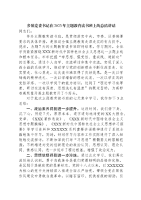 乡镇党委书记在2023年主题教育读书班上的总结讲话同志们:举办主题教育读书班,是贯彻落实中央、市委、区委部署要求的具体举措,是推动全镇主题教育走深走实的有力抓手。现在,为期7天的主题教育读书班即将结束,学习期间,全体学员紧紧围绕XXX新时代中国特色社会主义思想这一主题主线和根本任务,牢牢把握学思想、强党性、重实践、建新功的总要求,通过个人自学、交流研讨和集中交流,实现了深入而全面的系统学习,推动学习党的创新理论不断往深里走、往实里走、往心里走。这次读书班取得了良好效果,是一次以学铸魂的精神洗礼、一次以学增智的理论武装、一次以学正风的党性淬炼、一次以学促干的能力培训,达到了理论学习有厚度、研讨交流有深度、思想洗礼有温度的既定目标,为高标准高质量开展主题教育开了个好头。对于此次主题教育读书班的七天集中学习,我作如下3点总结:一、政治素养得到进一步提升。这段时间,我们俯下身、沉下心,历经7天,原原本本、逐字逐句地对党的XX大报告、党章、《XXX著作选读》、《XXX新时代中国特色社会主义思想专题摘编》、《XXX新时代中国特色社会主义思想学习纲要》等学习资料和XXXXXX系列重要讲话精神进行了系统全面地集中学习,同时,针对学习内容和工作实际进行了深入细致地交流探讨,不断加深我们对习思想精髓要义的理解把握,不断增进对党的创新理论的政治认同、思想认同、理论认同、情感认同,进一步筑牢了理论根基,增强了政治定力。二、思想觉悟得到进一步淬炼。通过此次学习,我们再次深刻地认识到,勇于自我革命是我们党最鲜明的品格和优势,是区别于其他政党的显著标志。党的十八大以来,以XXXXXX为核心的党中央持续深入推进全面从严治党,带领全党在聚焦作风建设中勇敢自我革命,以踏石留印、抓铁有痕的韧劲,引领全党持续纠风治弊、清瘴治疾,一以贯之、步步深入、久久为功,党风政风焕然一新、社风民风持续向好、党心民心空前凝聚,以伟大自我革命推动伟大社会革命取得了历史性、开创性成就。通过此次主题教育读书班的集中学习,我们的党性能力得到了进一步的锤炼,政治思想觉悟得到了进一步的提高,我们应始终牢记作风连着党风,关系人心向背,严守政治纪律和政治规矩,持续淬炼过硬作风,以实际行动赓续好传统、弘扬新风尚。三、责任担当得到进一步增强。通过此次主题教育读书班的学习,我们进一步坚定了要把工作做实做精做细的信心和决心,激发了干事创业的热情干劲,我们要积极适应新形势下新农村工作的新特点和新要求,切实把学习成果转化为坚定信念、淬炼品格、推动工作高质量发展的不竭动力。同志们,读书班只是全镇主题教育活动的一个开始,学习习思想是一项重大的政治任务和长期的战略任务,接下来,要持续在学懂弄通做实上下功夫,坚持把加强党的创新理论武装作为首要任务,以高度政治责任感、高标准高质量开展好主题教育。下面,我讲几点意见:1.坚持把理论学习贯穿主题教育始终。通过这次读书班,大家的思想水平得到了提高,理想信念进一步筑牢,在接下来的主题教育中,一是要坚持读原著学原文悟原理,全面学习领会XXX新时代中国特色社会主义思想的科学体系、精髓要义、实践要求,以及对本领域提出的新理念、新战略、新要求,将本领域工作与理论学习巧妙融合、举一反三;二是要抓实抓好基层党组织主题教育工作,各班子成员要督促联系党支部根据实际制定学习计划,明确学习内容、学习形式、时间安排等事项,依托三会一课、主题党日、龙沙讲堂等形式,引导党员、干部认真学习领会XXXXXX有关重要讲话精神,紧密联系岗位职责和工作要求,推进主题教育走深走实。2.切实把调查研究落实到为民服务上。态度决定成效,起步影响结果。之前,我们通过召开党委会讨论研究了各领导班子成员的主题教育调研课题,其中有1正1反典型案例调研。我们一是要紧盯问题、扑下身子,转变作风、深入基层,到群众困难多、意见集中、工作打不开局面的地方去,深化调查研究推动解决发展难题,推动党员、干部将焕发出来的学习、工作热情转化为攻坚克难、干事创业的强大动力。二是要强化调查研究,构建发现问题、解决问题、督查回访闭环工作体系,在把脉问诊、解剖麻雀、难题排查中梳理形成一批问题清单、责任清单、任务清单,并建立调研成果转化运用清单,真正确保调研有成效、出成果;注重从问题建议中梳理举措,从先进经验中提炼经验,切实将调查研究变成开阔视野、查找差距、完善思路、推动发展的强大动能。3.持续抓作风建设激励干部担当作为。坚持问题导向,带着问题去矛盾困难最多的地方,去收获真知灼见。坚持人民路线,到人民群众意见较多、困难最大的地方,用党员干部的辛苦指数换群众的幸福指数。坚持刀刃向内,深入查摆不足,整改整治问题,确保取得实际成效。实干兴邦,苦干兴业。接下来,我们一是要发挥组织优势,扎实做好主题教育活动走深走实,各领导班子成