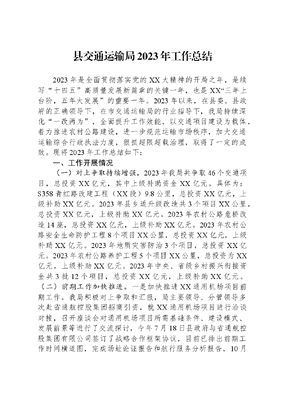县交通运输局2023年工作总结2023年是全面贯彻落实党的XX大精神的开局之年,是续写十四五高质量发展新篇章的关键一年,也是XX三年上台阶,五年大发展的重要一年。2023年以来,在县委、县政府的正确领导下,在市交通运输局的行业指导下,我局持续深化一改两为,全面提升工作效能,以交通项目建设为载体,着力推进农村公路建设,进一步规范运输市场秩序,加大交通运输综合行政执法力度,狠抓超限超载治理,取得了一定的成效。现将2023年工作总结如下:一、工作开展情况(一)对上争取持续增强。2023年我局共争取46个交通项目,总投资XX亿元,其中上级补助资金XX亿元。具体为:S358青红路改建工程(XX段)9.8公里,总投资XX亿元,上级补助XX亿元。2023年县乡道升级改造共3个项目XX公里,总投资XX亿元,上级补助XX亿元。2023年农村公路危桥改造14座,总投资XX亿元,上级补助XX亿元。2023年农村公路安全生命防护工程8个项目XX公里,总投资XX亿元,上级补助XX亿元。2023年地质灾害防治3个项目,总投资XX亿元。2023年农村公路养护工程5个项目XX公里,总投资为XX亿元,上级补助XX亿元。2023年中央、省级乡村振兴衔接资金共3批12个项目,总投资XX亿元,上级补助XX亿元。(二)前期工作加快推进。一是加快推进XX通用机场项目前期工作。我局积极对上争取和汇报,局主要领导、分管领导多次赴省通航控股集团招商引资,就XX通用机场项目进行洽谈对接,召开座谈会对通用机场项目所需基础条件、建设模式、发展前景等进行了交流探讨,今年7月18日县政府与省通航控股集团有限公司签订了战略合作框架协议,目前已排出前期工作时间横道图,完成场址论证报告和航行服务分析报告,10月17日县政府已行文上报中国民航华东局。二是加快推进宣东高速项目前期工作。我局积极对接、跟踪服务,目前已完成可研报告编制工作,正在开展土地预审、地质勘探和初步设计。三是加快推进G530XX至查桥(XX段)改建工程项目前期工作,已完成可研、初设审批,正在开展用地报批工作,10月8日完成施工和监理招标,计划年内开工建设。(三)项目建设全面提速。我局正月初八就召开了交通项目开工复工动员会,要求所有在建项目立即投入到紧张的施工状态。一是配合做好S358青红路(XX段)改建工程建设。加强与市公路管理服务中心对接,督促施工单位按照时间表施工,保障工程进度和质量,目前正在开展路基填挖方、涵洞和桥梁施工。二是加快推进县乡道升级改造项目建设。我局2023年县乡道升级改造工程共3个项目XX公里,其中X210仙牌路XX公里,正在开展路基施工;重兴至外重阳道路2.777公里,4月底已完工通车;七里坞至仙寓山公路升级改造项目XX公里,正在开展路基施工。三是加快实施农村公路危桥改造项目。我局2023年实施农村公路危桥改造14座,其中中桥6座,大桥1座,目前已全部完工。四是加快实施农村公路安全生命防护工程。我局2023年农村公路安全生命防护工程XX公里,目前已全部完工。五是加快实施地质灾害防治项目。我局2023年地质灾害防治含大山路、白石路、库山路3个项目,目前已全面完工。六是加快实施农村公路养护工程。我局2023年实施农村公路养护工程XX公里,目前已全部完工。七是2023年中央、省级乡村振兴衔接资金共3批12个项目,目前已全部完工。(四)质量监督常抓不懈。严格执行四制(项目法人制、招投标制、监理制、合同管理制),交通建设项目一律公开招标,每个工程都成立项目办,并实行领导联系项目制度。监理单位和检测单位招标也按照规定程序执行。对不符合质量要求的坚决返工。工程建设过程的监管按照县政府出台的政府投资项目建设管理5个办法和公共资源交易监督管理办法严格执行,不走样不出格。2023年以来,我局多次深入施工现场开展质量安全监督工作,完成竣工验收项目3个,协助建设单位完成交工验收项目14个。对发现的安全隐患和质量问题,现场提出整改建议60余条,及时下发《督查意见通知书》9份、《建设项目质量安全监督检查告知单》8份,督促参建各方及时整改到位。(五)运输服务提质增效。一是保障公路客运。认真组织实施了春节、五一、中秋国庆期间道路旅客运输安全保障工作,2023年春运共运送旅客XX万人次,无交通运输安全责任事故和旅客滞留发生。五一、中秋国庆期间,共临时调配应急公交车22辆和应急班线客车1辆,用于保障仙寓山和牯牛降等景区运力不足,圆满完成节假日期间运输服务保障工作。二是开展驾培市场专项整治。根据市交通运输局的部署和安排,召开专题会议对驾培市场专项整治工作进行了部署,制定了专项整治工作方案,深入志德驾校及其分训场地进行现场核查。对核查发现的问题,要求志德驾校对照行业标准落实整改,整改经验收仍不合格的,将依法予以取缔。三是积极