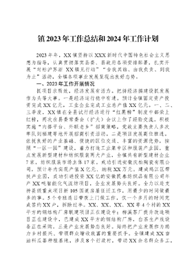 镇2023年工作总结和2024年工作计划2023年年,XX镇坚持以XXX新时代中国特色社会主义思想为指导,认真贯彻落实县委、县政府各项安排部署,扎实开展对标沪苏浙 XX镇见行动舍我其谁、由我负责、到我为止活动,全镇各项事业发展呈现出良好态势。一、2023年工作开展情况抓项目求质效,经济发展有活力。把拼经济搞建设抓发展作为头等大事。一是经济运行稳中有进。预计全镇固定资产投资完成XX亿元,工业企业完成工业总产值XX亿元。一、二、三季度,XX镇在全县试行经济运行红黑榜制度中都荣上红榜,两次在县委常委会(扩大)会议上作了经验交流。积极实施内搭平台、外联老乡招商策略,党政主要负责人多次率队到福建等地开展招商引资活动。二是项目发展高位推进。依托良好的产业基础、便捷的区位交通、丰富的资源优势,按照一区一园建设,着力打造工业集中区和服装产业园,重点发展新型建材和纺织服装两大产业,全镇共有新型建材企业7家,纺织服装市场主体17家。成功引进安徽庆松陶瓷有限公司,预计年内实现产值X亿元、纳税XX万元。建成鸠江区帮扶产业园,成功引进投资XX亿的安徽民泰纺织品有限公司年产XX吨智能化气流纺项目,企业发展势头良好。全力以赴支持县级重点项目新105国道房屋征迁工作,用最少的时间做最多的事。5个专班连日带夜上门做工作,仅一个多月的时间完成签约XX户,拆除过半。XX、XX、XX、XX等4个村的XX平方的钢结构厂房联建项目正在建设中;柳溪茶厂提升改造项目正在建设中,已建成XX平方的钢结构厂房,白茶生产线设备正在采购。三是产业发展势态良好。始终把产业发展作为助力乡村振兴、带领群众增收致富的重要抓手。全镇建成XX亩油料瓜蒌种植基地,涉及8个行政村,带动XX余名群众务工,人均增收XX元/年,村级集体经济今年预计增收XX万元。成功引进安徽中锦智纺有限公司,计划投资XX亿元,今年11月份开始投产,带动XX余名群众就业,月平均工资XX元左右,年增加集体经济收入XX万元以上。坚持生态宜居,乡村面貌有看头。牢固树立绿水青山就是金山银山的理念,全力打造生态宜居美丽XX。一是人居环境持续优化。常态化开展人居环境六乱整治行动,以镇村各主干道为起点,逐路、逐街、逐巷、逐片进行清理整治,重点清理背街小巷、房前屋后、村庄周围以及田边、路边、坑塘、沟渠等存在的卫生死角,全方位进行环境整治,完成卫生厕所改造295户。并成功举办全县农村人居环境整治现场推进会,并代表乡镇做交流发言。九龙湾人居环境整治点高质量完成,全县各兄弟乡镇和村多次到此交流学习。完成三德村九龙湾、黎咀、烽火村黎屋、柳溪村藕塘、紫庵村陈屋、金盆等6个美丽宜居自然村庄的建设,太阳陈祠、XX镇菜市场等7个人居环境整治项目完成建设。投资XX万元对XX河流域进行综合治理,实施岸堤绿化XX平方米、新增台阶式踏步XX处、修建健身步道XX余米。二是生态环境保障有力。坚决扛起政治责任,深入推进环境污染防治,积极开展饮用水水源地保护,持续深入打好蓝天、碧水、净土保卫战。积极推进机制砂石整治,规范建设居全县前列。持续推进河长制,严格落实林长制,巡林覆盖率达到100%,完成烽火、紫庵、青竹三个省级森林村庄创建工作。深入推进森林防灭火、秸秆禁烧等工作,目前无火点被上级通报。三是国土保护全力推进。严厉打击非法占地和违法建设行为,实地核查举证全时域动态监测图斑,积极协调解决农村宅基地矛盾纠纷。完成公益林中幼林抚育XX亩,油茶新造林XX亩。聚焦社会治理,乡村善治有势头。围绕创建平安XX这条主线,不断深化XX镇矛盾纠纷调解机制,群众的幸福感、安全感显著增强。一是矛盾纠纷化解有力。紧紧围绕八个转变和六个强化的工作机制,接待解答来访群众咨询XX人次,排查化解各类矛盾纠纷XX件,有效化解初信初访67件、信访积案2件,重复访4件。二是安全生产常抓不懈。扎实开展安全生产专项整治行动,组织开展群租房、醇基燃料、电焊等动火作业、受限空间作业等各类安全大排查12次,排查整改隐患XX处。大力开展防溺水系列宣传活动,发放防溺水宣传折页XX余份,召开夜校XX余场。三是基层治理持续深入。积极开展扫黑除恶、国家安全、防范养老诈骗等各类学习宣传。持续深入推进移风易俗,丧事活动落实三天办结率100%。扎实开展城乡困难群体法律援助民生工程,XX司法所协助申请、办理法律援助案件8件,解答法律咨询和接待群众来访XX余人次。组织XX名社区矫正对象参加教育学习10次、公益活动7次有序推进社区矫正工作。持续开展创文明典型树文明新风主题活动,每月评选尊孝道树新风等先进典型,乡风民风持续向好。增进民生福祉,人民生活有奔头。始终坚持以人民为中心的发展思想,持续改善和保障民生。一是基础设施持续补齐。申报实施联网路项目46个,建设里程XX公里,总投资X