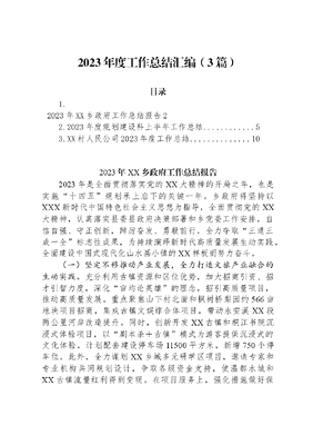 2023年度工作总结汇编(3篇)目录1.2023年XX乡政府工作总结报告22.2023年度规划建设科上半年工作总结53.XX村人民公司2023年度工作总结..102023年XX乡政府工作总结报告2023年是全面贯彻落实党的XX大精神的开局之年,也是实施十四五规划承上启下的关键一年。乡政府将坚持以XXX新时代中国特色社会主义思想为指导,全面贯彻党的XX大精神,认真落实县委县政府决策部署和乡党委工作安排,自信自强、守正创新,踔厉奋发、勇毅前行,全力夺取三通三成一全标志性成果,为持续演绎新时代高质量发展生动实践,全面建设中国式现代化山水画小镇的XX样板而努力奋斗。(一)坚定不移推动产业发展,全力打造文旅产业融合的生动实践。充分利用古镇资源和区位优势,加大招商引资、招才引智力度,深化亩均论英雄的理念,招引高质量项目,推动高质量发展。重点聚焦山下村北面和枫树桥梨园约566亩地块项目招商,集成古镇文娱综合体项目,带动永安溪XX段两公里河岸改造提升。同时,创新开发XX古镇和桐江书院沉浸式体验项目,以剧本杀+古镇模式为游客提供沉浸式的文化体验,计划配套建设停车场11500平方米,新增750个停车位。此外,全力谋划XX乡域多元研学区项目,邀请专家和专业机构共同规划设计,争取各级资金支持,使温都水城和XX古镇流量红利得到变现。在项目服务上,强化措施做好保障,确保平稳有序推进,确保按时完成阶段性目标。重点聚焦温都水城项目建设,加快推进项目红线外流转用地政策处理,努力追赶前期锚定的项目节点。为全域文旅项目融合发展,群策群力提供集成式服务。坚持对项目推进过程中遇到的问题进行集中化解,做到牵头领导、推进主体、配合单位全部到位,确保招商成果、谋划成果真正转化为发展成果。(二)坚定不移加强环境保护,全力打造擦亮生态名片的生动实践。坚持以XXX生态文明思想为指引,进一步加大蓝天、碧水、净土三大保卫战攻坚力度,着力解决突出生态环境问题,持续推进生态环境质量改善。严格执行生态功能区规划,大力开展违法占地建房整治工作。在人居环境整治过程中,不断完善《XX乡全域环境革命大行动方案》,以长效管理机制推动乡域人居环境水平有效跃升。持续巩固提升文明创建成果,严密规划建设集中供水、公厕修缮等项目,补齐基础设施短板。推进化肥农药减量增效,坚决遏制秸秆露天焚烧行为,进一步提高农作物秸秆和畜禽粪污资源化利用水平。加紧推进仙居县XX乡骨灰堂项目配套生态公墓建设落地落实。(三)坚定不移推进民生事业发展,全力打造构建幸福生活的生动实践。坚持最公正的低保动态管理制度,持续做好特困人群救助供养、基本生活保障、农村留守儿童、妇女和老年人关爱等工作。继续以拆旧建新整村推进的模式推进农房改造提升,优先将无房户和缺房户纳入统筹,拟安排屋基200余间。科学开展前期研究,全力推进仙居红旗渠XX段永丰堰修复工程,切实抓好水利设施功能恢复,筑好人民群众的生命渠幸福渠。继续做好就业、文化、教育、医疗、社保等民生工作,以更大力度、更实举措解决好人民群众最关心最直接最现实的利益问题,逐步补齐民生短板,用心用情用力解决好群众急难愁盼问题,真正让群众看到变化、见到成效、得到实惠。(四)坚定不移深化基层治理,全力打造树立善治典范的生动实践。坚持以网格智治提升基层治理的精细高效水平,充分发挥乡贤助调特色治理模式,深入开展信访反馈行动接触行动,尽力化解信访积案、解决群众合理信访诉求,重塑XX乡信访生态。严格落实安全生产责任制,全力抓好安全生产风险防控,强化市场监管,保障食品药品安全,营造安全放心的消费环境。完善突发事件应急处置机制,充分发挥安全、应急队伍的专业职能,提升防灾减灾救灾能力。以乡领导包片、各线条协调、行政村联动的方式,不定期开展各类隐患问题排查工作,甄别隐患问题程度,圈定整改措施和整改时限,有效把牢安全监管的主动权。各位代表、同志们,奋斗成就梦想,实干成就未来!让我们更加紧密地团结在以XXX同志为核心的党中央周围,在县委、县政府和乡党委的坚强领导下,锚定目标、勇毅前行、踔厉奋发、笃行不怠,以演绎新时代高质量发展生动实践,推动党的XX大精神在儒理XX落地生根,努力夺取全面建成中国式现代化山水画小镇XX样板的重要成就!2023年度规划建设科上半年工作总结2023年上半年,长泾规划建设科在镇党委、政府的正确领导下、相关部门的大力配合下,按照年初所列任务计划,制定详细工作方案,完善相关工作机制,全力保障工程质量,现将上半年度的主要工作总结如下:一、提升撤并乡镇人居环境河塘中学生活综合楼加固工程:已完成招投标工作,暑期开展施工。二、积极参与乡村振兴战略1、指导开展特色田园乡村创建工作:启动刘桥四本堂、叶家桥(河东)(河