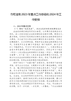 市司法局2023年重点工作总结和2024年工作安排一、2023年重点工作(一)围绕成效更显,法治示范引领作用发挥更充分法治政府建设典型作用充分彰显。以开展示范创建活动为契机,深入总结本地区法治政府建设的成绩和问题,精准发力、重点突破,切实把示范创建活动转化成推动法治政府建设的动力源泉,为全省乃至全国法治政府建设打造示范样板。坚持以创建促提升、以示范带发展,积极争创全国法治政府建设示范市,目前我市在全省18个申报地区(8个地级市、10个县市区)中脱颖而出,作为3个综合候选地区之一,已被省委依法治省办择优推荐上报至中央依法治国办。目前全市2个地区(项目)入选全国法治政府建设示范地区(项目),数量位居全省第一,3个县(区)入选全省法治政府建设示范地区,连续3年全省法治政府建设考核第一等次,形成先进带后进的创建机制,促进法治政府建设区域协同推进。领导干部这个关键少数抓紧抓实。推行领导干部年度考核、委员会会议述法、专题集中评议等三种述法模式,实现市、县、镇三级党委政府及部门党政主要负责人述法全覆盖。在全省率先打造XX市行政机关智慧应诉系统,建立诉前应诉+诉中评价+诉后履行全流程管理体系,围绕规范性、合法性、社会效果等进行总体评价,形成行政应诉与规范执法良性循环。推进行政机关建立庭前应诉准备机制、重大行政争议诉前沟通协商与诉后总结评估机制。将法治建设纳入市委巡察内容,对法治建设责任落实和执法、司法、守法普法中的问题,实行一并巡察、一并反馈、一并整改。以法治督察推动形成制度规范的做法得到中央依法治国办肯定,并在全国推广。XXX法治思想学宣贯研不断深入。将XXX法治思想纳入各级各部门党委(党组)理论学习中心组年度学习计划,市县镇三级党委(党组)理论学习中心组常态化开展XXX法治思想学习。市委理论学习中心组多次邀请专家学者来芜,举办专家报告会。创新XXX法治思想线上+线下学习模式,在全市开展XXX法治思想学习分享交流活动,线上借助大江看看APP邀请中央党校卓泽渊教授对《XXX法治思想学习纲要》进行解读,线下组织党员干部在全市8个书房及军营同时举行读书分享活动,当天线上直播总观看人数超过3万。立足法治XX建设课题研究、法治业务培训、专门法治人才队伍培养等领域,与安徽师范大学法学院深化政校合作模式,合作共建XX市法治研究院。(二)围绕发展更优,一流法治化营商环境营造更有效法治化营商环境成果持续巩固深化。2023年,XX市人民政府、南陵县人民政府、XX市司法局、XX市数据资源管理局获评全省优化营商环境工作优秀单位。开展法治化营商环境提档升级行动,紧盯全市制约和影响营商环境症结,从组织架构搭建、重点项目推进、督查考核问效等方面强化制度设计,建立健全政策梳理、台账管理、调度推进、督察督办等常态化营商环境工作运行机制。推动成立市破产管理人协会,与阿里资产签署战略合作协议,共同打造安徽省首个重整投融资平台。全国律协破产与投资法律实务业务交流会在安徽XX成功举办。制定XX市打造一流法治化营商环境助力省域副中心城市建设工作举措,推出探索建立涉企政策全流程服务机制聚力提供精准化、精细化公共法律服务等具体举措。同上海市闵行区签订友好协议,从实施跨区域法律服务普惠项目、法治建设能力提升等六个方面开展深度合作。共建沟通联系机制、一体化推进法治环境和法治民企建设获评司法部典型事例。首位产业建设坚实法治保障。整合全市律师、公证、仲裁等力量,成立包括新能源汽车和智能网联汽车产业的十大新兴产业法律服务团,为经营决策、项目实施等提供法律咨询和法律服务。组织律师深入企业,开展民营企业法治体检活动,开展惠企暖企普法先行主题普法宣传。推动将智能网联汽车与无人驾驶装备应用管理办法列入市政府规章论证类项目,通过完善法律法规制度体系,规范道路测试与示范应用及其商业化落地。工信部在第六届中国国际进口博览会期间举办的法治护航制造业高质量可持续发展国际论坛上,XX市司法局被司法部指定作为全国司法行政系统唯一代表作经验交流。与省律协、奇瑞公司等共同举办新能源汽车和智能网联汽车法律问题研讨会,共同探讨研究新能源汽车和智能网联汽车产业发展中面临的相关法律问题。设立安徽深蓝(自贸试验区XX片区)律师事务所,作为全省首家自贸试验区律所,将发挥专业先锋作用,在服务自贸试验区建设上发挥专业、特色服务优势,为区域经济发展做好法律服务工作。惠企政策网上超市率先搭建。在全省率先开展依法推进公共政策兑现创优法治化营商环境工作,不断健全政策制定—兑现—评估—反馈体系,做到政府承诺一定履约、出台政策一定兑现、企业有求一定回应、企业有理一定维护,试点工作入选全国法治政府建设示范项目,在国务院第5次廉政工作会议作经验交流。搭建惠企政策网