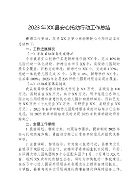 2023年XX县安心托幼行动工作总结根据工作安排,现将XX县安心托幼暖民心专项行动工作总结如下:一、工作进展情况(一)年报目标任务完成情况今年我县安心托幼任务是新增托位数XX个,完成10%幼儿园托幼一体化建设,新增公办学位XX个,实现幼儿园延时服务全覆盖。目标完成情况:新增托位XX个,完成率100%;托幼一体化幼儿园完成27个,占比11.4%;新增学位XX个,完成率100%;2023年全县235所幼儿园延时服务实现全覆盖。(二)补助政策落实情况我县统筹学前教育转移支付资金XX万元、省级资金100万元,县级资金XX万元,共计XX万元,用于兑现公办幼儿园生均公用经费和普惠性民办幼儿园补助提标部分。目前已支付XX万元(中央资金XX万元、省级资金XX、县级资金XX万元),2023年春季学期幼儿园延时服务政府补贴部分已全部兑现,待2023秋季学期结束及时兑现2023年秋季学期政府补贴部分。二、主要工作举措1.提前谋划,制定方案。对照省市要求,提前制定2023年安心托幼实施方案。目前该方案已征求各单位意见并报发改委审核。2.注重调研、督促指导。针对安心托幼行动,县教育元旦前就召开城区幼儿园会议,安排部署春季招生托班问题,乐行、东风两大幼儿园集团共9个小区配套园于1月、7月通过XX之窗、视听XX发布托班招生公告。同时为加快托幼一体化建设,在石弓中心幼儿园召开现场会并利用充分上级资金建设托班。开学前,县教育局多次现场调度托班准备情况和延时服务工作,确保开学后托班和延时服务顺利开展。3.强化督导、督促落实。我县已把安心托幼专项行动开展情况纳入县对镇街教育督导考核,同时县人民政府教育督导委员会同教育局对全县安心托幼落实情况开展督查。三、困难和问题1.家长参与托班的积极性不高。从春季招生情况看,9所小区配套园,因收费(每月1000元/生)及宣传力度原因,仅3所园招生的幼儿可以开设班级。2.开设托班师资不足。因幼儿教师紧缺,开设托班需要师资均由幼儿园自费从社会招聘,各园经费压力较大。3.公办托幼一体化幼儿园备案难。因托幼一体化幼儿园备案需独立法人,目前我县除东风、乐行为独立法人外,其余园所(包括小区配套园)均无独立法人。四、下步打算1.持续扩大普惠托育服务供给,加快普惠托育机构建设。确保至少建成1个普惠托育服务机构。2.加快幼儿园项目建设进度,进一步补足配齐公办园学位。统筹学前教育转移支付资金和幼儿园专项债务资金,加快推进城区小区建设和XX县城乡幼儿园建设项目,增加公办幼儿园学位。3.落实财政补助政策,推动安心托幼行动落实。积极调配资金兑现各类补助政策,加快推动安心托幼落地见效。4.加大宣传力度,增加知晓率和满意度。我局将通过发放至家长一封信、每个教室张贴宣传海报、主题班会、家长微信群等形式宣传安心托幼等暖民心行动,增加群众知晓率和满意度。5.加强部门沟通,完成公办园备案流程。加强与卫健委等部门的联系,协商公办园备案问题。
