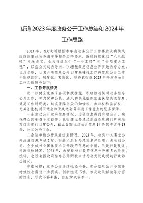 街道2023年度政务公开工作总结和2024年工作思路2023年,XX街道根据本年度政务公开工作要点及舆情风险防范重点任务清单等相关文件要求,围绕持续推动八八战略走深走实、全力推进三个一号工程和十项重大工程,以公众关切为导向,以增强政府信息公开实效为着力点,立足本职,认真开展信息公开日常基础性工作将信息公开工作不断规范化、制度化、常态化。现将我街道2023年年政务公开工作总结报告如下:一、工作开展情况进一步健全完善了各项制度措施,积极推动街道政务信息公开工作,努力保障公民、法人和其他组织依法获取街道信息,提高工作透明度,切实保障公众的知情权、参与权和监督权,尤其注重杭州亚运会和亚残运会等年度工作重点的服务保障。一是主动公开政府信息情况。为使信息得到有效公开,确保群众的利益不受侵害,我街道主要通过遂昌县政府门户网站对信息进行日常公开,截止目前主动公开信息14条其中文件13条,公示公告1条。二是依申请公开政府信息情况。2023年,收到个人要求公开政府信息申请2起,街道已及时处理回复并处理;未收到公司、企业或社会团体要求公开政府信息的申请。三是行政复议、行政诉讼情况。2023年,未接到针对政府信息公开事务的举报、投诉,也没有因政府信息公开而被申请行政复议或提起行政诉讼情况。存在问题:政务公开连续性还不够,部分信息公开不完善时效性也需进一步提高;创新性还不够,涉及政策解读等方面的信息,形式不够丰富,回应方式较单一。二、2024年政务信息公开工作思路(一)找准信息切点,落实公开重点一是定期召开专题会议研究政务公开工作,扎实推进联络员机制,强化责任主体意识。二是督促各科室汇总上报信息内容,做到应公开尽公开,进一步加强信息公开时效性。(二)提高能力水平,创新公开形式继续加强全体干部职工对政务信息公开工作的学习和了解进一步领会和贯彻落实《中华人民共和国政府信息公开条例》。深入分析政策内容,力求以新形式推进信息公开,提升服务质效。(三)拓展宣传渠道,实现公开透明多渠道、多形式进行信息宣传工作,及时挖掘与宣传优秀典型,提高公众对街道信息的知晓度。以政府门户网站为主体、微信公众号为辅助,充分利用好这些公开平台,实现政务信息公开化,切实提高政务公开透明度。(四)完善制度建设,规范公开程序规范审批流程,建立监督机制。进一步做好组织和协调工作,完善政务公开指南,实现信息公开的制度化、规范化、常态化,形成信息公开的长效机制。