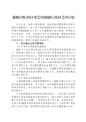县审计局2023年工作总结和2024工作计划今年以来,县审计局在县委、县政府的坚强领导和市审计局的正确指导下,深入学习贯彻XXX新时代中国特色社会主义思想和XXXXXX关于审计工作重要指示批示精神,贯彻执行中央及省委、市委、县委审计委员会决策部署,围绕县委县政府中心工作,以有力有效的审计监督服务和保障XX经济社会的健康发展。现将工作情况总结如下:一、审计重点工作开展情况(一)审计工作任务完成情况2023年计划安排6类42个审计项目(政策落实跟踪审计2个,财政审计项目4个,国有企业资产负债损益审计项目2个经济责任审计项目20个,领导干部自然资源资产离任审计项目1个,政府投资审计项目13个)。截至目前已完成审计项目31个(含往年滚存项目),审计查出主要问题金额XX万元,损益不实XX万元,审计期间整改资金XX万元、已上交财政XX万元、已归还原渠道资金XX万元、已调账处理金额XX万元,审计促进整改落实有关问题资金XX万元。向被审计单位提出审计建议137条。(二)审计工作开展情况1.持续做好重大政策落实跟踪审计。2023年重点关注了自然灾害救灾救助政策、安心托幼、老年助餐政策落实及资金管理使用等情况,涉及资金共计XX万元,查出政策落实不到位等问题9个。2.深化预算执行和财政财务收支审计。一是开展了县本级预算执行和其他财政收支情况的审计,重点反映了压缩公用经费不到位等14个问题。二是组织开展了月山镇、县委宣传部、星拱小学2022年度财政财务收支情况的审计。三是采用计算机审计方法对全县一级预算单位财务审计进行全覆盖审计分析,主要反映了财政存量资金使用效益低等14个方面的问题。3.加强政府投资审计监督。截至目前累计开展跟踪审计项目31个,涉及公共投资约XX亿元。完成竣工决算审计项目15个,审计发现多计工程价款等问题104个,审计查出主要问题金额XX万元,促进整改落实有关问题资金XX万元。向被审计单位提出合理化审计建议71条,移交问题线索2条。4.强化对领导干部履行经济责任情况的审计监督。组织实施了对县委编办、县卫健委、县人民医院等20个单位23名领导干部的经济责任审计。5.加强国有企业审计监督。县国资公司资产负债审计、县永安集团资产负债审计和县永安集团董事长、总经理佘世俊同志任职期间经济责任审计等3个项目已完成现场审计工作;完成企业改制资金专项审计项目1个(共12个企业)。6.严格做好审计整改下半篇文章。建立整改台账,严格遵循3个月更新汇总报告机制。2023年5月份召开全县审计整改工作会议,通报了2022年度审计查出问题的整改情况;9月份县政府召开2023年财政同级审问题整改推进会。7.内审工作有序开展,构建二审协同工作机制。出台《XX县内部审计工作规定(试行)》、《XX县加强内部审计工作方案》,推动全县83家一级预算单位和国有企业建立内审机构;积极组织相关单位参加强内审,促发展主题劳动竞赛。推动出台《关于建立国家审计内部审计协同机制的意见》(政办秘〔2023〕77号)、《XX县内部审计人员以审代训管理办法(试行)》(怀审委办发〔2023〕25号),积极探索国家审计和内部审计协同机制。二、审计工作取得的成效与亮点(一)抓政治素养再提升抓实学习贯彻XXX新时代中国特色社会主义思想主题教育制定《XX县审计局学习贯彻XXX新时代中国特色社会主义思想主题教育工作方案》,围绕对标沪苏浙XX见行动等开展研讨交流。持续规范机关党的建设。5月份顺利完成党支部换届工作。打造标准化党员活动室,设计党建品牌logo,新建审计书屋。完成审计党史资料(1984-2012)的征编工作。服务中心大局,践行为民服务宗旨。将XX县城乡供水一体化EPC+O重点民生工程列为书记领办事项。组建党员、志愿者多次深入网格小区、定点帮扶村开展创建国家卫生县、乡村振兴帮扶等活动。(二)抓作风能力再提高举办审计讲堂,开展股长上讲台活动;先后派出14人次参加省厅、市局组织的培训;公开招考了2名公务员;制定出台了《XX县固定资产投资审计中心竞聘上岗及层级(等级)晋升暂行办法》,今年有1人晋升副高级岗位,2人晋升中九岗位。组织开展了2022年度优秀审计项目评选工作。向地方党政、上级审计机关和各级新闻媒体报送审计文章信息124篇。选派11名骨干参与上级审计项目以及巡视巡察等重点工作。依法规范有序地顺利完成机关工会、妇联的换届工作。(三)抓联动协调再提效。牵头落实好县委审计委员会决策部署、议定事项和工作要求;每月向县委组织部、县纪委监委报送经济责任审计结果报告;2023年与县委巡察组联动协作开展2个单位领导干部任期经济责任审计。三、2023年获得市级以上试点、授牌、表彰等情况(一)首次开展全省融资平台专项审计和全省农信社系统资产质量和风险控制异地交叉审计。按照省审计厅要