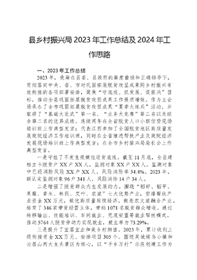 县乡村振兴局2023年工作总结及2024年工作思路一、2023年工作总结2023年,我局在县委、县政府的高度重视和正确领导下,贯彻落实中央、省、市对巩固拓展脱贫攻坚成果同乡村振兴有效衔接的各项部署安排,聚焦守底线、抓发展、促振兴目标,推动全县巩固拓展脱贫攻坚成果工作提质增效。作为主会场承办了全市巩固拓展脱贫攻坚成果夏季大练兵活动,并取得了基础大比武第一名、业务大竞赛第二名以及综合第二名的优异成绩。连续两年在全省脱贫人口小额信贷现场培训班上作典型发言;代表江西参加了全国脱贫地区高质量发展庭院经济工作培训班,同时在全省推进帮扶产业及庭院经济发展现场培训班上作典型发言;在全市乡村振兴局局长会上作典型发言。一是守住了不发生规模性返贫底线。截至11月底,全县建档立卡脱贫户XX户XX人,监测对象XX户XX人。监测对象中已经消除风险XX户XX人,风险消除率54.4%。2023年,新认定监测对象96户341人,风险消除14户34人。二是增强了脱贫群众内生发展动力。围绕稻虾、稻甲、果蔬、香米、林药、艾叶、农旅七大优势产业,安排帮扶产业资金XX万元,做优高质量庭院经济,做亮农文旅融合产业,培育了346家带贫经营主体,带动1071名脱贫群众增收。通过转移输出、技能培训、车间就业、兜底安置等就业帮扶模式,推动5764人脱贫劳动力实现就业,就业率为73.29%。三是提升了宜居宜业和美乡村颜值。2023年,累计收到上级衔接资金XX万元、安排项目305个。围绕吴城候鸟小镇和云居山两大龙头景区为核心,以千乡万村示范创建工作为抓手,安排衔接资金XX万元、项目64个,以点带面,整体推进2个省级乡村振兴样板示范镇、14个省级乡村振兴样板示范村建设,逐步形成可复制、可推广的经验,推动全县乡村振兴实现新突破。二、2024年工作打算2024年,我们将继续深入学习贯彻党的XX大精神和XXXXXX关于乡村振兴工作的重要论述,紧密结合县委十五届四次全体(扩大)会议提出的大力实施工业强县、乡村振兴、全域旅游三大战略,加快建设富裕、文明、和谐、美丽、幸福现代化新XX的发展思路,学好用活千万工程经验做法,全力打造全省乡村振兴示范县,加快建设宜居宜业和美乡村。一是抓巩固拓展,推动防贫监测取得新成效。压实三个责任,强化三线排查,坚持三级研判,抓牢监测、帮扶、风险消除三大环节,确保早发现、早干预、早帮扶,坚决守住不发生规模性返贫底线。严格落实四个不摘要求,落细教育、医疗、住房、饮水以及兜底保障等政策,巩固好两不愁三保障及饮水安全成果。二是抓产业发展,推动联农带农取得新突破。继续加大上级财政衔接资金支持产业发展力度,逐步提高用于产业发展的比重。围绕东虾西甲中香米、果蔬药旅竞芬芳的产业布局,大力推进一乡一业一村一品,推动发展农产品加工、乡村旅游、农村电商等产业,持续推进农村一二三产业融合发展,全力壮大村集体经济。三是抓乡村建设,推动村容村貌取得新变化。积极争取各级资金向重点村、示范村倾斜,确保每年投入重点帮扶村衔接资金达到XX万元以上。按照省百县千乡万村示范创建和市乡村振兴示范村创建的部署要求,以农民满意度、实际需求为基本出发点,加强村庄建设的设计及指导,聚焦乡村产业、农村电商、数字乡村、乡村治理等重点领域,全力打造乡村振兴XX样板。四是抓项目建设,推动乡村发展取得新提升。2024年,预计收到上级衔接资金XX万元(不含乡村振兴先行示范县专项资金),其中拟安排产业项目资金XX万元、基础设施类XX万元,安排项目约240个。确保11月底前资金拨付达到90%以上,力争完成100%。五是抓基层治理,推动乡风文明取得新气象。充分发挥村基层党组织战斗堡垒作用,持续深化抓党建促振兴,派强用好驻村第一书记和工作队,全面提升基层党组织的组织力、凝聚力和战斗力。探索推行乡村网格化管理、数字化赋能、精细化服务,充分发挥新时代文明实践站(所)等平台作用,积极开展各类宣传教育活动,持续推进移风易俗,积极培育文明乡风、淳朴民风和良好家风。