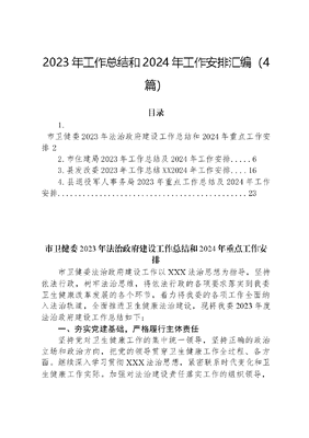 2023年工作总结和2024年工作安排汇编(4篇)目录1.市卫健委2023年法治政府建设工作总结和2024年重点工作安排22.市住建局2023年工作总结及2024年工作安排..63.县发改委2023年工作总结XX2024年工作安排.164.县退役军人事务局2023年重点工作总结及2024年工作安排23市卫健委2023年法治政府建设工作总结和2024年重点工作安排市卫健委法治政府建设工作以XXX法治思想为指导,坚持依法行政,树牢法治思维,将依法行政的各项要求落实到我委卫生健康改革发展的各个环节,着力将我委的各项工作全面纳入法治轨道,全面推进卫生健康法治建设,现将我委2023年度法治政府建设工作总结如下:一、夯实党建基础,严格履行主体责任坚持党对卫生健康工作的集中统一领导,坚持正确的政治立场和政治方向,把党的领导贯穿卫生健康工作全过程、各方面。继续深入学习贯彻XXX法治思想,紧密联系时代变化和卫生健康工作实际。加强对法治建设责任落实工作的组织领导,市卫健委机关党委履行推进法治建设第一责任人职责相关规定,坚持以身作则、以上率下,带头遵法学法守法用法。二、坚持法治引领,全面推进依法行政工作(一)深入落实法治宣传教育第八个五年规划根据《芜湖市卫生健康系统法治宣传教育第八个五年规划(2021-2025年)》的通知,制定《2023年市卫健委普法依法治理工作要点》《2023年全市卫生健康法治工作要点》和《2023年度市卫生健康委单位普法责任清单》,扎实开展普法活动。印发市卫健委《关于贯彻落实2023年全民国家安全教育日普法宣传活动的通知》,4月12日,市卫健委召开生物安全法宣贯暨病原微生物实验室生物安全管理工作推进会议学习生物安全法。印发市卫健委《2023年美好生活·民法典相伴民法典宣传月活动的通知》,市四院、市中医院联合南瑞街道,市五院、市口腔医院联合官山社区开展民法典进社区宣传活动。印发《芜湖市卫生健康委关于开展2023年江淮普法行活动的通知》,在职业病防治法宣传周、精神卫生日、无偿献血日等重要活动期间,结合部门实际,重点宣传卫生法律法规,免费发放健康用品,增强民众法制观念,取得良好社会效益。11月30日,市卫健委《安徽省爱国卫生条例》走进《公民与法——芜湖普法之声》直播间。开展宪法宣传周集中宣传活动,12月5日,举办全市卫健系统2023年度宪法宣传周暨学法用法普法守法知识竞赛,各县市区卫健委、市直各医疗卫生单位共计180余人参加竞赛,进一步普及《宪法》《基本医疗卫生与健康促进法》《传染病防治法》《职业病防治法》等法律法规知识。(二)开展法润乡村系列活动根据省卫健委《关于组织参与法润乡村社区行动的通知》要求,芜湖市卫健委印发了《关于开展法润乡村社区集中宣传月行动的通知》,动员各县市区卫健委和市直各医疗卫生机构以XXX法治思想为指导,以XX大精神、卫生健康法律法规为重点,全方位、多渠道开展《基本医疗卫生与健康促进法》《传染病防治法》《突发公共卫生事件应急条例》宣传教育。市卫健委结合文化科技卫生三下乡等活动,开展送法进乡村、进社区等活动,推动基层普法宣传深入开展。弋江区卫健委在中央城社区开展《传染病防治法》知识讲座,向群众解答卫生相关的法律、法规。繁昌区组织医务志愿者赴平铺镇龙岗村、横山街道开展下乡义诊暨法润乡村社区集中宣传月活动,发放健康手册和卫生健康相关法律法规宣传折页300余份。市中心血站、市卫生监督所、市五院三家单位在大富新村联合开展医心卫民结对共健——法润社区宣传义诊活动。(三)积极参与卫生健康标准体系建设积极参与标准体系建设,2023年申报安徽省地方标准项目5项,申报芜湖市地方标准项目8项。其中,《医疗护理员服务规范》《人工智能辅助宫颈癌诊断技术规程》《基于区块链的医疗健康数据流通技术规范》《互联网医疗服务规范》《院前急救分站设置及服务规范》等5项入选2023年芜湖市地方标准制订计划。三、存在问题和不足2023年以来,市卫健委法治政府建设工作虽取得了一些成绩,依法行政的能力和水平有所提高,但仍存在一些问题。主要表现在:(一)地方性卫生健康法律规章立法滞后,不适应当前芜湖卫生健康形势发展的需要,迫切需要加快立法进程。(二)法治宣传不到位,受到宣传内容和方式的制约,普法工作主动性不强、创新性不够,普法工作任重道远。四、2024年工作计划(一)加强法治宣传教育工作采取多种形式,创新宣传方式,运用各种平台,结合江淮普法行、职业病防治法宣传周等活动,继续在全市卫生健康法治宣传教育八五规划指导下,做好XXX法治思想、基本医疗卫生与健康促进法、传染病防治法等法律法规的学习宣传,提高全民卫生