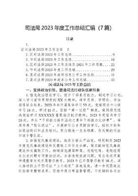 司法局2023年度工作总结汇编(7篇)目录1.区司法局2023年工作总结22.区司法局2023年工作总结.93.市司法局2023年工作总结164.区司法局2023年工作总结及2024年工作思路.235.市司法局2023年度工作总结.296.县司法局2023年政府信息公开工作总结417.县司法局2023年政务公开工作总结.43区司法局2023年工作总结一、坚持政治引领,塑造司法行政队伍新形象1.强化政治理论学习,提升干部素质能力。制定学习计划,深入学习宣传贯彻党的XX大精神,将学思想、学理论、学法规等结合起来,2023年共开展集体学习53次,党组理论中心组学习16次、研讨11次。坚持第一议题制度,做到局党组决策前学习XXXXXX重要指示批示精神,2023年党组共学习20次。举办干部能力提升活动之青年干部能力比拼赛,每周开展股长说法,开展新任公务员跟班学习,组织干部参加政治轮训和业务培训,努力锻造一支本领高、作风硬的司法行政干警队伍。2.加强党风廉政建设,推进全面从严治党。研究制定2023年度党风廉政建设和反腐败工作任务分解,做实做细党风廉政建设和反腐败工作。持续深化酒驾醉驾、违规吃喝、违规经商办企业问题专项整治活动,自查违规旅游问题,常态化运用案件通报等方式开展警示教育,2023年已开展警示教育18次。深入推进防止干预司法三个规定落地见效,进一步巩固政法队伍教育整顿成果。坚持开展日常监督管理,不定期到各司法所进行实地督查,做到每逢节点必提醒,进行集体廉政谈话。3.加强基层阵地建设,打造规范化司法所。严格按照《司法所工作高质量发展三年行动方案》要求,对周棚司法所进行升级改造,伍明司法所成功置换新所,规范阵地建设、完善规章制度、提升服务效能,全面夯实基层司法行政工作平台,推动全区司法所高质量发展。二、坚持全面统筹,提升法治XX建设新水平1.统筹推进依法治区工作,牢牢把握法治建设正确方向。制定学习宣传贯彻落实XXX法治思想实施方案,将XXX法治思想作为各级党委(党组)理论学习中心组重点学习内容,区委书记、区长带头宣讲XXX法治思想,各单位主要负责同志带头学习宣讲XXX法治思想50余场次,同时运用各类媒体和平台不断推动XXX法治思想进农村、进社区、进机关、进企业、进军营、进校园、进网络。印发全面依法治区委员会年度工作要点及重要举措分工方案、《XX区推进法治政府建设率先突破三年行动计划(2022-2024年)》等文件,完成党政主要负责人2022年度述法工作,落实好法治督察工作,明确10个法治为民办实事重点项目并及时推进。配合上级做好道路运输安全专项整治工作,将专项整治工作宣传海报张贴至全区各加油站点、政务服务中心等指定场所,营造良好宣传氛围;每月定期核查亡人道路交通事故责任落实情况,全面筑牢道路交通安全管理防线。梳理出7个公共政策兑现和政府履约践诺方面问题,现已全部兑现;做好服务实体经济律企携手同行专项活动,加强全区企业经营管理人的法治培训,努力打造一流法治化营商环境。提前启动省级法治政府建设示范创建工作,完成1轮网络检索,督促法治政府建设年度报告有问题的单位及时整改;积极申报国家级法治政府建设单项项目1个。2.加强行政执法协调监督,严格规范公正文明执法。推进区镇行政执法监督体系建设,配合实施乡镇街道和经开区赋权工作,积极推动行政执法权限和力量向基层延伸;做好2023年度行政执法资格认证考试准备工作,组织多轮预考,考试通过率97.9%,位居全市第三;完成全区行政执法案卷集中评查活动,切实推动全区行政执法案卷质量和行政执法能力双提升;对区直执法单位的涉企行政执法检查活动进行伴随式监督指导,并与乡镇新持证执法人员现场观摩学习活动有机结合,充分提升执法监督效能;充分发挥政府特邀行政执法监督员作用,引导其对行政执法工作进行事中、事后监督;指导各执法单位进一步规范行政裁量基准,认真落实包容审慎监管执法四张清单,从制度上强化对行政权力的监督和约束;出台第一批全区综合查一次涉企联合检查事项清单,减少执法机关涉企检查频次,营造便民利企营商环境。此外,推进全区行政执法统计年报工作全面落实并按要求公示,组织开展全区行政执法人员通用法律知识培训,完成行政执法证件年审及全市行政执法评议实地考核工作,梳理并公开2023年全区证明事项告知承诺制清单,督促各单位行政执法工作与刑事司法工作有效衔接,切实提高严格规范公正文明执法水平。3.规范重大行政决策程序,切实提升合法性审查工作质效。健全重大行政决策事项合法性审查和集体讨论决定等法定程序,制定《XX区人民政府重大行