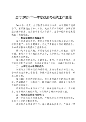 全市2024年一季度政府办系统工作总结2024 年一季度,全市政府办系统在市委、市政府的正确领导下,紧紧围绕全市中心工作,充分发挥参谋助手、协调枢纽、服务保障作用,全力推动各项工作落实,为全市经济社会发展做出了积极贡献。一、参谋辅政作用有效发挥深入开展调查研究。围绕全市重点工作和热点难点问题,组织开展了一系列专题调研,形成了多篇有价值的调研报告,为市政府科学决策提供了重要参考。精心起草各类文稿。高质量完成了市政府工作报告、领导讲话、重要文件等文稿的起草工作,充分体现了市政府的工作思路和决策意图。强化信息报送工作。及时收集、整理、报送各类信息,为市政府领导了解情况、科学决策提供了及时、准确的信息服务。二、协调联动水平不断提升加强与上下级部门的沟通协调。主动与省有关部门对接,争取政策支持和工作指导;加强对县区政府办的业务指导,形成工作合力。强化部门之间的协同配合。充分发挥政府办的综合协调职能,协调解决了一批跨部门、跨领域的问题,确保了全市各项工作的顺利推进。认真做好群众来信来访工作。热情接待群众来访,及时转办、督办群众反映的问题,切实维护了群众的合法权益。三、政务服务质量持续优化进一步规范公文处理工作。严格执行公文审核把关制度,提高了公文的质量和效率。扎实做好会议组织工作。精心筹备各类会议,严格会议管理,提高了会议的质量和效率。加强政务督查工作。围绕市政府重点工作和重大决策部署加大督查力度,确保了各项工作任务的落实。深入推进放管服改革。进一步优化营商环境,提高了行政审批效率和服务水平。四、自身建设得到加强加强思想政治建设。深入学习贯彻xx思想,不断提高干部职工的政治觉悟和理论水平。加强业务能力建设。通过举办培训班、开展业务交流等形式,提高了干部职工的业务素质和工作能力。加强作风建设。严格落实中央八项规定精神,坚决反对四风,树立了政府办系统的良好形象。加强党风廉政建设。落实党风廉政建设责任制,强化监督执纪问责,营造了风清气正的工作环境。在看到成绩的同时,我们也清醒地认识到,政府办系统工作还存在一些不足和问题,主要表现在:参谋助手作用发挥还不够充分;协调联动还需要进一步加强;政务服务质量还有待进一步提高等。对此,我们将高度重视,采取有效措施,切实加以解决。二季度,全市政府办系统将按照市委、市政府的决策部署进一步强化责任担当,提升工作效能,努力推动各项工作再上新台阶。持续提升参谋辅政水平。加强调查研究,深入了解基层实际情况,为市政府决策提供更加科学、准确的依据。切实加强协调联动。进一步完善协调机制,加强与各部门的沟通协作,形成工作合力。不断优化政务服务。继续推进放管服改革,优化营商环境,提高行政审批效率和服务质量。进一步加强自身建设。强化干部职工教育培训,不断提升业务能力和综合素质。文可居文库——海量学习资料,手机电脑均可下载www.wenkeju.com总之,我们将以更加饱满的热情、更加务实的作风,努力做好各项工作,为全市经济社会发展做出新的更大贡献!文可居文库——海量学习资料,手机电脑均可下载www.wenkeju.com