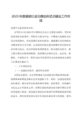 2023年度基层社会治理创新试点建设工作总结县委平安建设领导小组:乡坚持以XXX新时代中国特色社会主义思想为指导,坚持和加强党的全面领导,坚持以人民为中心,以增进人民福祉为出发点和落脚点,以加强基层党组织建设、增强基层党组织政治功能和组织力为关键,以加强基层政权建设和健全基层群众自治制度为重点,以改革创新和制度建设、能力建设为抓手,建立健全基层治理体制机制,提高基层治理社会化、法治化、智能化、专业化水平,现将2023年度基层社会治理创新试点建设工作情况汇报如下:一、工作开展情况(一)加强组织领导,提供坚实保障乡把社会建设、社会管理摆在与经济建设同等重要的位置,统筹协调和推进全镇社会管理创新工作。同时,加强党的基层组织建设,健全基层治理党的领导体制。把抓基层、打基础作为长远之计和固本之举,把基层党组织建设成为领导基层治理的坚强战斗堡垒,使党建引领基层治理的作用得到强化和巩固。加强乡、村各级党组织对基层各类组织和各项工作的统一领导,以提升组织力为重点,健全在基层治理中坚持和加强党的领导的有关制度。(二)转变乡镇职能,实现以服务促管理乡结合实际,合理设置了党政办、综治办、经济发展办、社会事务办等各站所,积极探索各站所的社会管理职责,强化政府公共服务职能,着力建设一个服务型、法治型、效能型政府。一是有效整合五办六中心一所力量,成立了乡网格化服务管理中心,承担辖区内劳动保障、社会救助、计划生育、土地管理与利用、综合治理、信访维稳、民事纠纷调解、社会矛盾化解等事务,实行一站式服务,实现了社会矛盾联调、治安问题联治、邪教活动联防、社会管理联抓、惠民实事联办,2023年初排查各类矛盾纠纷46户(高风险14户,中风险6户,低风险16户),已成功消除风险28户。二是党政办主任任应急办主任,并配备应急工作人员一名,负责辖区内的安全生产、食品药品安全、交通安全、消防安全等的监督管理、应急管理、人民武装等工作。三是经济发展办、农业农村服务中心、国土所等其他站所,负责辖区内的发展规划、农业发展、农村经济、产业结构调整、商贸、交通发展、经济统计、水利设施建设、农机等事务。四是设置信息公开平台,实行党务、政务、村务公开,乡政府、各村委会共配备公开专栏8块。同时,采取广播、微信群、朋友圈、板报、公示栏等多种方式,宣传党的各项方针政策,提供各类便民信息,畅通社情民意的收集、反映、解决渠道。(三)加强村级组织建设,增强管理服务功能积极开展村级组织综合试点工作,配齐了辖区内90个村民小组组长,健全了组织体系,壮大了基层工作队伍,延伸了管理触角,增强了农村基层组织服务功能。一是本着方便群众、便于服务的原则,在7村委会将党员服务、劳动保障服务、社会救济、最低生活保障、优待抚恤、人口管理与服务、妇女维权、法律援助等服务项目统一纳入服务内容,服务承诺、服务人员公示上墙,高效、快捷地为群众提供公共服务事项。二是推行村民需求信息公开制度,实行党务、政务、村务公开,采取广播、宣传栏、微信群、户长会等多种方式,宣传党的各项方针政策,提供各类便民信息,畅通群众诉求渠道。(四)创新工作机制,完善特殊人群服务管理紧盯重点区域、重点行业、重点领域、重点人员,健全落实人民调解、司法调解、行政调解三调联动和多元化调解机制。全乡共有社区矫正人员9人,刑释解矫人员46人,全部按要求定期开展帮教工作;全乡有在册精神病人82人,卫生院2名医护人员和2名派出所民警共同挂包进行网格化管理。全乡有留守儿童57人,明确学校教师、干部职工进行一对一包保开展关爱帮扶教育,切实将风险化解在初始和萌芽状态。(五)健全维护群众权益机制,着力提高网络服务水平建立了科学有效的利益协调机制、矛盾调处机制、权益保障机制,统筹协调各方关系,切实维护好群众的合法权益。建立健全了诉求表达机制、社情民意调查机制和利益相关方参与协商机制,畅通了公众参与渠道,引导群众理性合法表达利益诉求,最大限度把矛盾纠纷解决在基层、化解在萌芽状态。(六)着力加强公共安全服务管理一是坚持严打方针,扎实开展缉枪治爆两抢一盗非法集资电信诈骗等违法犯罪整治行动,2023年以来共受理各类治安行政案件56件,查处56件;立刑事案件6件,破案9件。二是强化安全生产红线意识,切实提高安全生产防范能力。进一步落实安全生产责任制,推行全员、全方位、全过程的安全管理监督保障体系。认真组织开展六月安全生产月活动,深入开展工程建设、森林防火、消防安全检查整治工作。截至目前,定时召开季度安全生产联席会4次,召开每月安全生产例会11次,层层落实责任,逐级签订80余份安全生产责任状合计80余份,印发乡各单位安全生产责任清单40余份,中小学签订学生防溺水责任书800余份。定期不定期对交通、消防、矿山和非煤矿山等重要领域开展隐患排查。二、下步工作打算在