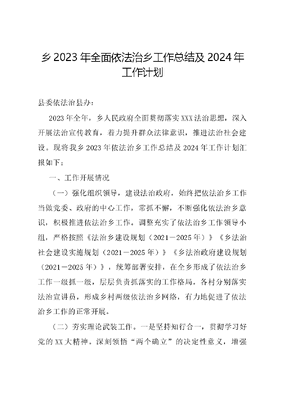 乡2023年全面依法治乡工作总结及2024年工作计划县委依法治县办:2023年全年,乡人民政府全面贯彻落实XXX法治思想,深入开展法治宣传教育,着力提升群众法律意识,推进法治社会建设。现将我乡2023年依法治乡工作总结及2024年工作计划汇报如下:一、工作开展情况(一)强化组织领导,建设法治政府。始终把依法治乡工作当做党委、政府的中心工作,常抓不懈,不断强化依法治乡意识,积极推进依法治乡工作。调整充实了依法治乡工作领导小组,严格按照《法治乡建设规划(2021-2025年)》《乡法治社会建设实施规划(2021-2025年)》《乡法治政府建设规划(2021-2025年)》,统筹部署安排,在全乡形成了依法治乡工作一级抓一级,层层负责抓落实的工作格局。各村分别落实法治宣讲员,形成乡村两级依法治乡网络,有力地促进了依法治乡工作的正常开展。(二)夯实理论武装工作。一是坚持知行合一,贯彻学习好党的XX大精神。深刻领悟两个确立的决定性意义,增强四个意识、坚定四个自信、做到两个维护,以实际行动践行对党忠诚,确保在政治立场、政治方向、政治原则、政治道路上同党中央保持高度一致,提高各级党组织和党员干部政治判断力、政治领悟力、政治执行力,把党的XX大精神转化为指导实践、推动工作的强大力量。二是加强学习,深刻领会XXX法治思想。把XXX法治思想转化为做好全面依法治乡各项工作的强大动力,以强有力的法治为保障,开启全面建设社会主义现代化国家新征程、向第二个百年奋斗目标进军。坚持党的绝对领导,坚持以人民为中心,以有效防控风险为核心,以全面深化政法改革为动力,把促进公平正义作为核心价值追求,全力以赴防风险、保安全、护稳定。(三)强抓落实,提高依法行政水平。一是加强学习,提高依法行政能力。认真执行领导干部学法用法制度,把党内法规和法律法规作为提高干部队伍素质和干事创业的基础性工作来抓,进一步增强干部依法行政意识和行政执法的责任意识。全年,共开展会前学法19次,受众干部职工1100余人次。二是深化党务政务公开,着力打造阳光政府。乡严格规范行政权力的运行,以有效防范行政决策风险,着力提升决策的科学化、民主化、法治化水平为目标,不断提高拟制年度重大行政决策事项目录清单的科学化水平;并对中心站所权力运行规范和监督进行了规定,进一步牢固树立了干部职工法定职责必须为、法无授权不可为的法治理念,自觉做到办事依法依规、决策用法用规、解决问题靠法靠规,不断提高运用法治思维和法治方式深化改革、推动发展、化解矛盾、维护稳定的能力,让权力在阳光下运行。(四)健全制度,确保执法责任落实。一是完善科学决策机制。坚持领导班子成员分工制,修订完善议事决策规则,杜绝决策层面的权力梗阻。二是完善权力运行机制。以依法行政制度建设为重点,强化权力约束,用制度管人、管权、管事。三是完善惩治和预防腐败机制。畅通来信、来访、来电、网络四位一体的廉政监督举报体系,构建不易腐、不愿腐、不能腐、不敢腐的反腐倡廉机制。(五)广泛宣传,全力抓好普法宣传工作。乡在学习贯彻XXX法治思想,大力弘扬法治精神、传播法律知识,推动八五普法、普法强基补短板工作上不断发力,积极利用宣传标语、农村应急广播、电子显示屏、宣传栏、召开户长会等形式开展普法宣传,营造浓厚普法氛围。在王红线、进村公路主干道制作悬挂宣传标语35条,在各村制作设置固定普法强项补短板宣传栏14块,利用农村应急广播放普法宣传相关音频60余次,利用电子显示屏不间断开展普法宣传,发放《普法进万家——强基础补短板普法读物》100余册,发放道路交通安全宣传资料、防范电信诈骗宣传手册等宣传资料800余份及宣传手袋600余个,结合助农促春耕、烤烟生产、电子社保卡申领等等各项工作开展,进村入户向群众开展普法宣传180余场次。(六)全面推进依法治乡,着力提升法治乡村建设。一是各村以村民自治章程、村民公约为基础,不断健全和完善各项管理制度,实行民主理财、民主管理,做到村务公开内容具体化、形式标准化、程序规范化。民主监督健全有效,村委会干部依法接受群众监督,广大村民知情权、参与权、监督权得到落实。二是充分发挥人民调解员的作用,积极开展矛盾纠纷排查调解工作,有效促进各村的和谐稳定,基本实现大小纠纷不出村,全年无民事纠纷引发刑事案件,无民间纠纷引起治安案件和群众性上访事件,邻里之间和谐共处,为村民创造良好的生产、生活环境。2023年共受案各类民事案件46件,调处46件,调解成功46件,调解成功率100%。三是规范村级组织运行管理,各村落实三会一课相关规定,定时召开组织生活会。开展村干部集中培训,对三资管理、土地开发利用、工程建设等方面做重点指导。二、典型经验和做法乡结合八五普法规划工作要求,深入开展精准务实的外出务工人员和农村三留守人员法治宣传工作,
