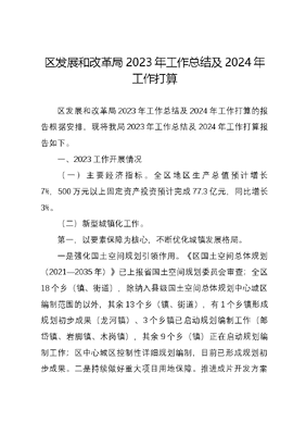 区发展和改革局2023年工作总结及2024年工作打算区发展和改革局2023年工作总结及2024年工作打算的报告根据安排,现将我局2023年工作总结及2024年工作打算报告如下。一、2023工作开展情况(一)主要经济指标。全区地区生产总值预计增长7%,500万元以上固定资产投资预计完成77.3亿元,同比增长3%。(二)新型城镇化工作。第一,以要素保障为核心,不断优化城镇发展格局。一是强化国土空间规划引领作用。《区国土空间总体规划(2021—2035年)》已上报省国土空间规划委员会审查;全区18个乡(镇、街道),除纳入县级国土空间总体规划中心城区编制范围的以外,其余13个乡(镇、街道),有1个乡镇形成规划初步成果(龙河镇)、3个乡镇已启动规划编制工作(郎岱镇、岩脚镇、木岗镇),其余9个乡(镇)正在启动规划编制工作;区中心城区控制性详细规划编制,目前已形成规划初步成果。二是持续做好重大项目用地保障。推进成片开发方案修编,持续加大批而未供土地和闲置土地处置力度,结合区批而未供土地现状,制作招商引资地图,加快盘活低效存量建设用地,推进城镇低效用地再开发。截至目前,已挂牌出让7宗土地,面积370.42亩,出让价款24247万元;正在挂牌8宗土地,面积128.54亩,出让价款预计11008万元;已划拨土地3宗,划拨面积1262.85亩。三积极争取项目建设资金支持。通过纵向争、横向招、内部聚等各种渠道,积极争取上级资金,引导金融机构、社会资本加大对项目的投入支持力度。今年以来,获得老旧小区和背街小巷改造、城镇燃气管网改造、雨污管网改造、保障性住房等城镇化建设补助资金1.21亿元;开展政金企融资对接活动,预计到年底支持我区新型城镇化项目10个,项目签约金额预计达13亿元,本年度预计放款金额达5亿元。第二,以基础建设为抓手,不断提升城镇承载功能。一是坚持提升城市品质。加快推进以棚户区改造、老旧小区改造、背街小巷改造和以燃气、给排水管网为主的城市地下管网改造等四改为载体的城市更新行动,2023年棚户区改造任务数为2722户,现已完成26户,剩余2696户正在有序推进;改造老旧小区5个、背街小巷20条,改造地下管网共62公里,建设5G基站644个,新增城市公共停车位500个,城市生活垃圾无害化处理率达100%,污水处理率达97%。二是坚持完善城市功能。进一步调整优化教育资源布局结构,优化全区中小学布局,2023年规划新建、改扩建幼儿园项目6个,预计可增加学位1620个。义务教育阶段改扩建项目4个,预计可增加学位1200个。普通高中改扩建项目1个,预计可增加学位1000个;加快推进区医疗机构建设,进一步提升医院医疗服务能力,制定印发《区县域医疗次中心建设项目实施方案》,建设岩脚镇县域医疗次中心;不断推进公共养老服务设施建设,努力构建居家社区机构相协调、医养康养相结合的养老服务体系,提质改造完成团结路社区、九龙社区等2个嵌入式养老机构,打造银壶社区、塔山社区2所老年人日间照料中心。全区养老床位804张,护理型床位442张,护理型床位占比54.9%;制定《区公立医疗机构开展托育服务试点工作的实施方案》,特区妇幼保健院申请建设普惠托育服务试点单位;申报3人制篮球场或健身路径3个。三是坚持强化城镇治理。以全省统一的贵州省网上办事大厅为载体,接入了1个县级、18个乡镇(街道)级、253个村(居)级网上办事大厅服务站点,为企业和群众提供一网通办服务平台。将全区政务服务事项全部纳入贵州政务服务网,事项要素及事项办理全部目录化、清单化向公众公开,全程网办率达83%。强化社区网格化管理,全区18个乡(镇、街道)共划分网格1463个,配备网格员1463名,全区网格化管理全覆盖。中心城区九龙、银壶、塔山3个街道划分网格300个,配备专职网格员134名,专职网格员配备率44.67%,网格员运用平安贵州APP办理矛盾纠纷800余件。第三,以产业发展为支撑,不断增强城镇发展动力。一是积极推进产业集聚。坚定不移地把发展工业作为首要任务,切实加大园区建设力度,坚持一手抓招商引资,一手抓项目建设,突出产业发展和基础设施建设,推动园区成为新的经济增长点。围绕六大产业链条强化招商,加快推进新型建材、生态特色食品、先进装备制造、现代能源化工、精细化工等特色产业集聚发展,推进六枝经济开发区打造100亿级园区。2023年成功签约六枝经济开发区化工园区污水处理厂建设项目、六枝经济开发区贵州美锦华宇新能源有限公司铁路专用线项目、12万吨每年高活性氢氧化钙项目等7个项目,签约资金11.15亿元、到位资金28.75亿元(含续建项目到位资金);新增就业520人。预计到12月底,累计外出招商25次,成功签约项目10个,签约资金20亿元、到位资金30亿元;新增就业600人。二是积极培育市场