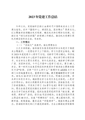 2023年党建工作总结今年以来,党组始终坚持以A新时代中国特色社会主义思想为指导,把牢围绕中心、建设队伍、服务群众职责定位,以主题教育统领融合机关党建、模范机关和文明单位创建,创新打造四化四抓四强的党建工作模式,推动机关党建引领机关建设始终走在前、作表率。一、工作情况(一)系统化抓教育,强化理想信念立足自身职能,指导督促各基层党组织和全体党员干部投身主题教育。一是理论学习上下联动,学习内容突出特色。制定2023年度党组中心组学习计划,创新学习研讨模式,科学统筹专题读书班与中心组学习安排和内容,每次学习研讨领导班子、处室单位主要负责同志、青年代表发言,确保学习研讨的广度、深度和实效,今年已开展中心组学习12次,累计48人发言。第一时间为各基层党组织和离退休干部发放主题教育指定书目*余册,坚持用什么学什么梳理印发AXXX关于本部门本领域重要论述、重要讲话汇编。高质量编制理论学习清单,细化为10种学习形式37项学习任务,明确完成时限、牵头单位和责任单位,确保理论学习各项任务扎实推进。二是突出学用结合,推动主题教育成果向基层延伸。坚持基层是一切工作的落脚点,印发关于学习《A著作选读》等学习材料的通知,要求各基层党组织制定支部学习计划和个人自学计划,形成全员学习的良好局面。组织各基层党组织开展献良策、解难题、建新功活动,设计11项活动载体,各基层党组织开展主题活动40余次。实施党建联动行动,建立困难问题、创新举措、政策措施、服务成效四张清单,根据共建企业需求,协调组织相关部门开展现场调研,为企业解读政策破解难题,以党建第一责任引领保障发展第一要务,调研做法在多家媒体发布。三是开展系列活动,营造全员参与的浓厚氛围。注重在沉浸式学习体悟中加深理解认识,立足干部需求和岗位特点,组织党员干部赴党性教育基地、保密教育基地等开展党性教育。坚持以讲促学、以赛促学,以青年干部为重点开展主题演讲比赛,提交作品30篇;以中层干部为重点开展建功新时代争做排头兵业务大比武,组织干部上讲台述理论、述典型、述对策,打造政治过硬、业务精干的排头兵干部队伍。统筹领导班子专题党课计划,部署开展书记第一讲我来讲党课活动,丰富活动载体,引导党员干部做到学思践悟、融会贯通。(二)标准化抓管理,强化责任落实认真落实新时代党的建设总要求,全面提升单位党的建设工作质量和水平,为中心工作高质量发展提供有力支撑。一是坚决扛牢机关党建责任。紧紧抓住落实主体责任这个牛鼻子,印发年度机关党的工作要点,制定党组、党组书记、党组成员抓基层党建责任清单,明确党建工作重点任务。高质量召开民主生活会,制定整改落实方案。针对党组书记抓基层党建述职反馈意见,细化为18项具体落实举措,确保问题整改见底到位。二是提高支部标准化建设水平。持续增强党组织政治功能和组织功能,组织召开基层组织书记抓基层党建述职评议会议,制定支部标准化建设责任清单,明确有关考核标准,合理设置激励指标和约束指标。各支部高标准制定年度工作计划,突出特色亮点工作,形成党建业务融合的发展合力。开展党务干部培训,进一步提高履职能力。打造季度督查,年度评估的党建督查机制,上半年重点对支部生活落实情况开展督查,梳理反馈共性问题20条,个性问题50条,下半年开展党建联建活动的支部从10个上升到20个,实现了全覆盖,利用官网、公众号等开展宣传30余次,较上半年的15次大幅提高。三是全面落实意识形态工作责任制。印发年度意识形态工作要点,按季度开展分析研判,组织半年意识形态工作总结,党组会专题研究意识形态工作,牢牢掌握党对意识形态工作领导权。(三)常态化抓作风,强化监督管理一是聚焦作风促发展。坚持问题导向,年初组织召开党风廉政建设会议和履行全面从严治党责任述职会议,开展廉政谈话,制定纪检工作要点,层层签订党风廉政建设责任书。发布加强全体党员干部作风能力建设倡议书、文明礼仪倡议书等,切实把作风建设抓牢抓深抓实。二是创新形式塑品牌。充分发挥廉洁文化的价值导向功能,制定《廉洁文化创建专项行动工作方案》,通过专题学习研讨、廉洁文化讲座、年轻干部心得体会交流等系列活动,增强干部廉洁从政意识和拒腐防变能力,着力打造特色廉洁文化品牌。三是加强监督提质效。做细做实日常监督,积极参与监督单位开展的联合调研监督,对重点业务部门、重要业务环节开展重点监督,进行集体廉政谈话,对重点项目评审、现场考察等监督20余次,以有效监督促进业务工作规范化、上水平。四是深化教育筑防线。充分挖掘典型案例警示教育意义,汇编并下发AXXX关于全面从严治党重要论述、警示教育典型案例,邀请有关专家学者专题授课,组织参观廉洁文化图书馆、廉政教育馆,举办廉洁书画展文韵笔墨丹青绘清风摄影书画展,营造风清气正良好氛围。(四)融合化抓