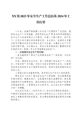 XX镇2023年安全生产工作总结及2024年工作打算一年来,我镇严格按照三年行动巩固提升攻坚战、国家安全生产十五条措施、省政府安全生产50条具体贯彻措施及安全生产大检查等重点工作要求,全镇上下凝心聚力、苦干实干,扎实认真开展以深化道路交通、企业安全、房屋安全为重点的专项整治活动及各种安全生产大检查,全镇安全生产工作总体形势平稳,为全镇社会、经济全面发展起到了重要的保驾护航的作用。现将一年工作开展情况总结如下:一、全面落实安全生产责任制一是全面落实了管生产必须管安全的一岗双责、齐抓共管责任制。年初,镇政府出台文件,进一步明确了安全生产一岗双责、齐抓共管责任制,形成了行政主要领导负总责,分管领导具体负责的安全生产监管职责体系,将责任落实到具体岗位、具体人员。二是强化安全生监管考核,促进安全生产各项工作的落实。要求各村(社区)强化安全生产日常监管、安全隐患排查和报告职责。镇属各部门、各驻镇单位强化监管职责,落实属地监管和行业管理责任,强化对辖区内所有企业和生产经营单位的监督检查。三是强化企业主体责任,企业安全生产保障能力进一步增强。企业法定代表人(实际负责人)安全责任得到全面落实,严格执行国家有关规定,企业安全管理和从业人员安全培训和持证上岗制度得到较好落实,安全事故隐患排查治理常态机制较好建立。二、狠抓重点行业领域安全专项整治和隐患排查治理(一)道路交通方面:配合交警中队、派出所开展了道路交通专项整顿行动,以打击非法营运、农用车、三轮车、摩托车等违章载人为重点,抓好XXX国道、省道、县乡道道路交通监管工作,加强路检路查,加大查处力度,有效打击了各种车辆的违章载人行为,确保了全镇一年来无重特大交通事故的发生。(二)企业安全方面:对全镇各企业加强了巡查监督管理加大了检查力度,对检查巡查发现的安全隐患和违法行为,现场责令企业限期进行整改,以消除事故隐患。全年来,全镇开展了安全检查出动车辆55台次,参与检查政府及各部门执法人员200余人次,重点对烟花爆竹企业、三无企业及小作坊、养殖场、消防等证照手续不齐、不完善企业进行综合执法检查。企业实施断电1家,场地查封8处,下发整改通知书12份。(三)房屋安全排查方面:自开展房屋建筑安全隐患大排查大整治专项行动以来,我镇迅速布置、精准摸排,确保不落一户不漏一人,全面排查整治居民房屋建筑安全隐患,牢牢守住安居底线,切实维护人民群众生命财产安全。一是镇村干部面对面为群众讲解房屋安全常识,让居民深刻认识到房屋建筑存在的安全隐患;二是利用微信、宣传车、悬挂条幅等形式,加强房屋安全的政策解读和安全教育,提高辖区群众房屋建筑安全意识和风险意识,强化社会共识。三是全面推进房屋安全隐患排查整治工作,成立督查专班,包村领导全部下沉农村一线,广泛动员各村网格员、网格长参与。到目前,全镇已摸排自建房17200余栋,对排查出来的133栋危房该拆的拆、该封的封、该改造的改造,坚决防止因房屋倒塌导致人员伤亡事故。(四)学校安全方面:一是重点检查镇辖内各中小学和7家幼儿园的安全出口、疏散指示、应急照明、消防配备、用电用火管理和卫生安全等;二是抓好学生运输车辆安全检查工作,坚决制止非营运和无牌照、未按照年检和报废车辆接送学生的不安全行为。三是切实抓好防溺水工作,各村(居)落实了干部巡查机制,上户进行了防溺水宣传,投入4万多元对153个重点水域安装、配备了警示牌、救生圈、竹竿,形成了社会、学校、家庭齐抓共管的防溺水工作机制,有效预防了学生溺水事故发生。(五)消防安全方面:我们重点对辖区内小超市、酒店、学校、网吧、敬老院、在建建筑等人员密集场所、易燃易爆单位进行监督检查;清明节期间,组织人员在路口设卡,严禁带火种上山,杜绝火源,防止火灾事故的发生;在干旱季节和农村收割季节期间做好用火、安全用电的监督检查和宣传教育,增强人民群众的自防自救能力,消除了大批火灾隐患,确保人民生命财产安全。(六)食品安全方面:一是以农贸市场、杂货店、餐饮服务单位等为重点场所,按照食品源头污染治理、生产加工、流通以及消费四个环节开展工作,严厉打击生产、销售假冒伪劣和有毒有害食品的违法犯罪行为。二是以元旦、春节、端午、五一等节日为重点,突出抓好肉类、酒类等节日性食品的专项整治。加强节日食品市场监测,引导群众科学消费、健全消费,保障人民群众饮食安全。三是开展了防范野生毒蘑菇宣传活动,引导广大群众不摘、不买、不卖、不食野生蘑菇,确保全镇人民舌尖上的安全。三、存在的问题:XX镇人多、地大,安全生产形势依然十分严峻,安全生产压力非常大,群众安全生产意识淡薄,企业与业主落实安全工作的责任与各级的要求存在差异。四、2024年工作打算一、切实落实一岗双责机制,严格督促落实企业主体责任,加大安全检查和执行力度。二、继续落实班子一对一服务企