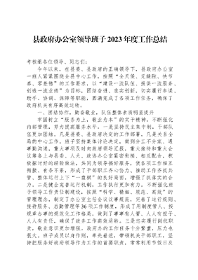 县政府办公室领导班子2023年度工作总结考核组各位领导、同志们:今年以来,在县委、县政府的正确领导下,县政府办公室一班人紧紧围绕全县中心工作,按照全天候、无缝隙、快节奏、零差错的工作要求,以建设一流队伍、提供一流服务、创造一流业绩为目标,团结奋进、求实创新,切实履行参谋、助手、协调、保障等职能,圆满完成了各项工作任务,确保了政府机关有序高效运转。一、团结协作,勤奋敬业,队伍整体素质明显提升牢固树立服务为上,敬业为本的实干精神,不断强化内部管理,努力提高服务水平。一是坚持民主集中制,干部队伍更加团结。凡是县委、县政府决定的工作部署,凡是关系全局的中心工作,班子坚持集体讨论决定,做到分工不分家、遇事勤沟通,重大事项及时向政府领导汇报,重大接待和重大会议筹备上与县委、人大、政协办公室紧密衔接、相互配合,积极探讨好的经验做法,共同为领导搞好服务,使各项工作相互衔接、有条不紊,形成了干部职工齐心协力、推动工作齐抓共管、整体运行上下一盘棋的良好局面,增强了抓落实的合力。二是健全完善运行机制,工作执行更加有力。不断强化班子领导工作责任制建设,按照科学、精细、规范、高效的管理理念,制定了办公室主任会议议事规范,完善了运行规则、接待服务、后勤管理等36项工作制度,形成了用制度管人、按规章办事的规范化工作格局,做到了事事有人管、人人有担子、人人有责任,确保了政务工作高效运转。三是忠实履行岗位职责,敬业意识更加增强。政府办的工作任务十分繁重,压力也很大。班子成员以身作则,率先垂范,带领机关干部职工,坚持把服务好政府领导作为工作的首要职责,常常利用节假日及晚上时间加班加点,牺牲休息时间协调处理事务,毫无怨言,不计酬劳,甘愿付出,保证了政府工作的正常、有序运转。四是强化作风效能建设,干部作风更加扎实。结合学习贯彻习近平新时代中国特色社会主义思想主题教育,邀请县委党校领导举办了学习新《党章》、加强作风建设专题辅导报告会,组织开展了我为党旗添光彩主题演讲活动和责任、服务、效率为主题的学习讨论活动,不断强化干部职工作风建设和效能建设,机关作风进一步转变,服务质量进一步优化,办事效率进一步提高。二、真抓实干,勇于创新,参谋辅政能力显著提高一年来,办公室领导班子成员牢记岗位职责,立足本职工作,找准定位,求真务实,努力做好领导的参谋部和左右手,切实加强上下、内外、左右关系的沟通和协调,开创了各项工作新局面。一是信息报送及时有效。健全完善全员办信息、目标责任、定期通报、考核奖罚等制度,努力在信息采编报送广度、深度和质量上狠下功夫,及时向上级报送区内有特色、有指导、有参考价值的信息。止目前,共编写上报政务信息850条,被省市采用175条。高度重视应急管理工作,明确专人负责,成立了应急管理机构,落实24小时值班值守制度,规范紧急重大信息报送,年内上报各类应急信息114期,及时率达到100%,被评为全市应急管理工作先进单位。二是综合调研重点突出。紧扣县政府工作重点和社会热点,从转变服务方式入手,变被动服务为主动服务、滞后服务为超前服务,每次重大会议召开、重大决策出台之前,都坚持深入调研,广泛搜集资料,提出意见建议。今年,围绕五做五加强,先后组织开展重大调研活动20多次,形成有建设意义的调研报告30多篇,为领导科学决策提供了依据。三是政务督查成效显著。坚持把政务督查作为推动县委、县政府重点工作落实的有力抓手。围绕全县重点工作、重要会议和上级转办件、领导批示件等开展督查。年内组织开展重点项目建设、市对县目标责任书完成、惠民实事落实、城区供热、安全生产等专项督查18次,下发《政务通报》37份,交办督办市区领导批示件215件,全部办结并上报结果,得到了领导的充分肯定。同时,围绕人大代表建议和政协委员提案办理,强化专项督查,督促办理人大代表建议和政协委员提案142件,办结答复率达到了100%。四是办文办会质量提升。办文方面,严把政策关、程序关、文字关、格式关和文印质量关,严格控制发文数量,努力提高公文质量,做到公文日常处理零失误。落实了文件收发、登记、传阅、归档等各个环节跟踪制度,所有公文归口分类,由各对口主任传阅、送签,确保了公文流转规范、有序、安全、高效、无差错。今年共上报下发各类文件671件,同比减少168件,起草工作汇报、领导讲话、请示报告等材料200多篇,重要文件材料领导满意率达到100%。办会方面,坚持会前周密筹备、会中精心组织、会后认真落实,高质量地承办了全县经济工作会、政府全体会、政府常务会、各类工作部署会和电视电话会等会议150多场次,均做到了忙而不乱、有条不紊、无一失误,确保了各项重大决策的及时贯彻落实。五是便民服务更加优化。市民服务中心挂牌成立进入试运行,12345便民服务热线全面开通,10个职能部门和2户企业已
