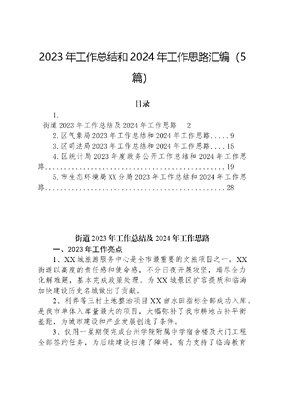 2023年工作总结和2024年工作思路汇编(5篇)目录1.街道2023年工作总结及2024年工作思路22.区气象局2023年工作总结和2024年工作思路..93.区司法局2023年工作总结和2024年工作思路.154.区统计局2023年度政务公开工作总结和2024年工作思路..195.市生态环境局XX分局2023年工作总结和2024年工作思路..28街道2023年工作总结及2024年工作思路一、2023年工作亮点1、XX城旅游服务中心是全市最重要的文旅项目之一。XX街道以高度的责任感和使命感,不分日夜开展攻坚,竭尽全力化解难题,基本完成政策处理。为XX城景区扩容提质和临海加快建设历史名城做出了贡献。2、利弄等三村土地整治项目XX亩水田指标全部成功入库。是我市单体入库量最大的项目,大幅弥补了我市耕地占补平衡差距,为城市建设和产业发展创造了条件。3、仅用一星期便完成台州学院附属中学宿舍楼及大门工程全部签约任务,为后续建设扫清了障碍,有力支持了临海教育事业发展。4、在伏龙大桥政策处理中,XX街道做了大量工作,保证了项目顺利施工。在项目建设过程中,XX街道更是提供了一切保障和协助。9月,大桥主体工程全线连通,预计年底可通车。通车后,将有效缓解过江交通压力,改善区域交通条件。5、2022年,XX街道完成XX亩土地征收和7户8间房屋征收,保障了项目顺利开工。今年,XX街道完成全部政策处理工作。目前北岸治水公园切滩已经全部完成治理,总工程完成度达60%,超过预期进度。6、XX街道入选浙江省首批红色根脉强基示范乡镇(街道),是临海唯一获此荣誉的乡镇街道,为全市基层党建工作提供了XX经验。7、XX街道持续放大景区效应,商贸、餐饮、住宿等产业实现大幅增长。XX街道被评为浙江省2022年度现代商贸特色镇。该项荣誉为临海唯一。8、鹿城社区入选全国先进基层群众性自治组织,是台州唯一入选的社区(全省共9个)。9、鹿城社区作为全省唯一的基层社区代表在浙江省共享法庭建设现场会上作交流发言。10、海港直播城项目顺利签约落地。海港直播城是全市较大的本土企业家回归投资项目。项目预计总投资额2亿元,将构建成一个以电商直播为主导,整合上下游服装、家居、眼镜、百货等供应商入驻的产业园。园区建成后年销售额预计达X亿,亩均税收达XX万元。直接解决就业XX人左右,促进上下游就业XX人以上。11、党建统领网格智治发挥成效。整合机关和村居干部、党员志愿者、执法部门等各方力量,全面夯实网格基本单元,共划分专属网格31个、社区网格XX个、各类微网格XX个。网格自主排查矛盾纠纷XX起,就地吸附比例达91%,将矛盾纠纷有效化解在基层。二、2024年工作计划2024年,XX街道将认真落实上级工作部署和要求,紧盯目标任务,扛起使命担当,全力争先创优,奋力实现千年XX全域复兴、全面崛起,重点做好以下五个方面:(一)聚焦示范引领,打造党建联建新高度。深入推进新时代党的建设新的伟大工程,全力打造新时代党建高地和清廉建设高地。强化政治引领。扎实开展主题教育,做好后续跟进及问题整改,真正把学习成效转化为干事创业的强大动力。认真落实第一议题制度,建立健全贯彻XXXXXX重要指示批示和上级重大决策部署落实机制,确保XXX有号令、党中央有部署、上级有要求,XX显担当。牢牢把握意识形态工作领导权、主动权,巩固壮大主流舆论阵地,凝聚临海正能量,讲好XX故事、唱响XX声音。强化队伍支撑。坚持党管干部原则,突出实干实绩导向,创新赛马晾晒机制,全面激发干部沸腾状态,打造敢闯敢干、能拼善战、充满激情的XX铁军。坚持以实绩论英雄,认真落实争先指数、担当指数、辛苦指数考核,常态化推荐评选狮子型、老黄牛型干部。注重干部梯次培养,注重在项目一线和吃劲岗位培养锻炼年轻干部,锻造堪当重任的生力军。强化基层基础。放大浙江省首批红色根脉强基示范乡镇(街道)优势,深化七张问题清单抓党建带全局机制,统筹抓好党建统领网格智治、现代社区、共同富裕等工作,迭代完善村企党建联建机制,全域建设党建强、发展强、治理强的基层党组织。推动党建品牌体系建设,以项目化打造党建示范点、示范带和红色阵地集群。推行村级关键绩效指标(村PI)考核评价体系和头雁领航工程,育强培优政治强、能带富、善治理的村社党组织带头人。强化清廉建设。始终坚持严的基调,锲而不舍落实中央八项规定及其实施细则精神,坚决防止四风问题反弹回潮、隐形变异。坚持零容忍、全覆盖、无禁区,科学运用监督执纪四种形态,严查重点领域违纪违法案件