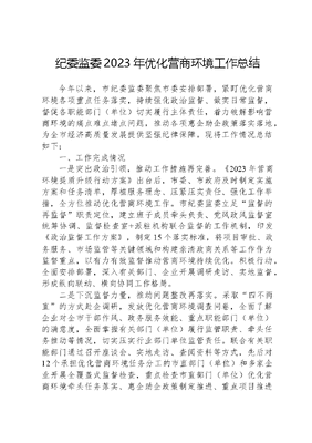 纪委监委2023年优化营商环境工作总结今年以来,市纪委监委聚焦市委安排部署,紧盯优化营商环境各项重点任务落实,持续强化政治监督、做实日常监督,督促各职能部门(单位)切实履行主体责任,着力破解影响营商环境的痛点难点堵点问题,推动各项惠企助企政策落实落地,为全市经济高质量发展提供坚强纪律保障。现将工作情况总结如下:一、工作完成情况一是突出政治引领,推动工作措施再完善。《2023年营商环境提质升级行动方案》出台后,市委、市政府及时制定实施方案和任务清单,厚植服务理念、压紧压实责任、强化工作举措,全方位推动优化营商环境工作。市纪委监委立足监督的再监督职责定位,建立班子成员牵头负责、党风政风监督室统筹协调、监督检查室+派驻机构联合监督的工作机制,印发《政治监督工作方案》,制定15个落实标准,将项目审批、政务服务、市场监管等关键领域和构建亲清政商关系等工作作为监督重点,以有力有效监督推动营商环境持续优化。积极行动,全面安排部署,深入有关部门、企业开展调研走访、实地监督,形成纵向联动、横向协同工作格局。二是下沉监督力量,推动问题整改再落实。采取四不两直的方式赴企调研,发放优化营商环境调查问卷,全面了解企业对全市干部作风、政务服务效能、重点职能部门(单位)的满意度,全面掌握有关部门(单位)履行监管职责、牵头任务推动等情况,切实压实行业部门单位监管责任。联合有关职能部门通过召开座谈会、实地走访、查阅资料等方式,先后对12个承担优化营商环境任务分工的市直部门(单位)和多家企业开展全覆盖式监督检查,重点检查市直部门(单位)优化营商环境牵头任务落实、惠企助企政策制定推进、重点项目推进保障等情况,现场反馈政策支持力度还需进一步加大等方面问题,指导并督促各有关单位查补漏洞、增补措施、纠正偏差,全方位监督保障七个环境优化完善、31条24条政策措施落地见效。三是聚焦关键环节,推动服务质效再提升。坚持日常监督、派驻监督综合发力,通过列席会议、跟踪监督、联合监督等方式,督促市工信、发改等部门深入实施《工业企业困难问题直达解决制度》等,选派1名处级领导和1名年轻干部,一对一联系服务民营企业,收集企业突出困难问题1件,办结1件,全力推动重点项目建设和民营企业健康发展。聚焦简政放权、优化服务等重点内容和关键环节,督促市审批服务管理、政务服务中心等部门深入落实企业登记便利措施,推广企业开办零成本,实行全程网办、半日办结,企业开办网办率提升至1%以上。深化一窗受理、集成服务改革,健全政务平台功能,申请材料、办理环节、办理时限分别压减1%、1%和1%。聚焦政策措施落实兑现,跟进监督惠企利企措施落实情况,督促市金融工作局制定《绿色金融助推建设绿色发展先行市实施方案》,全力引导金融机构加大对民营企业的信贷支持力度。四是强化作风建设,推动清廉助商再深化。持之以恒贯彻落实中央八项规定及其实施细则精神、自治区八条禁令,紧盯节日节点关键环节和不吃公款吃老板等突出问题开展明察暗访,着力排查公职人员在履职尽责、服务企业、政商交往等方面的四风问题,严肃查处违规收送礼品礼金、接受吃请等享乐主义、奢靡之风问题1起,处理1人。持续深化工程建设政府采购、国有产权交易等重点领域突出问题专项治理,坚持抓惩治震慑不放松、正风肃纪不停歇,从严处理领导干部违规插手干预工程建设招投标、扰乱市场秩序等问题,立案1件,给予党纪政务处分1人,铁纪护航民营经济高质量发展。统筹开展廉政警示教育周活动,分批次组织粮食购销、国有产权土地矿业权交易、国资等重点领域、关键岗位一把手和领导班子成员先后到监狱、职务犯罪庭审现场接受教育,不断夯实优化营商环境的廉洁根基。持续深入推进清廉吴忠建设,统筹开展清廉七进创建活动,新增打造1个清廉示范点,推动清廉建设向各行业领域不断延伸,为优化营商环境注入清风正气。二、下一步工作打算一是紧盯责任落实,力促营商环境持续优化。紧盯主体责任落实,立足监督的再监督,以强化政治监督为抓手,督促各党委(党组)扛起主体责任,抓住领导干部关键少数、突出一把手政治责任,以重要岗位工作人员为重点,吃透优化营商环境正负面措施清单,运用营商环境考核各项指标,对照要求查找部门和个人的突出问题,强化整改,推动职能部门内部环境再优化、再提升。督促相关职能部门,及时与上级审批部门沟通协调政策资金,与相关职能部门积极沟通缓解对策,助力企业高效运转发展。坚决整治优化营商环境工作中有令不行、审批任性、设租寻租、干扰掣肘、幕后交易、作风不良等问题,有力推动和改进工作作风。二是校准监督靶向,助力服务水平全面提升。督促各职能部门落实责任分工,找准整改提升的切入点和突破口,明确时间表和路线图,查短板找弱项,实行销号管理,一条一条抓整改,一条一条促落实,推动形成纵向推动、横向协同