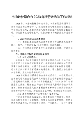 市油地校融合办2023年度行政执法工作总结2023年,市油地校融合办在市委、市政府的正确领导下,在市司法局的正确指导下,深化巩固油气管道安全专项整治三年行动工作成果,压茬开展油气管道安全生产系列综合整治行动,切实提高执法管理水平。现将2023年行政执法工作总结如下。一、2023年行政执法基本情况(一)本部门办理行政执法案件0件(作出执法决定案件数),其中,行政许可0,行政处罚0,行政强制0。(二)作出执法决定的案件引起行政复议0件、行政诉讼案件数0。二、开展执法规范化建设有关情况(一)制度建设情况。持续推进《东营市石油天然气管道保护办法》立法工作,充分研究上位法和省级政策规定,全面总结提炼我市油气管道管理工作经验做法,梳理工作中存在的制约因素和困难问题,赴甘肃兰州对标学习管道保护先进经验,通过整理立法依据和参考资料,完成办法草稿起草工作。2023年定期组织召开专委会全体成员会议、市办党组会议、全市油气管道安全专题会议及时传达落实省委省政府安全生产工作视频会议精神,推动十五条硬措施八抓20条创新措施落实落地。制定2023年度领导干部油气管道安全生产职责清单,督促管道企业完善双重预防体系和制修订全员安全生产责任清单并执行落实,加强安全总监考核,推动安全责任落实。(二)落实行政执法三项制度有关情况。一是为推行行政执法公示,我办重点对行政许可、处罚、行政强制等进行了全面梳理,明确了执法依据和权限,绘制了执法程序流程图。对权力责任清单、双随机、一公开监管情况、执法活动的具体要求等相关执法信息进行公示。充分利用东营市人民政府门户网站,按照信息公开管理的规定对政务公开、执法情况等实行全面公示,并实行动态管理与更新。二是通过完善执法档案卷管理制度、本部门记录信息调阅监督制度等各类行政执法全过程记录具体办法,完善执法信息采集、存储、分析、归档等规范化建设制度。推行执法文书电子化,明确执法案卷标准,确保执法文书和案卷完整准确。(三)行政执法人员培训情况。2023年度组织油气管道保护和完整性管理培训班,全市各级油气管道安全生产执法人员、管道企业管道保护业务骨干共80余人参加培训,全面提高油气管道安全管理人员业务素质;7月19日,举办东营市油气管道安全生产执法人员专题培训班,共30余人参加培训,对《全市重大事故隐患排查整治2023行动实施方案》进行了系统化、精细化的解读,并聘请市油气管道专家库专家对XXXXXX关于安全生产重要论述进一步深挖宣讲。通过培训有效提升了综合执法人员的法治理念、法治思维和执法水平。(四)行政检查实施情况。一是部署开展岁末年初安全生产重大隐患专项整治、规范提升年、春季安全生产督导检查、五一安全专项检查、重大事故隐患专项排查整治2023行动等专项行动,开展市县联合执法检查,创新一隐患一延伸执法检查机制,采取查阅台账、人员询问、应知应会考察、现场演练(示)等多种方式,实现25家管道运营企业执法检查全覆盖,累计派出执法人员136人次,聘请专家48人次,排查问题隐患402项,全部整改完成。二是做好汛期油气管道保护工作,开展汛前风险隐患拉网式排查,建立清单台账,对已排查发现的19项问题隐患全程跟踪管理,整改一项、验收一项,实现闭环管理、动态清零。三、行政执法存在的突出问题(一)关于人员能力水平方面。一是运用新理论指导新实践的引领力还有待加强。与法治工作的融合度还须进一步强化,尤其是在运用法治思维和方法提升行政执法模式的创新本领还需再提高。二是执法人员的能力短板还需要进一步补齐。部分执法人员对新颖,疑难,复杂、要案等方面,履行法定程序还有不到位,研究还不深入。三是综合执法队伍承接能力有待提高。面对较多的执法事项,执法队伍虽已开展了一些培训,但由于还处在磨合期,部分执法人员在办案技巧、法律法规运用上有所不足,在执法能力方面还存在短板,与高质量开展执法工作和群众期望仍有一定差距。(二)关于监管执法方面。监管执法一体协同有待进一步强化,部分衔接还不够顺畅高效,多跨协同的监管执法链路没有完全闭合。四、下一步工作打算(一)持续深化风险隐患双重预防体系。进一步压实管道企业安全生产主体责任,加强安全风险管控,强化高后果区联防联控;开展管道定期检验检测,及时消除安全隐患。推进胜利油田天然气销售公司埕孤东广输气管道更新改造。(二)加强油气管道安全生产执法。强化部门协同联动,联合市场监管、公安等部门,综合运用四不两直明查暗访、异地交叉执法等方式,加大执法力度,严厉打击打孔盗油等危害管道安全的违法行为。(三)加大巡护力度和第三方施工管理。督导管道企业严格落实巡护制度,提高巡护频次,及时发现制止第三方施工,实现占压等外部隐患零增长。