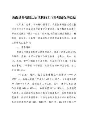 衡南县易地搬迁后续扶持工作开展情况的总结近年来,在省、市的精心指导下,我县把易地搬迁后续扶持工作作为乡村振兴工作的重中之重来抓,着力解决易地搬迁群众就近就业最后一公里的问题,确保搬迁群众搬得出、稳得住、能就业、能致富,实现巩固脱贫攻坚成果的目标,现将工作情况汇报如下:一、基本情况衡南县因地处南岳衡山之南而得名,隶属于湖南省衡阳市,与雁峰、蒸湘、珠晖和石鼓四个城区相连,与衡山、衡东、安仁、耒阳、常宁和衡阳8个县为邻,全县辖20个乡镇、3个街道办事处,375个村71个社区,总面积为2619平方公里,总人口为113万人。十三五期间,我县共有建档立卡贫困户19342户55291人;易地扶贫搬迁任务为2085户6100人,住房建设面积为152500平方米,总投资为3.8亿元,其中:集中安置点38个共安置1480户4270人,分散安置605户1830人。全县搬迁入住率、基础设施与基本公共服务设施覆盖率、后续帮扶措施覆盖率、应拆旧房拆除率、旧房宅基地复垦复绿率和搬迁群众累计脱贫率均达到100%,2018年、2019年、2020年连续三年经省易地扶贫搬迁工作年度考核,我县被评为易地扶贫搬迁工作优秀县,排全省第一方阵。我县发改局荣获全国十三五时期易地扶贫搬迁工作担当有为先进集体。二、工作开展情况(一)易地搬迁后续扶持工作开展情况一是加强领导夯实工作责任。为确保我县易地扶贫安置点2085户6100人实现稳得住、有就业、逐步能致富目标,县委县政府高度重视易地搬迁后续扶持工作,县党政主要领导切实履行易地扶贫搬迁工作第一责任人职责,成立了衡南县易地扶贫搬迁后续扶持工作领导小组办公室,专门负责全县易地扶贫搬迁后续扶持工作的统筹协调和扶持工作。其中县发改局负责易地扶贫搬迁工程项目及搬迁入住情况监管;县乡村振兴局负责提供搬迁建档立卡贫困人口的基本信息;县人社局负责搬迁人员职业技能培训、农村贫困劳动力就业信息平台信息录入和就业信息监测平台动态更新;县财政局负责保障落实就业扶持政策所需的资金以及安置区开展就业帮扶工作经费。县委、县政府主要领导及分管领导亲自谋划后续扶持工作,经常召开专题会议听取工作进展情况汇报,安排部署重点工作任务,大力推进工作落实,结合我县实际,以搬迁群众务工就业、产业发展和社区(村)管理等方面为重点深入研究制定行之有效、可操作性强的长效机制,适时印发工作方案、任务通知、督查检查等文件,指导推进后扶工作有序开展,保持政策不松动、力量不减弱、工作不断档,全县易地扶贫搬迁后续扶持各相关责任部门牢固树立一盘棋思想,主动入位,各司其责,协作配合,形成完善的帮扶体系,全力推动工作顺利开展。二是织牢组织建设网强化根基。充分发挥易地扶贫搬迁安置点党组织的战斗堡垒作用和党员先锋模范作用,以社区(村)基层党组织建设为主线,全力织牢组织建设保障网。全县38个易地扶贫搬迁安置点共搬迁入住4270人,每个安置点成立党小组,党小组长由群众党员推选,统一纳入社区(村)部管理,确保基层党建工作更好地融入搬迁、服务居民、推动发展。三是政策资金保障助力产业发展。我县制定出台了《衡南县易地扶贫搬迁持续扶持工作实施方案》、《衡南县2019年度产业扶贫工作方案》、《衡南县2019年度产业扶贫奖补方案》对各级各部门的责任进行了明确。县委、县政府对100人以上集中安置点委派第一书记和工作队实行定点帮扶,财政支持60万元,相继在易地扶贫搬迁集中安置点设置公益性岗位100个,优先安排搬迁户上岗。2017年至2022年期间,平均每年约投入240万元注入企业发展产业,对易地扶贫搬迁对象实行全覆盖产业帮扶和效益分红,在全县选择了20家有信誉的龙头企业作为易地扶贫搬迁对象投资入股分红企业,实行产业扶贫,按人平1500元的标准,分5年每年300元/人投资到企业。参与产业扶贫企业连续五年按照不低于450元/人/年的标准,给贫困人口发放分红款。除22名贫困人口实行生态补偿扶贫、484名实行兜底扶贫外,县财政投入产业帮扶资金840万元,对5594名贫困人口实行产业委托帮扶,确保了全县易地搬迁户实现全覆盖帮扶。同时,各乡镇(街道)因地制宜制定了易地扶贫后续帮扶措施,实行一户一策,在有条件的集中安置点建立了扶贫车间和蔬菜大棚。如花桥镇集中安置点安排有劳动能力的贫困户进入电子产业扶贫车间工作,进厂务工贫困户年收入可达到2万多元;栗江镇集中安置点依托湖南衡南绿贝生物科技有限公司安排30名有劳动能力的贫困户到公司参加油茶管护工作,每户可增加6000元以上的收入;三塘镇兴隆安置点紧邻工业园区,安排搬迁对象进入合适的企业务工。一些乡镇在集中安置点附近村组租赁稻田或旱土,按每户1分土地面积标准,分给搬迁户种植蔬菜,减轻搬迁户生活开支。加大物业、绿化、保洁等社会公益性岗位开发力度,确保每户有劳动能