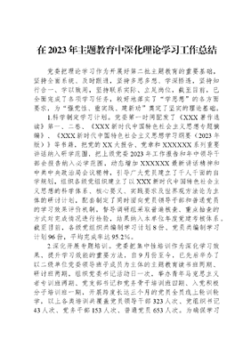 在2023年主题教育中深化理论学习工作总结党委把理论学习作为开展好第二批主题教育的重要基础,坚持全面系统、及时跟进,坚持多思多想、学深悟透,坚持知行合一、学以致用,坚持联系实际、立足岗位,截至目前,已全面完成了各项学习任务,较好地落实了学思想的各方面要求,为强党性、重实践、建新功奠定了坚实的理论基础。1.科学制定学习计划。党委第一时间配发了《XXX著作选读》第一、二卷、《XXX新时代中国特色社会主义思想专题摘编》、《XXX新时代中国特色社会主义思想学习纲要(2023年版)》等书籍,把党的XX大报告、党章和XXXXXX系列重要讲话纳入研学范围,把上级党委2023年工作报告和年中领导干部会报告纳入必学范围,动态增加XXXXXX最新讲话精神和中共中央政治局会议精神,引导广大党员建立了千人千面的自学规划,组织各级党组织建立了以XXX新时代中国特色社会主义思想的科学体系、核心要义、实践要求及世界观方法论为主体的研讨计划,配套制定了同时面向党员领导干部和普通党员的学习效果评价机制,督导调研组采取普遍核查、重点抽查的方式对完成情况进行检验,结果纳入本单位年度党建考核体系。截至目前,各级党组织共编制学习计划8份、党员共编制学习计划96份,平均完成率达95.2%。2.深化开展专题培训。党委把集中性培训作为深化学习效果、提升学习效能的重要方法,自9月份至今,已先后举办了以二级单位党委领导班子成员为主体的主题教育读书班两期、研讨班两期,组织党委书记活动日一次,举办青年马克思主义者专训班两期、党支部书记和党务骨干培训班四期、入党积极分子培训班一期,开展跨度长达三个月的党员全员线上轮训轮学,以上各类培训共覆盖党员领导干部323人次、党组织书记43人次、党务干部153人次、普通党员653人次。为确保学习效果,建立了训前征集学习难点、训中组织研讨答疑、训后进行课程评价的工作机制,先后聘请中央党校专家4人、省级及市级党校教授8人、基层党建实践专家12人,共有《党的创新理论立场观点方法实用途径》等3个课件并学员评为最有价值课件,共有11个课程创新开展了互动演练、模拟答辩等行动学习方法,学员满意率超九成,达到党的十八大以来最好水平。3.统筹安排集中学习。党委早在第二批主题教育启动之前,就对党的十九大以来本单位开展政治理论学习的总体情况进行了全面梳理,明确了9个重点课题和12个薄弱点;结合第一批主题教育实际效果,建立了16个学习辅导包。作为今年七一活动中最重要的内容,组织第二批单位参加了第一批主题教育学习成果分享会,并在8月份组织了3次预热式学习。截至目前,8个基层党委已开展理论学习中心组学习36次,以党支部党员大会为主要形式的集中学习26次,共有12名党员领导干部在分管单位和党组织关系所在支部讲了专题党课,基层单位自发开展大学习大讨论活动24次、组建学习小组35个、开展学习沙龙13次,党委适时组织了以检验学习成效为目的的党课竞赛、征文比赛、讲故事比赛、微视频征集大赛,各级党组织以主题党日为主要形式组织党员参观红色教育基地现场教学16次,组织观看《志愿军》等红色影片7场次,不断掀起学习热潮。4.聚焦形成学习成果。党委十分注重学习成果的形成和转化,在各类学习活动中着力强化交流研讨实效,相应建立了党的创新理论与本单位高质量发展融合途径提醒单机制、逐级辅导机制和命题反馈机制。自主题教育启动至今,两级党委中心组在内网平台及报刊简报上共刊发署名文章15篇、党组织书记署名文章8篇,共收集各类研讨意见57条,涉及发展战略、生产经营、质量安全、两金压控、干部人才、党建工作等6个方面,经深度梳理,共有26条意见中反映的问题被纳入主题教育整改清单,另有31条意见直接反馈给各职能部门统筹落实,相应修改制度机制8个、新建制度3个、优化流程12个,极大地提升了管理效能和生产效率。党委将重点工程的推进情况作为检验学习成果的终极标准,在8月份召开的工程建设推进会上,专门安排出一天的时间以中国式现代化的核心理念为切入点探讨确保按期完工的新思路与新方法,得到了上级党组织的高度肯定。5.做实群众宣讲宣教。党委在组织党员干部开展党的创新理论学习过程中,持续开展面向员工群众的宣讲宣教活动,分别在8月、9月、10月举办了三场由全体员工参加的党的创新理论宣贯会。为进一步调动员工群众主动参与的积极性,组织挖掘了6个先进典型事迹和3个负面案例,以接地气、大白话的方式分层级开展了对标学习活动7次,召开警示大会5场,为后期专题民主生活会和专题组织生活会的召开奠定了基础。深化党员与群众结对子帮扶活动的内涵,将帮学、助学作为党员考评的重要依据,以点带面,逐渐形成了全员共学的格局。深化党员领导干部三联责任点,除固有的联系机制外,面向普通员工进一步明确了解思想难题、解发展难题、解业务难题的职责拓展,截至