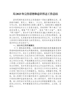 局2023年宣传思想和意识形态工作总结宣传思想和意识形态工作是党的一项极为重要的工作,承担着举旗帜、聚民心、育新人、兴文化、展形象的使命任务。今年以来,在区委宣传部门的精心指导下,我局坚持以XXX新时代中国特色社会主义思想为指导,深刻领悟两个确立的决定性意义,增强四个意识、坚定四个自信、做到两个维护,紧扣学习宣传贯彻党的XX大精神这条主线,结合学习贯彻XXX新时代中国特色社会主义思想主题教育,落实主体责任,扎实做好宣传思想和意识形态工作,为全局各项工作顺利开展提供强有力的思想保证。现将本年度宣传思想和意识形态工作总结如下:一、2023年工作开展情况(一)强化组织领导,以高度的责任感和使命感推动宣传思想和意识形态各项工作落到实处。我局高度重视宣传思想和意识形态工作,成立了主要领导为组长,其他班子成员任副组长,各科室负责人为成员的专门领导机构,持续常态化抓实抓好宣传思想和意识形态工作,实现了宣传思想和意识形态与业务工作齐头并进;严格按照意识形态工作责任制要求,每月至少开展1次党组中心组政治理论学习、每季度进行意识形态工作分析研判、每半年进行意识形态工作总结和研讨会,定期对本领域宣传思想和意识形态、意识形态工作进行分析研判,真正实现了意识形态工作的制度化、规范化;加强督导考核,明确将宣传思想和意识形态和意识形态工作纳入全年工作绩效考核,纳入党建工作责任制和党委中心组理论学习计划,纳入执行党的纪律和监督检查内容,纳入领导班子、领导干部目标管理,纳入领导班子成员民主生活会和述职报告重要议程,全面压实主体责任,牢牢掌握意识形态工作的领导权、主动权、话语权。(二)狠抓理论学习,通过深化理论武装推动宣传思想和意识形态工作走深走实。真抓实干把理论学习做实。结合第二批主题教育,局党组和各支部制定学习计划,严格按照学习计划完成每月的政治理论学习,做到全覆盖。全年开展中心组集体学习35次,集体学习研讨9次,其中主题教育专题学习研讨6次,党总支书记和各支部书记讲党课5次。创新形式把理论宣教做亮。紧密结合学习贯彻XXX新时代中国特色社会主义思想主题教育和三抓三促行动,扎实开展党的XX大精神、思想要提升我该懂什么等专题讲座,不断筑牢干部职工理论根基,引导党员干部进一步坚定理想信念,为做好各项工作奠定坚实的理论基础。全年共组织开展专题宣讲12场次,受教育人数1200余人次。充分发挥单位职责职能,深入社区、村镇、单位开展政策宣讲,为干部群众讲本领域各项政策、法律法规,解答疑惑,不断提升理论宣讲的广度和深度。全年开展各类政策法规宣讲24场次,受教育人数4500余人次。丰富载体把理论研究做响。将信息宣传成效纳入单位考核,激发信息宣传员工作积极性,不断提高宣传质量,把本领域本单位工作成效宣传出去。全年在各类媒体发布信息350条,被采用320条;发布网评信息120条,党建工作信息210条。(三)注重舆论引导,通过分享经验做法做好政策解读抓好正面宣传。抓好思想引领。坚持用XXX新时代中国特色社会主义思想武装头脑,巩固和加强理想信念教育,积极培育和践行社会主义核心价值观,深化理论教育和党性教育。注意发现先进典型,为广大干部职工树立学习榜样,指明前进方向,并以先进典型的模范事迹和崇高精神来宣传群众、组织群众,探索完善先进模范发挥作用的长效机制。加强思想教育,树立良好的职业道德与精神,树立规范的行为意识,提升工作能力,通过党建活动、工会组织活动等拿出具体举措,让干部职工产生归宿感,产生积极向上的感恩心态,激发爱岗敬业的潜能。抓好信息宣传。结合年度信息考核指标任务,年初制定涵盖党委信息、党建信息、政务信息、纪检监察信息、文明创建信息等信息任务的专项信息责任清单,并明确每一个专项信息的具体责任人、月度或季度报送数量要求以及刊登数量要求,做到千斤重担人人挑,人人头上有指标。全年通过各类信息媒体渠道发布信息430条。强化阵地管理,确保信息质量,严格执行三审三校制度,做到不审不发,先审后发,严把文字关、数字关、逻辑关,层层压实、压紧审核责任,确保信息发布真实、准确、合法。建立信息宣传工作督查考核机制,形成主要领导亲自抓、分管领导重点抓、专职人员具体抓的工作模式。将信息宣传工作纳入干部月度量化考核,每月安排专人对信息工作完成情况进行专项审核,并按照量化考核办法,兑现加减分。对连续两个月未完成信息任务的,由分管主任约谈,连续三个月未完成信息任务的,由主要负责人约谈,并进行加倍考核扣分。(四)强化考核督查,通过合理运用考核激励奖惩制度推动长效监管。围绕宣传思想和意识形态工作考核指标内容,明晰工作重点,把宣传思想和意识形态工作与经济建设社会发展一同谋划、一同部署、一同落实、一同考核,形成齐抓共管、相互推进、相得益彰的良好局面。完善工作监督机制,针对考