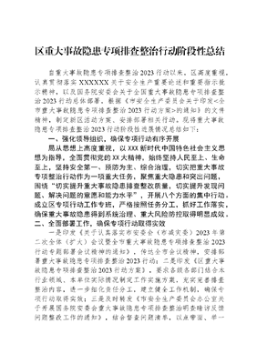 区重大事故隐患专项排查整治行动阶段性总结自重大事故隐患专项排查整治2023行动以来,区高度重视,认真贯彻落实XXXXXX关于安全生产重要论述和重要指示批示精神,以及国务院安委会关于全国重大事故隐患专项排查整治2023行动总体部署,根据《市安全生产委员会关于印发<全市重大事故隐患专项排查整治2023行动方案>的通知》的文件精神,制定新区活动方案、安排部署相关行动。现将重大事故隐患专项排查整治2023行动阶段性进展情况总结如下:一、强化领导组织,确保专项行动有序开展局从思想上高度重视,以XXX新时代中国特色社会主义思想为指导,全面贯彻党的XX大精神,始终坚持人民至上、生命至上,坚持安全第一、预防为主、综合治理,切实把重大事故专项整治行动作为一项重大任务,聚焦重大隐患和突出问题,围绕切实提升重大事故隐患排查整改质量,切实提升发现问题、解决问题的意愿和能力水平,开展八个方面的集中行动。成立区专项行动工作专班,严格按照任务分工,抓好工作落实,确保重大事故隐患得到系统治理、重大风险防控取得明显成效。二、全面部署工作,确保专项行动取得实效一是印发《关于认真落实市安委会(市减灾委)2023年第二次全体(扩大)会议暨全市重大事故隐患专项排查整治2023行动专题部署会议精神的通知》,传达全市会议精神,安排部署重大事故隐患专项排查整治2023行动;二是印发《区重大事故隐患专项排查整治2023行动方案》,要求各级各部门结合本行业领域、本单位实际情况制定工作实施方案,充实完善排查整治内容,进一步细化责任分工,建立健全工作机制,确保专项行动取得实效;三是及时转发《市安全生产委员会办公室关于开展国务院安委会重大事故隐患专项排查整治明查暗访反馈问题整改工作的通知》,结合督查问题清单,以点带面、举一反三,紧紧围绕八大行动工作要求,督促各级各部门各单位根据实际情况开展自查自纠,确保重大事故隐患专项排查整治行动取得实效。三、成立互助联盟,确保共性隐患及时消除区局统筹建立区成立工业企业、商贸企业、危化(城燃)企业安全生产互助联盟。该联盟根据不同组别企业特征,按照地域相邻、行业相近、规模相当、务实管用原则,对辖区企业分类分组,不同组别企业围绕行业特征开展互助检查,制定互助检查要点及检查表,采取互助组集中检查或分小组实地检查方式,紧盯危大工程项目等重点领域、关键环节、重点工艺企业现场,定期组织开展交叉互助检查。共计发现问题隐患10处,均已整改完毕。其中:工业企业互助联盟共计组织开展检查企业10家次,查出隐患10处;商贸企业安全互助联盟共发现安全隐患10处;危化(城燃)企业安全生产互助联盟共发现问题和隐患10个。通过建立互助联盟平台,进一步提升了企业自主管理能力水平和安全隐患排查治理能力,有效推动了整体安全生产管理水平提档升级。四、强化推进885,确保隐患排查不留死角区结合885工作,聚焦危险化学品、交通运输、建筑施工、燃气、消防等重点领域,兼顾新业态新领域开展风险隐患拉网式摸排、研判全面排查,对发现的重大事故隐患做到立即发现、立即整改,坚决不留盲区死角,确保安全隐患消除在萌芽状态。累计抽查检查企业3000家,帮扶指导重点企业500家,曝光、约谈、联合惩戒企业20家,行政处罚1500次,经济处罚300万元。发现重大隐患50条(已挂牌2条),已整改50条。五、紧盯重点领域,确保专项行动走深走实(一)建设领域印发《区房屋市政工程重大事故隐患专项排查整治2023行动方案的通知》,将重大事故隐患排查整治工作与日常检查工作相结合。截至目前,区未发现城乡内涝辖区8栋自建房存在安全隐患,其中隐患房屋4栋、房屋3栋.目前,8栋存在安全隐患的自建房已完成检测鉴定,并制定自建房隐患整治一栋一策。(二)消防领域聚焦易燃可燃保温材料和装饰装修、消防设施设备、生命通道管理等重点整治内容,深入开展防火检查,全面摸排重大事故隐患,严格实施一案一策清单化整治。安排专人指导新增挂牌重大火灾隐患单位制定整改方案,落实整改资金,督促其在整改期间加强火灾防控措施和应急处理工作,确保整改工作按时整改完成。截至目前,检查单位600家次,发现并督促整改火灾隐患300处,下发责令改正通知书200份,下发行政处罚决定书66份,下发临时查封决定书5份,罚款25万元。(三)工贸领域印发《关于印发区经信领域重大事故隐患专项排查整治2023行动方案的通知》,对照回头看重点排查内容,梳理排查隐患,全面开展治理,做到措施、责任、资金、时限和预案五落实,确保隐患闭环销号。截至目前,共开展执法200次,排查燃气非居用户4000户,发现隐患2500个,已整改1633个。其中,管道及设施排查隐患数量780个,完成整改数量450个;燃气具排查隐患数量350个,完成整改数量205个;安全装置排查隐患数量6