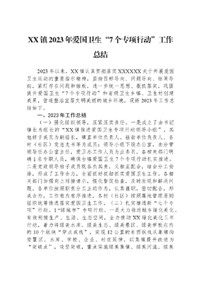 XX镇2023年爱国卫生7个专项行动工作总结2023年以来,XX镇认真贯彻落实XXXXXX关于开展爱国卫生运动的重要指示精神,坚持目标导向、问题导向、结果导向,紧盯存在问题和短板,进一步统一思想、狠抓落实,巩固提升爱国卫生7个专项行动和省级卫生乡镇、卫生村创建成果,营造整洁宜居文明美丽的城乡环境,现将2023年工作总结如下。一、2023年工作总结(一)强化组织领导,压紧压实责任。一是成立了由书记镇长为组长的XX镇推进爱国卫生专项行动领导小组,其他班子成员为副组长,镇直单位负责人、驻翁单位负责人、各村(社区)党总支书等为成员;领导小组下设办公室,由分管领导任办公室主任,爱卫办工作人员为业务员,各相关部门明确1名专职人员,确保全镇爱国卫生7个专项行动扎实推进。二是党政领导班子成员既各负其责,又相互配合,结合分工安排,形成了工作合力,全面抓好抓细抓实爱国卫生工作。各相关部门加强向上对接请示,强化督促检查,及时发现和解决问题。各单位按照职责分工主动作为,认真履职,密切配合,形成合力,工作有力有序推进,各村(社区)按照属地管理原则组织统筹推进落实爱国卫生工作。(二)扎实推进新七个专项行动。1.绿城市专项行动。一是大力推进城乡绿化美化。有效衔接生产、生活、生态空间,全力推动XX绿化美化三年行动,着力将绿美水库、绿美生态、绿美景区、绿美学校在内的10个版块穿点成线,实现12公里的东西纵线从集镇向安置区、水库、学校、企业、村庄延伸,以集镇提升改造为突破点,攻坚突破,重点实施绿美集镇、绿美河流、绿美企业,利用集镇空闲土地种植万寿菊,补植更换绿化树木,通过种植草坪、水杉等植物,对邑林河(XX段)集镇周边范围河堤进行绿化美化1公里,在遐尔茶厂周边空闲土地种植草坪、茶树。二是各村(社区)开展乡村绿化美化行动。大明湖生态旅游区景区绿化美化工程建设开工,计划完成总绿化面积800平方米;明山村完小绿美校园建设已基本完工,预计完成总绿化面积800平方米;绿美公路全部完成建设,明山水库绿美水库建设进入扫尾阶段。以XXX村提质增效为着力点,实现推门见绿,对XXX、外寨村民小组进行统一规划,重点打造绿美节点2个,摊笆山村民小组为示范点,采取见缝插绿措施,组织全体村民因地制宜种植植物花卉。对3公里XX-XXX公路进行绿化美化,形成路侧带状绿化美化景观。同时,把公共绿地、道路绿地、庭院绿化等内容纳入到乡村绿化美化行动,不断提高村内绿地覆盖率。2.治污染专项行动。一是深入实施生态环境建设、生态环境突出问题整治三年行动,打好蓝天、碧水、净土保卫战。抓好污水治理,全面消除黑臭水体。开展垃圾分类工作,集镇区全面推行生活垃圾分类投放、收集、运输和处置工作,健全垃圾分类体系,实现生活垃圾分类全覆盖。二是开展集镇建成区爱国卫生整治。各单位按照包保负责区域落实周一、周四保洁日制度,在全镇范围内开展集镇环境卫生整治工作,紧紧围绕对道路、街道、巷道,特别是背街小巷等路段环境卫生和容貌进行整治,清除道路及两侧垃圾、杂物、积尘、杂草、建筑残渣等。开展绿化带、河道、沟渠爱国卫生整治,落实河湖长制,加强日常监管。加强镇辖区内重点河流、水库、水塘、涵洞和水源点等日常监管,严厉查处违法排污行为及向河道乱丢、乱倒垃圾行为,加强畜禽粪便污水直排河道问题重点治理,彻底清理非法入河排污口,遏制污水直排河道,严格控制入河排污总量,建立入河排污口长效监管机制。三是各村(社区)建立执行村庄保洁制度。实现3个100%,每个自然村都有保洁员覆盖、所有自然村都建立保洁制度、所有自然村都建立垃圾收费制度,整治非正规垃圾堆放点,开展村庄道路、小巷爱国卫生整治活动,加强日常监督管理,确保无非正规垃圾堆放点,保障非正规垃圾堆放点无反弹现象,自然村内无垃圾乱堆乱放现象,生活垃圾得到及时就地或转运处置。3.除四害专项行动。一是加强病媒生物防治监测。严格按照病媒生物监测工作要求,开展鼠、蚊、蝇、蟑螂等病媒生物密度监测,掌握密度情况,为除四害提供科学依据。二是加强统一防灭力度,完善防制设施,公共外环境设置灭鼠毒饵站,堵塞鼠洞。督促指导公共食堂、餐饮店、商场等重点单位,按标准要求完善防四害等设施,坚持环境治理为主,物理防制和科学防制相结合,降低病媒生物密度,减少疾病传播途径。三是扎实有效地开展除四害活动,在全面整治环境卫生的基础上,组织人员有计划地开展以灭蚊灭鼠为重点的消除四害活动,通过集中开展与经常性开展相结合,落实消杀措施,消除四害孳生场所,彻底清除蚊、蝇孳生场所和卫生死角,翻盆倒罐,清除积水,不乱倒乱丢垃圾,做到不漏单位、不漏居民户、不留死角,把鼠密度、蝇密度、蚊密度、蟑密度控制在国家规定的标准范围之内,科学有效地开展灭杀工作,确保降低和控制四害密度,预防