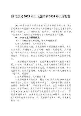 区司法局2023年工作总结和2024年工作打算2023年是全面贯彻落实党的XX大精神的开局之年,XX区司法局始终坚持以XXX新时代中国特色社会主义思想为指导,铆足兔劲,以动如脱兔的干劲、兔子蹬鹰的拼劲、玉兔探月的韧劲奋力推动司法行政事业更上一层楼。一、2023年工作开展情况(一)以政治建设为统领,旗帜鲜明讲政治1.强化政治建设,筑牢政治忠诚一是强化政治建设。局党组始终牢固坚持党的领导,通过压实责任、严明纪律、上下同建,确保党要管党、从严治党始终处于各项工作的核心地位,促进全系统干部职工的思想自觉、行动自觉,着力打造全区司法系统风清气正的政治生态。二是加强党风廉政建设。把党风廉政建设列入重要议事日程,以创建清廉机关为契机,把党风廉政建设和反腐败工作任务分解落实到每位局班子成员,做到责任主体明确、责任范围明确、责任内容明确,做到司法行政工作和党风廉政建设两不误、两促进。2.坚定理想信念,筑牢信仰之基一是不断强化理论武装。制定《XX区司法局2023年教育培训计划》,坚持党组每月一学习,组织干部职工开展政治理论每周一课,不断丰富学习方式。2023年组织党组理论中心组学习9次,党员干部职工每周集中学习35次(每季度学习XXXXXX关于全面从严治党重要论述不少于一次),开展党课辅导3次,开展党员主题党日活动10场次,开展建党102周年红色读书分享会1次,观看警示教育片2部,开展廉政教育1次。二是开展思想宣传教育。XX区司法局坚定不移推进思想宣传工作,忠诚捍卫两个确立,坚决做到两个维护,认真组织全局干部职工学习宣传贯彻党的XX大精神,党组书记亲自上台进行学习宣传贯彻党的XX大精神XX区潇湘习语理论宣讲报告会1次,同时通过宣传栏、标语、led屏幕滚动播放XX大精神内容,派出公务车在大街小巷循环广播宣传XX大精神、XXX法治思想等,做到内外部宣传全覆盖。(二)以法治思想为指引,统筹推进求实效1.全面推进依法治区召开了2023年区委全面依法治区办公室及委员会第一次会议,并讨论通过了《区委全面依法治区委员会2023年工作要点》,开展了党政主要负责人履行推进法治建设第一责任人职责现场述法工作,将党的XX大精神和XXX法治思想纳入了党委、政府理论学习中心组学习,并组织开展了法治督察与法治调研工作。2.持续规范依法行政一是严格规范性文件管理程序、非规范性文件和政府合同等审查以及相关政府信息公开工作。凡规范性文件必须完成社会风险评估、公平竞争审查、合法性审查和统一登记后方可行文,并及时向市司法局报送备案,在XX区政府网和政府公报上公布。年初以来,审查政府规范性文件14件(其中正式发布11件),备案部门规范性文件8件;完成政府重大行政决策、政府重大执法决定等非规范性文件审查任务35件(其中10件征询了政府法律顾问的意见),完成政府合同等法律事项审查任务61件(其中44件征询了政府法律顾问的意见);已编辑发行政府公报3期,及时发布和更新XX区政府网规范性文件专栏、政府公报专栏。二是持续推进行政执法三项制度。向全区各行政执法单位乡镇(街道)印发《关于进一步做好全面推行行政执法三项制度有关工作的通知》,要求各单位依托区政府门户网站、信用XX、红星云等平台在行政许可、行政处罚等六类行政执法行为中全面推行行政执法三项制度,切实规范行政执法行为。全面落实行政处罚免予处罚、减轻处罚、从轻处罚三张清单。组织XX区安全生产委员会成员单位及各乡镇(街道)480名持有效执法证件的工作人员以及34家涉及安全生产领域产企业负责人参加执法培训;落实行政执法案卷评查工作。三是深入推进行政复议工作。成立了XX区人民政府行政复议咨询委员会并制定出台《XX市XX区人民政府行政复议工作规则》和《XX市XX区行政复议咨询委员会工作规则》将行政复议工作进一步规范运行。2023年,共收到行政复议申请22件,其中撤销3件,维持6件,确认违法0件,责令履行0件,不予受理10件,驳回2件,未审结1件,且全部录入全国行政复议平台。(三)以法律服务为抓手,服务企民促发展1.助力优化法治营商环境一是以服务经济发展为导向,积极探索创新,强化在法制审核、法律服务、法治宣传、行政执法监督四个方面发挥法治的规范引领和服务保障作用,建立全链条服务体系,根据自身职责出台优化营商环境12条措施,每月25日前走访企业、区直单位、乡镇等召开优化营商环境监督月例会,为XX区经济社会持续健康发展提供优质法治保障。二是以开展千所联千企活动为契机,积极组织律师等法律志愿者深入企业进行法治体检,通过发放宣传资料、开展法治讲座、解答法律咨询等方式,对企业进行全方位的把脉问诊,指出企业经营中常见的法律问题,帮助企业防控法律风险。2.深入开展法律服务活动充分发挥律师和基层法律服务